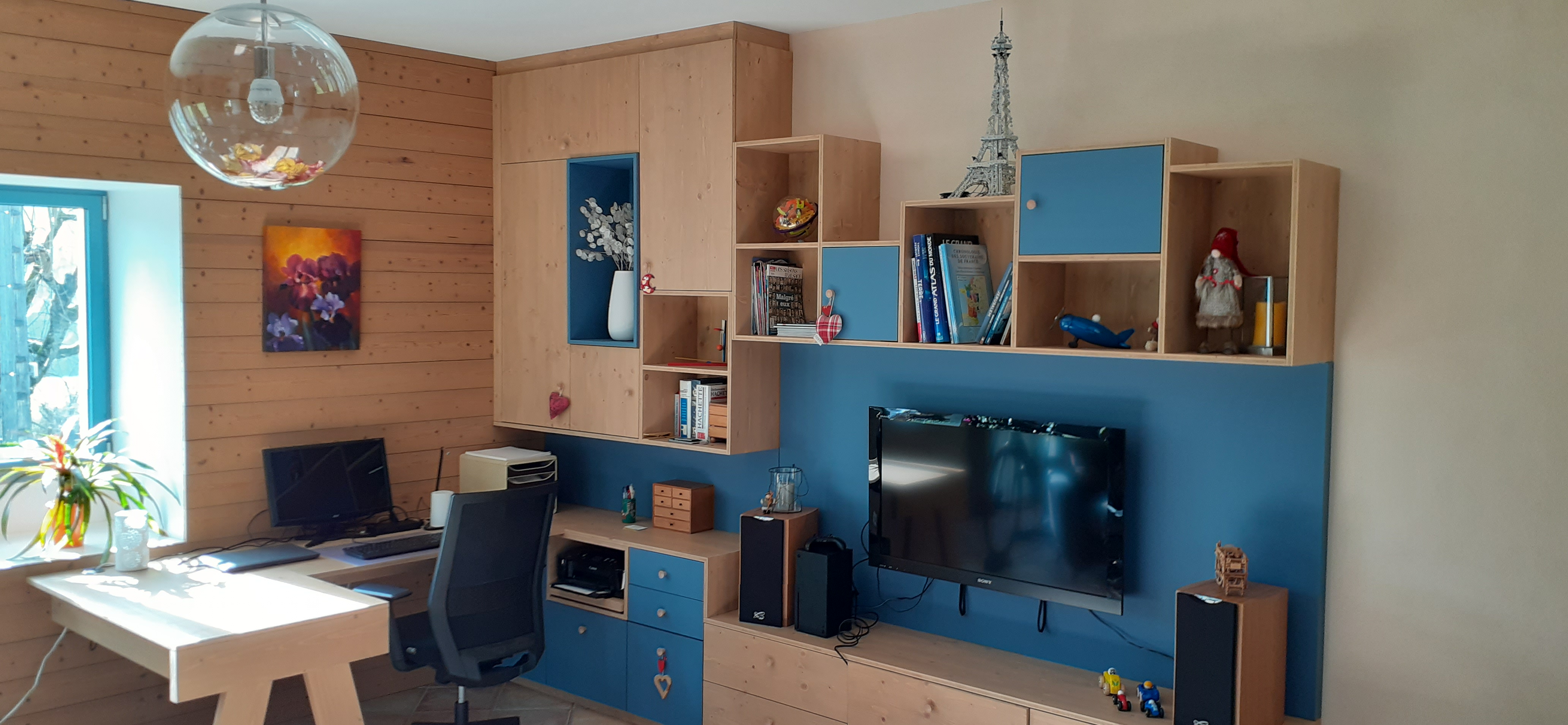 Ce projet d'aménagement de notre salon est une réussite. Nous voulions optimiser les volumes en intégrant un espace bureau/télétravail.