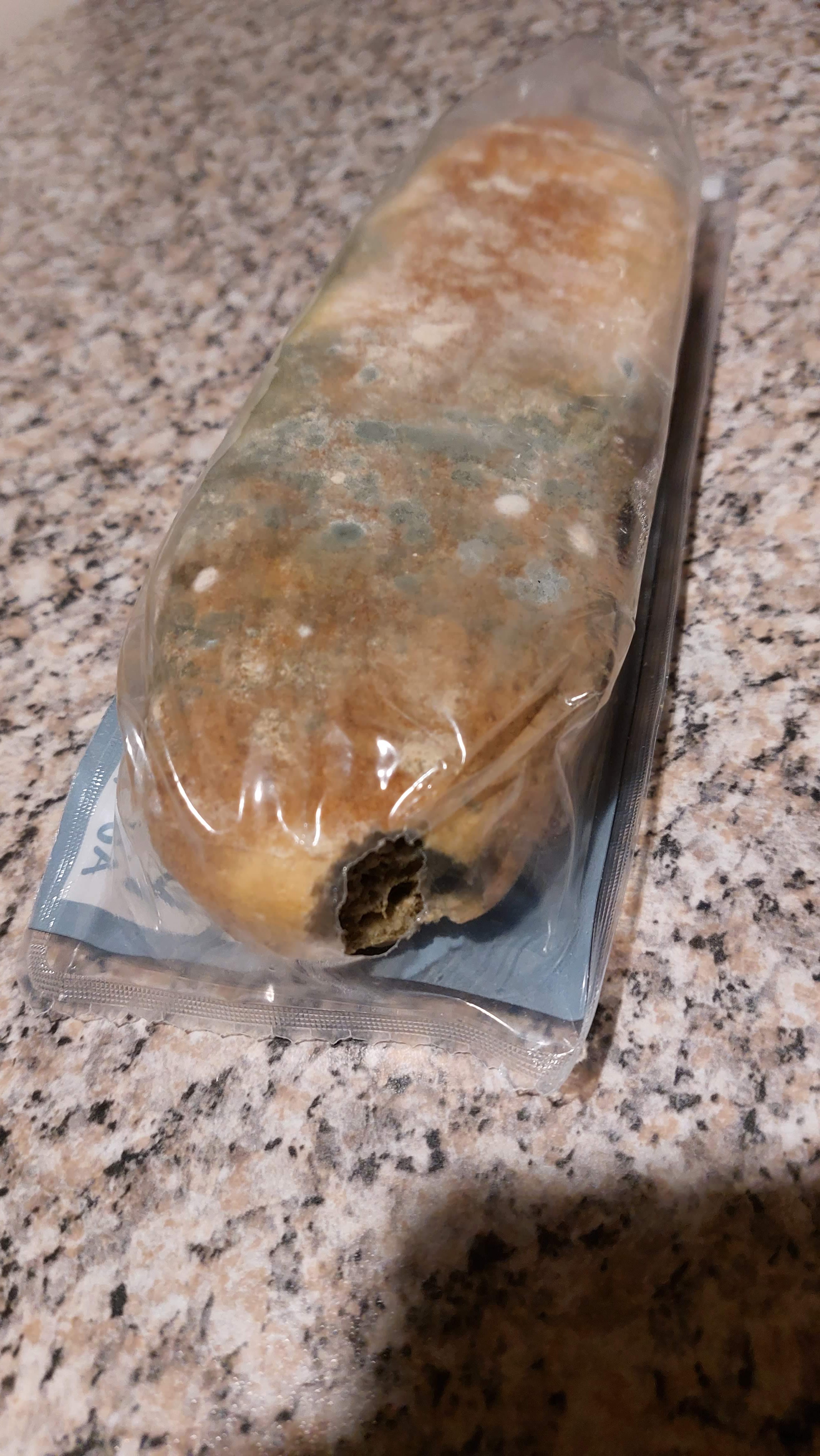 Mauvaise surprise en voulant réchauffer une baguette au four : emballage grignoté par un animal, s'en est suivi une pourrissure sur tout le pain. La date de péremption allait jusqu'en octobre. Malheureusement ce n'est pas le premier incident de ce type avec Aldi (moisissure sur un fromage acheté dans un magasin de cette même enseigne) ...