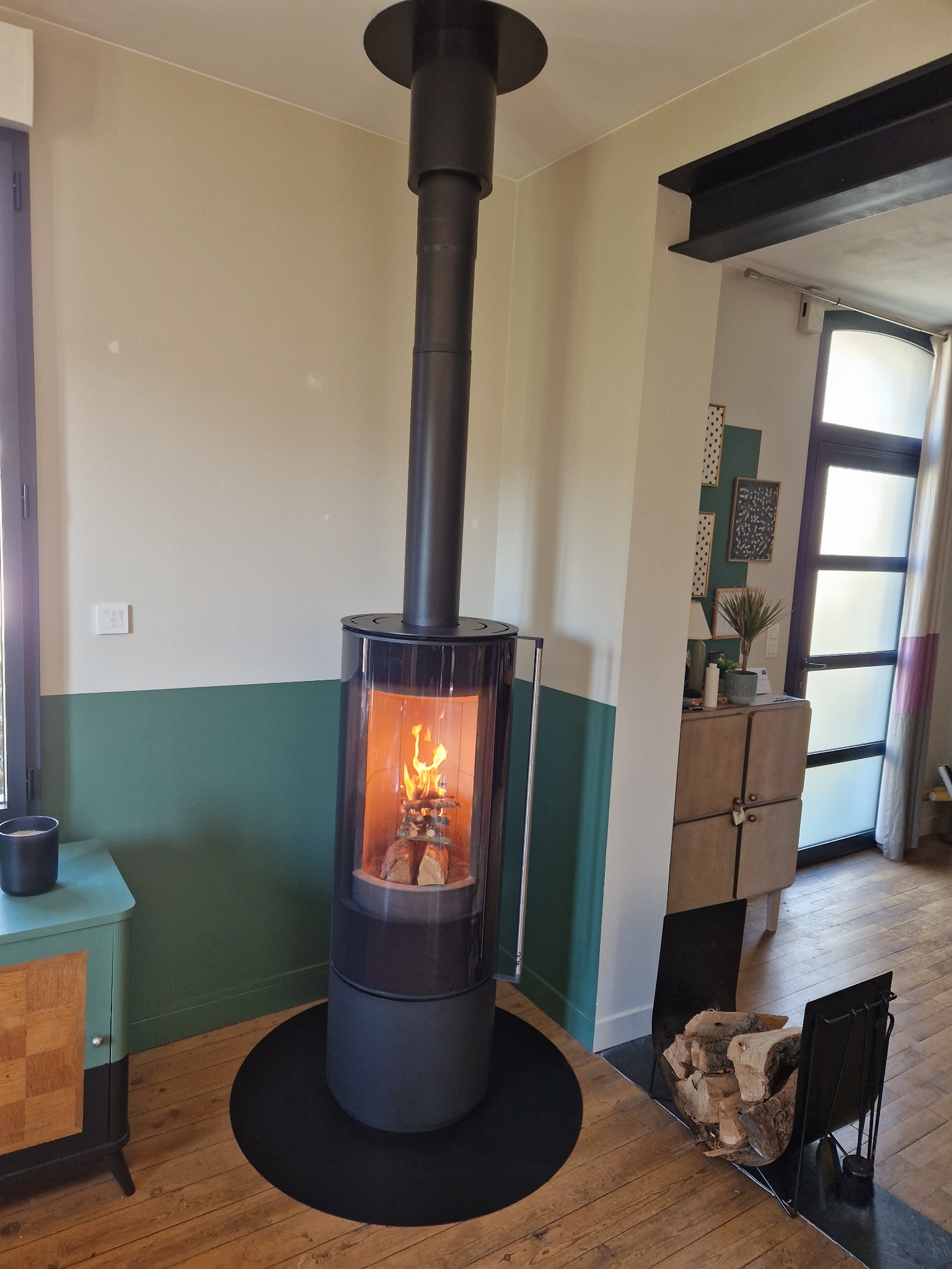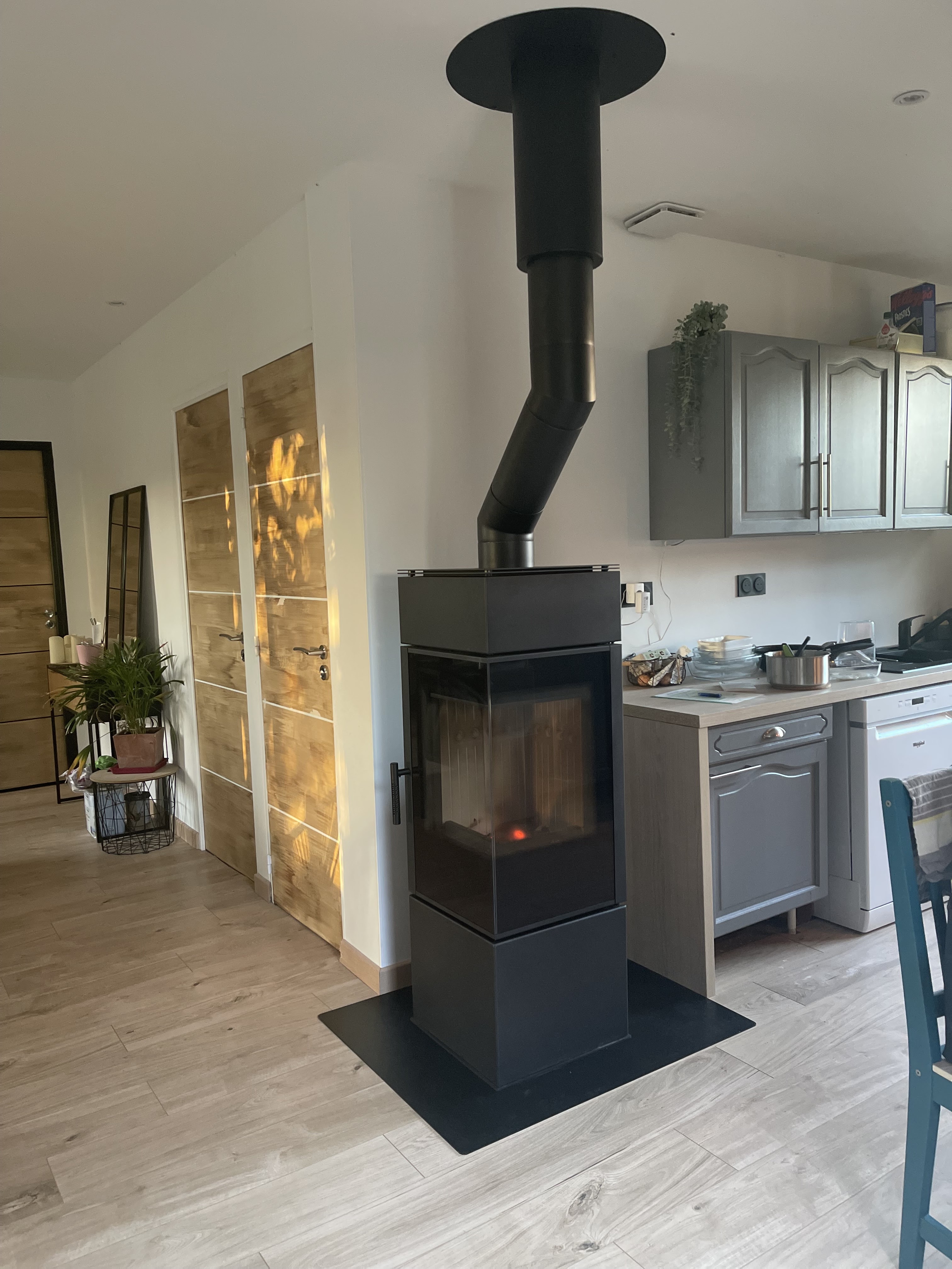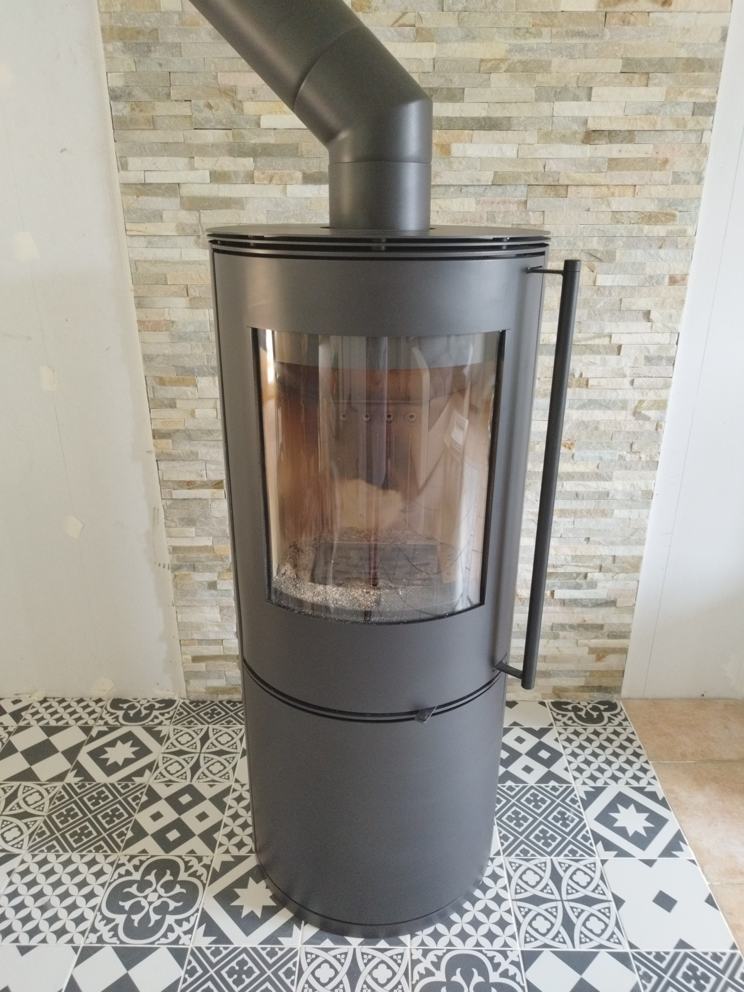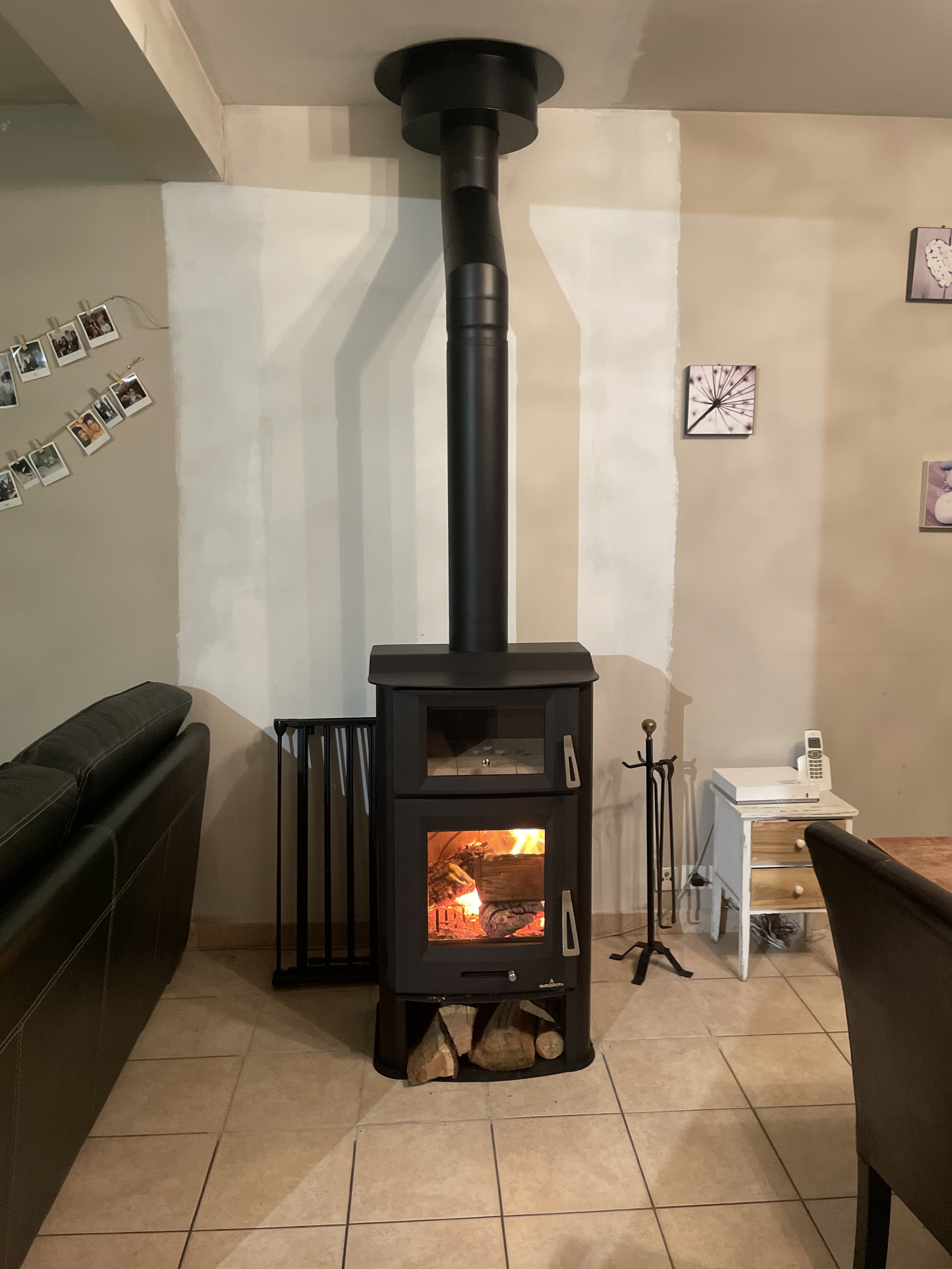 Premières flambées dans notre poêle. Un grand merci à votre équipe pour vos conseils, l’accompagnement et la pose, nous recommandons ! Et pour info déco Faïence effet bois derrière le poêle et grande plaque de carrelage noir sous le poêle