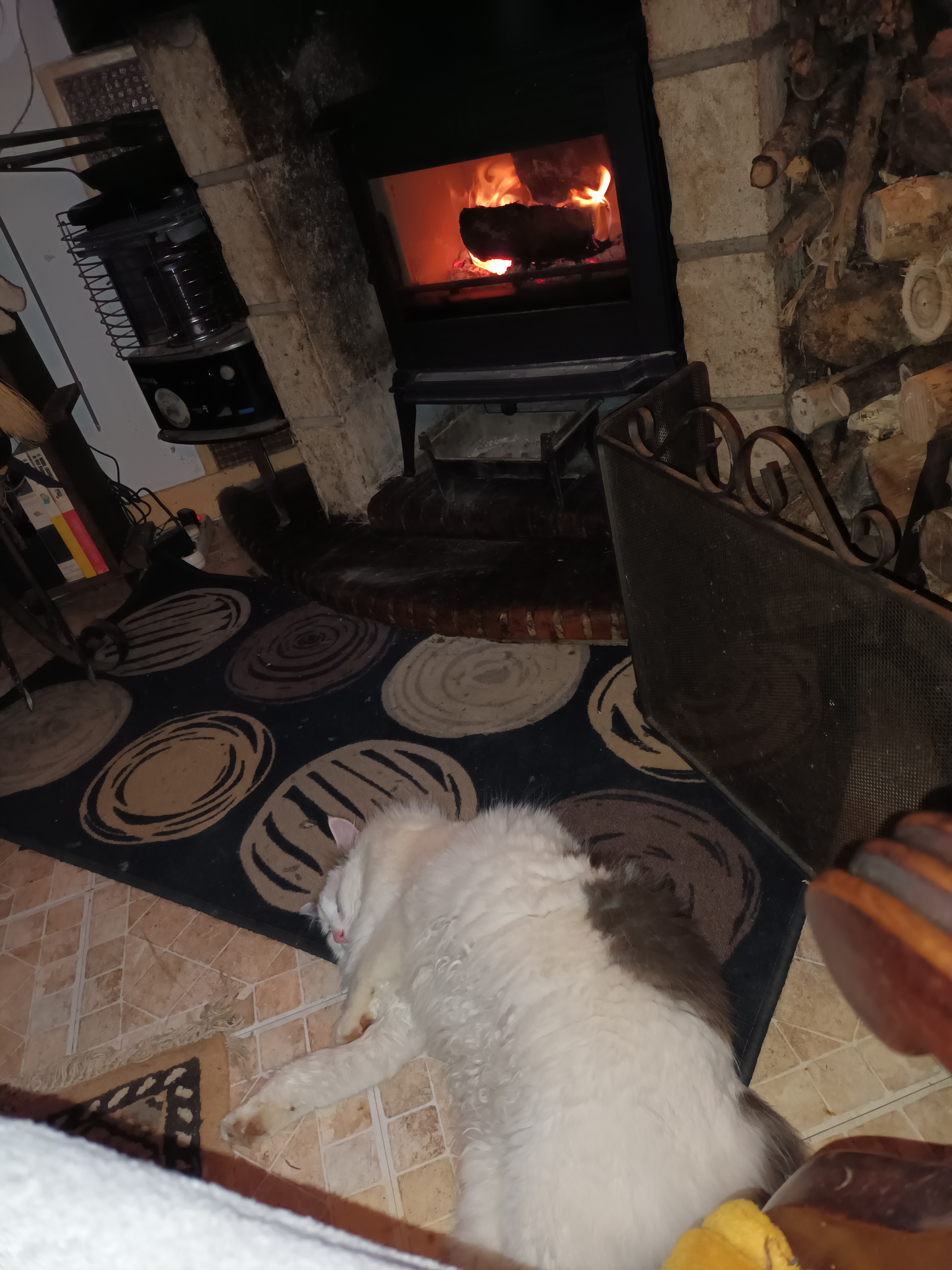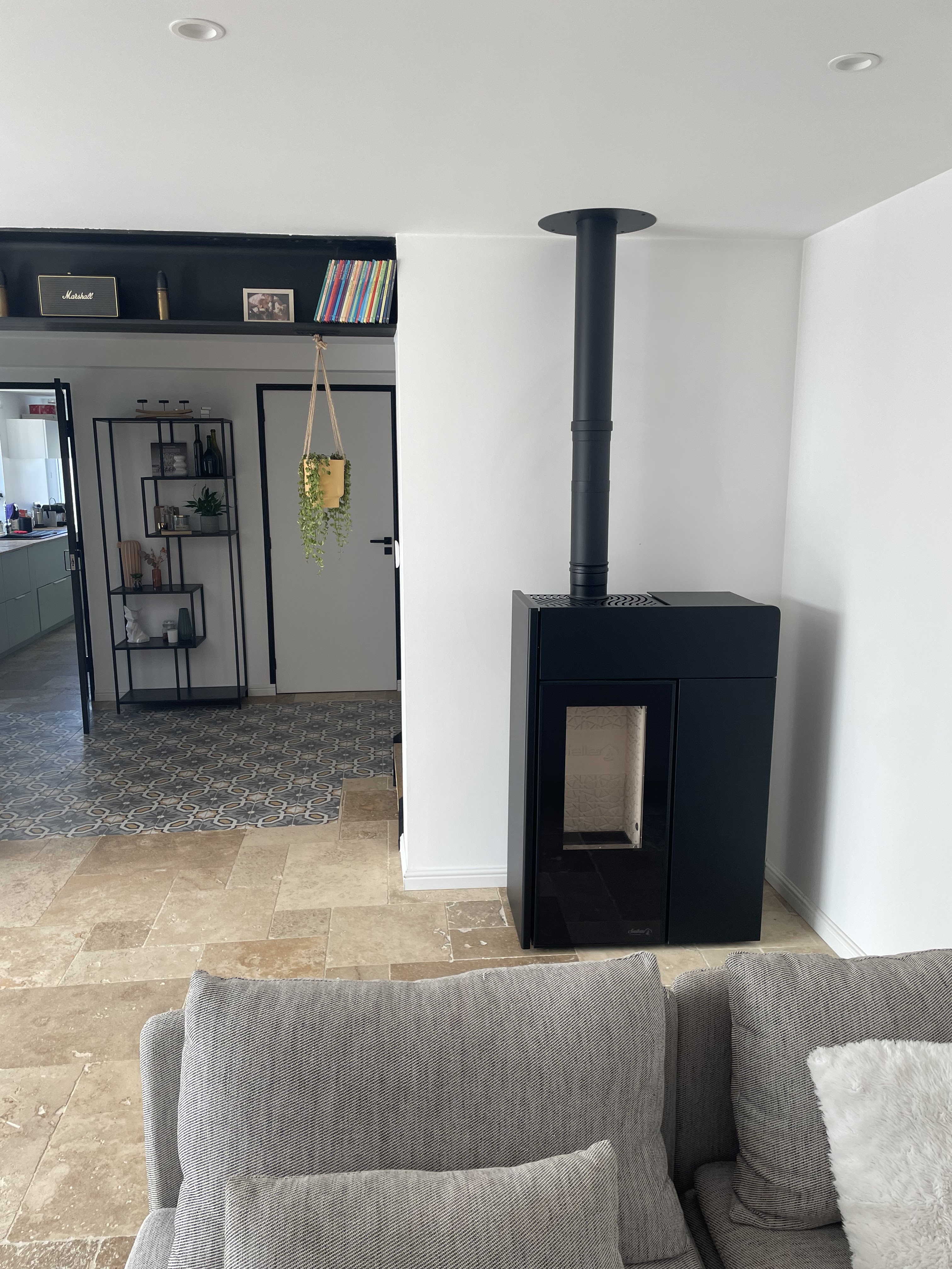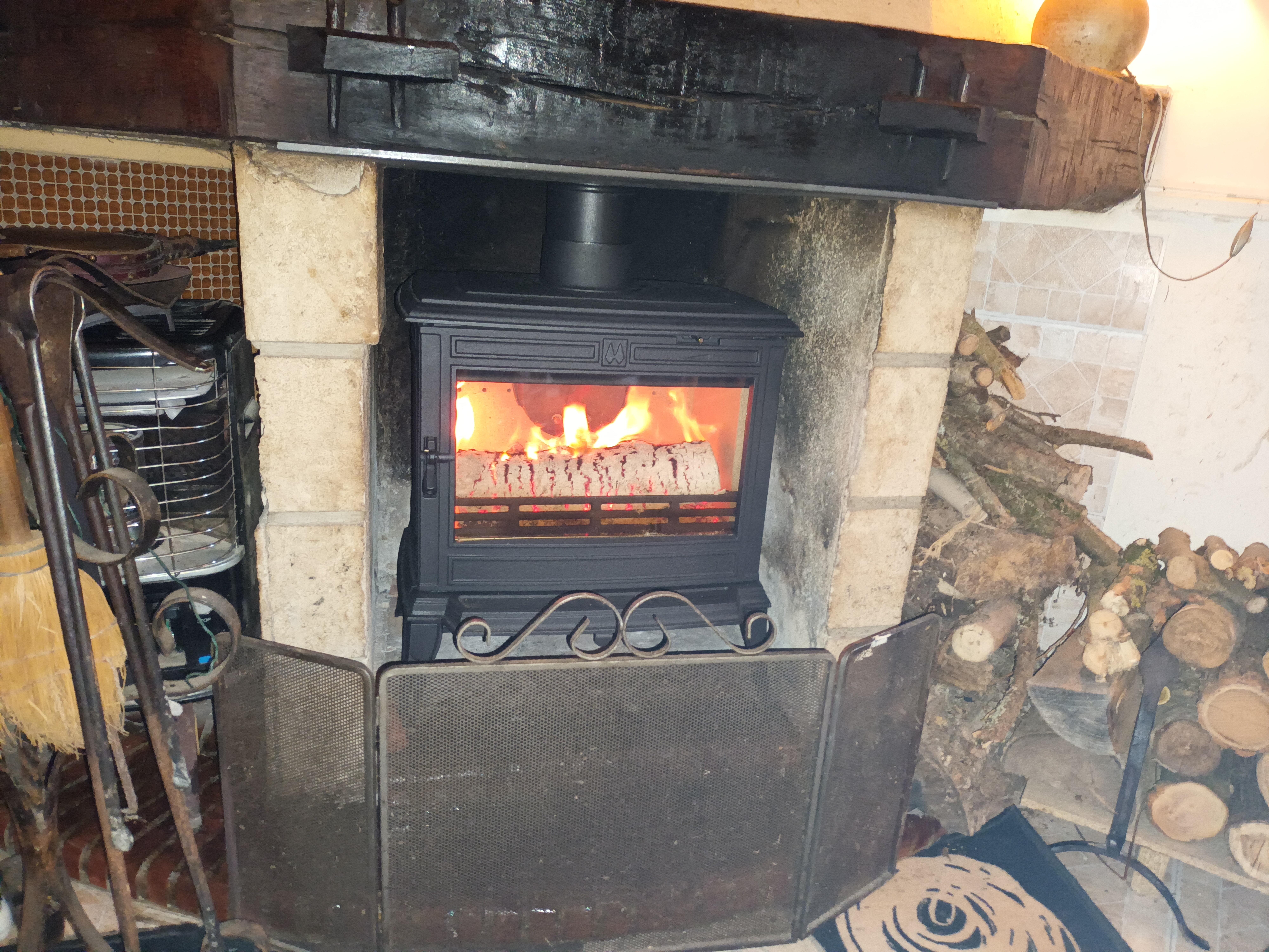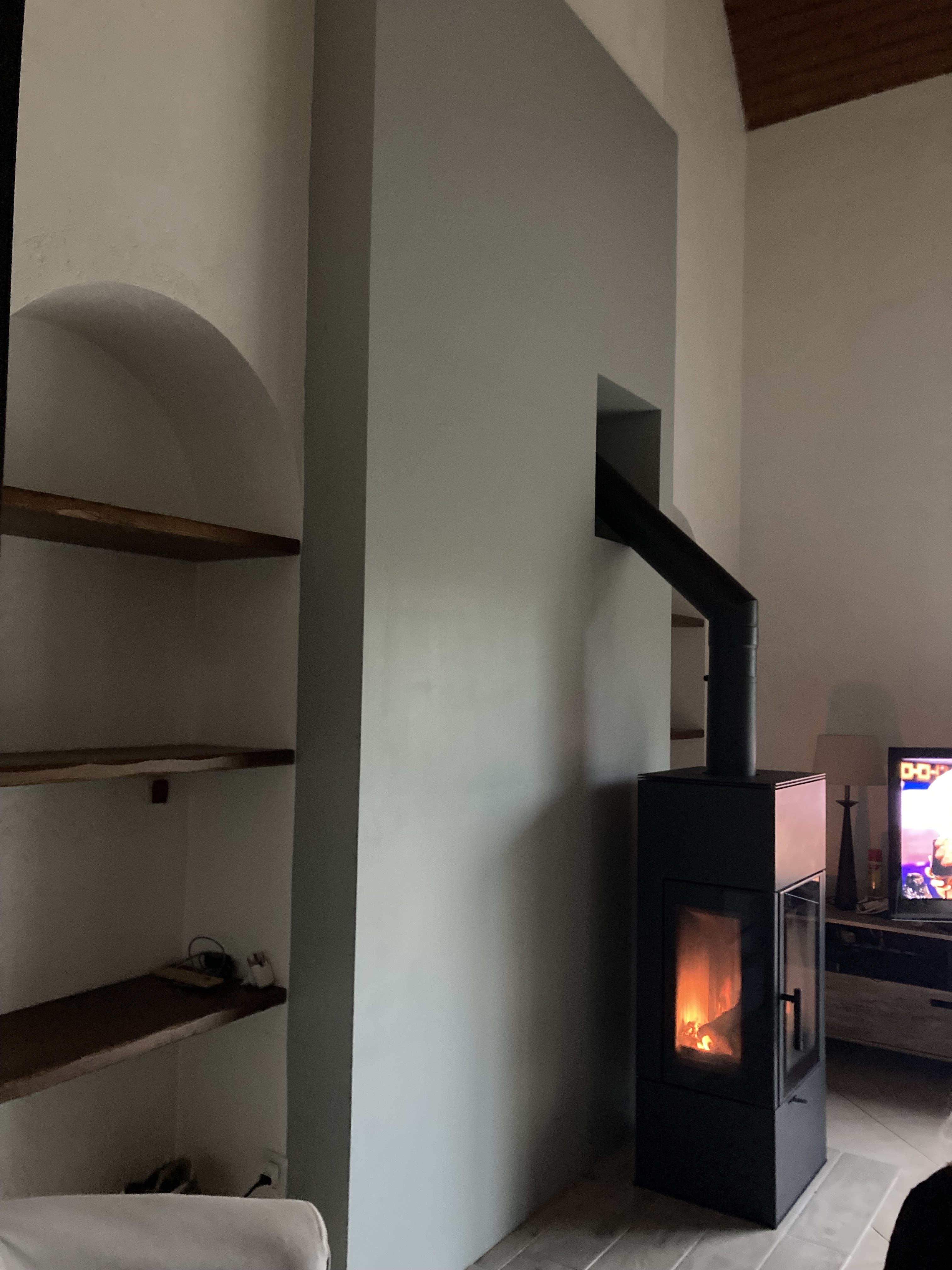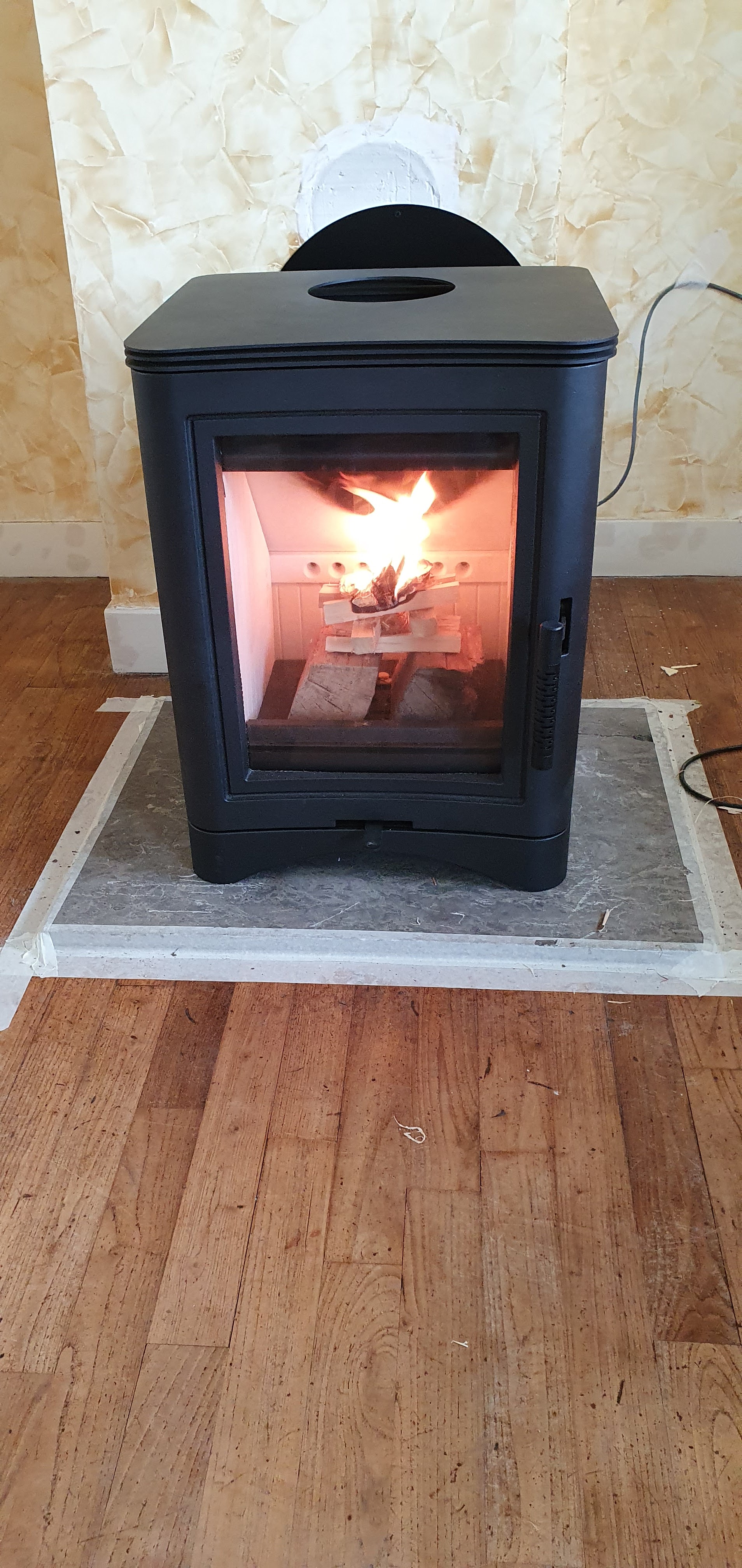 Premières flambées dans notre poêle. Un grand merci à votre équipe pour vos conseils, l’accompagnement et la pose, nous recommandons ! Et pour info déco Faïence effet bois derrière le poêle et grande plaque de carrelage noir sous le poêle