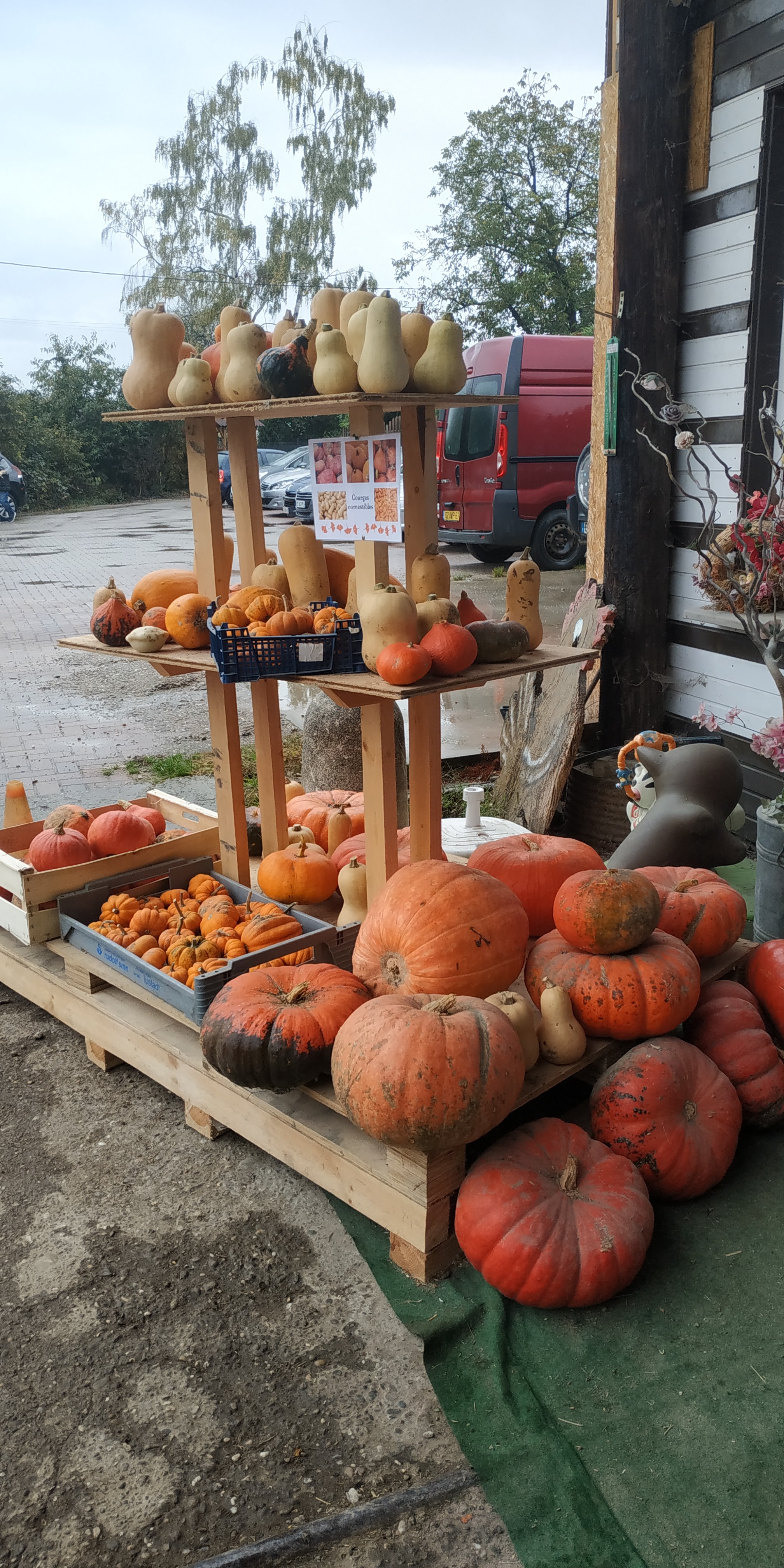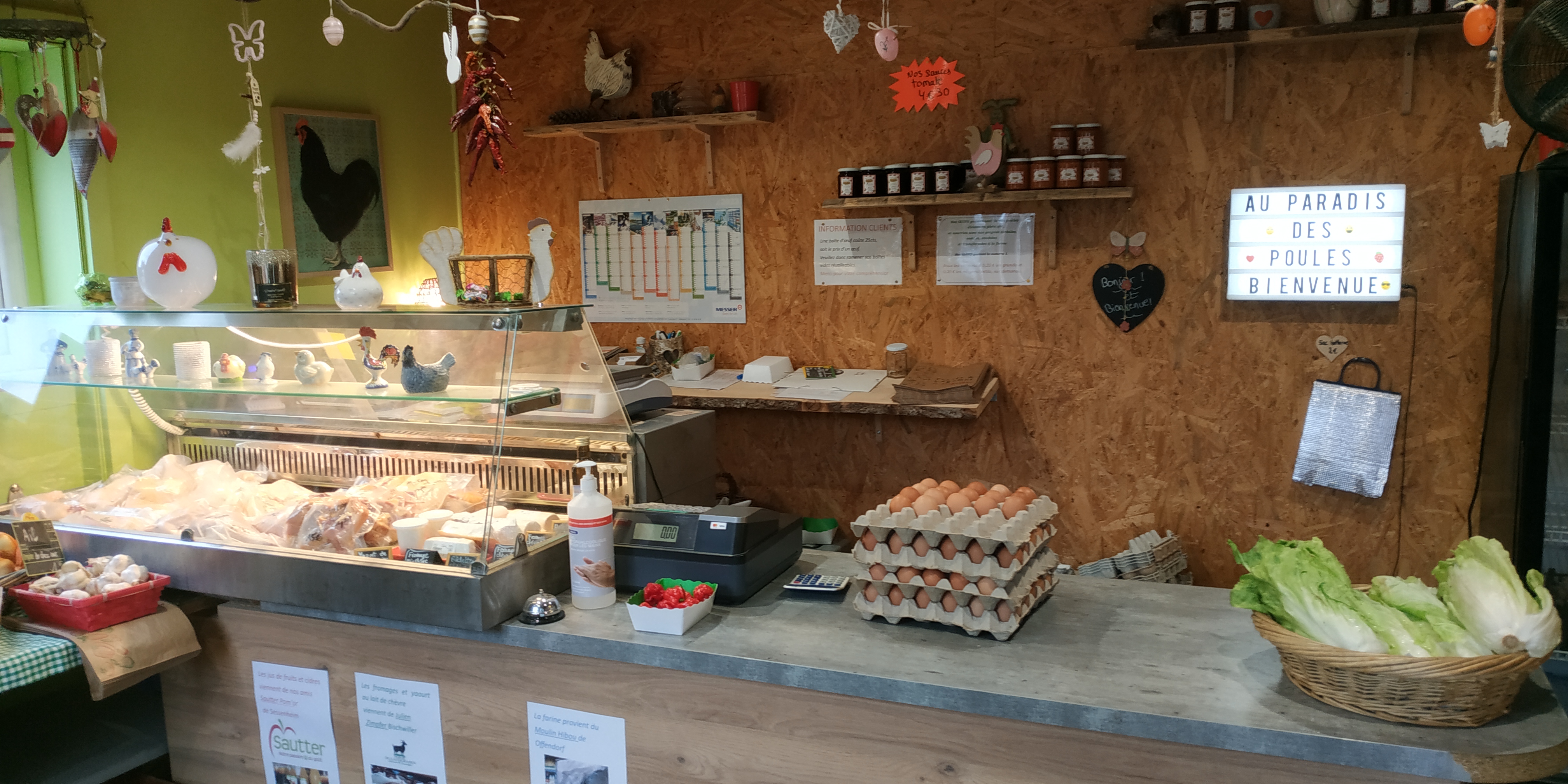 Épicerie au paradis des poules. Pomme de terre, oeufs, potiron, beaucoup de produits différents. Accueil chaleureux. Prix abordables.