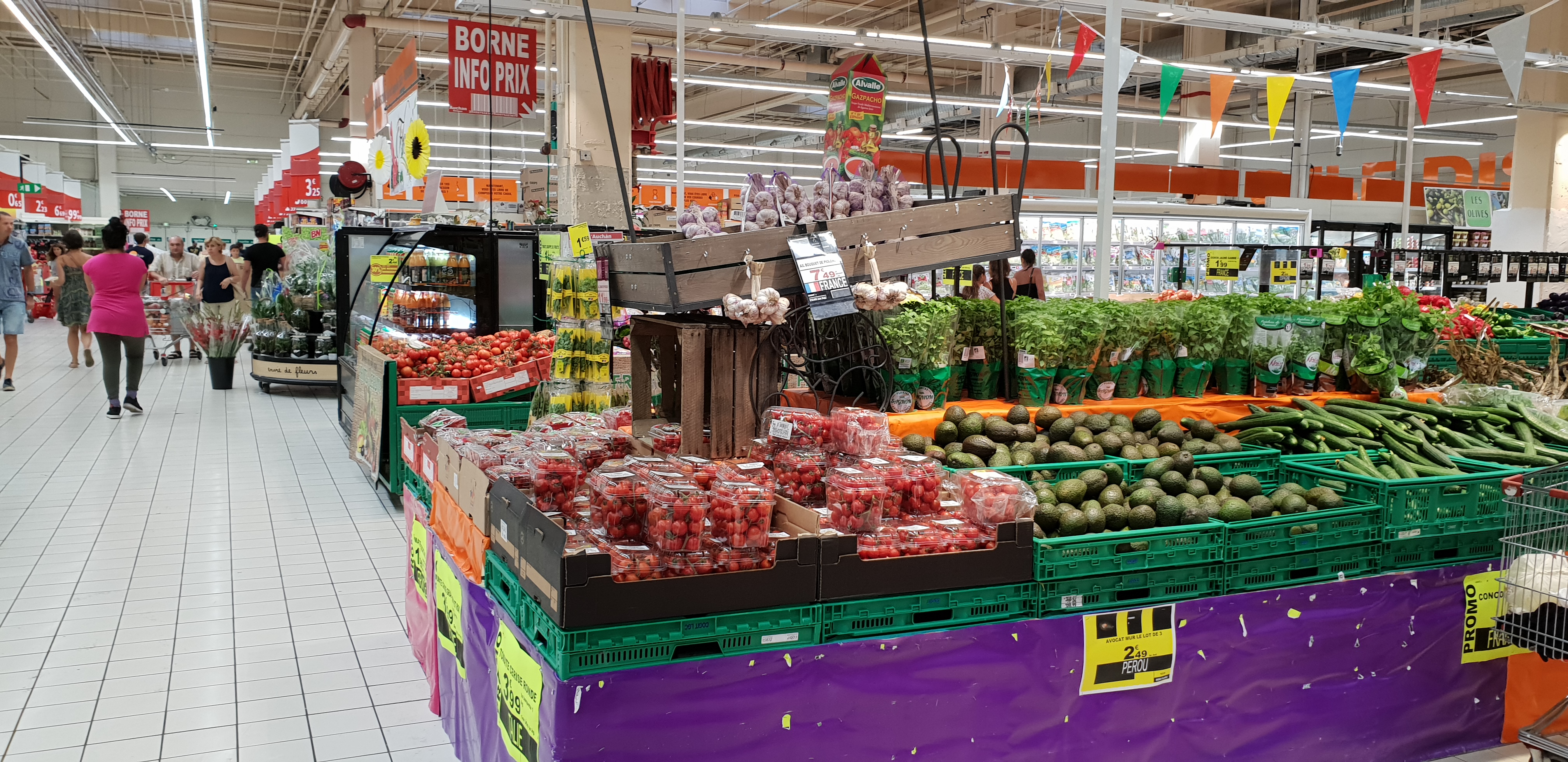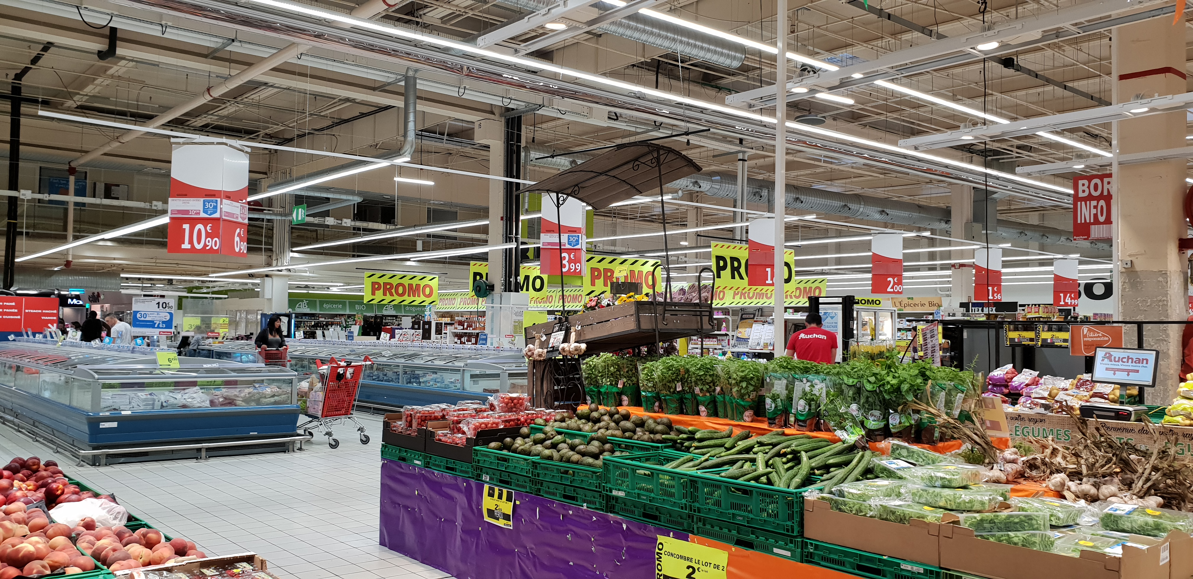 Grande surface en centre commercial ce qui veut dire qu'il y a une Galeries de magasins divers comme NAF NAF, CAROLL, CELIO, CLAIRES, ORANGE, HISTOIRE D'OR MORGAN, SWAROVSKI, SPORT CITY MICROMANIA, SAN MARINA, coiffeur etc....il y a même un point office de tourisme.... Auchan est bien agencé, entre les promos en tête de gondole, les soldes regroupés, et les différents secteurs d'alimentation, on se repère assez facilement, du choix.... Un engagement éco responsable qui est intéressant, par contre il faudrait essayer d'affiner les producteurs en valorisant plus les produits français et leur qualité bio, même si on trouve des espaces de produits biologiques... On trouve aussi un espace jardin et ses fournitures... On peut voir aussi ce qui est à noter du personnel dans les rayons, ils sont du coup accessibles pour des renseignements....Le parking est grand, ombragé, les caddies semblent peu nombreux malgré des points de regroupement répartis sur tout le parking... Les prix restent dans la même lignée que les autres grandes surfaces, ils fluctuent les uns avec les autres selon les stocks....