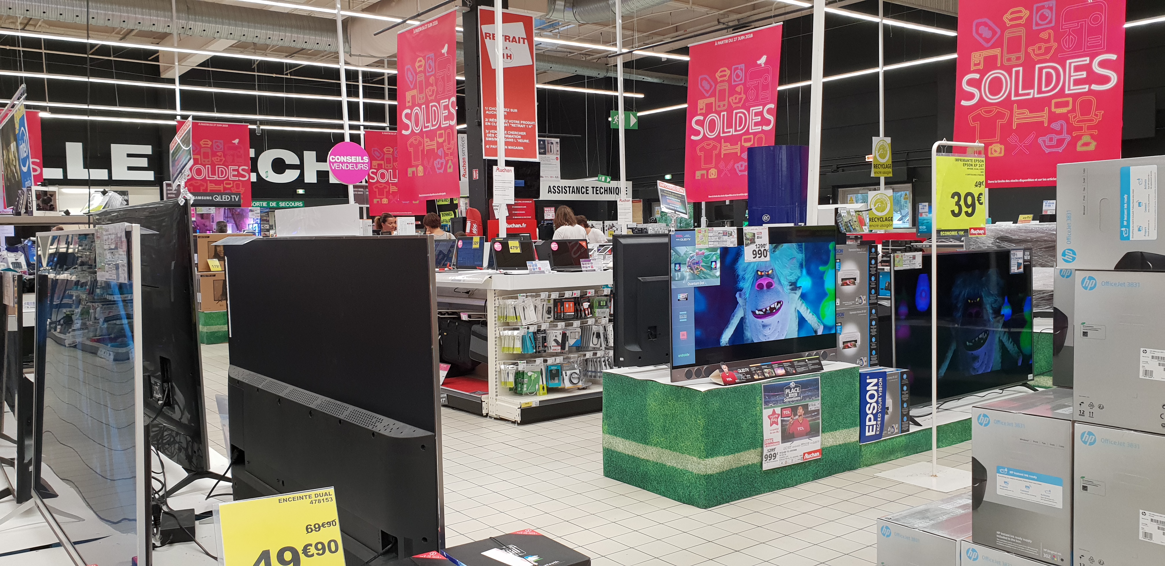 Aujourd hui samedi 14h rayon télé téléphone pas un seul vendeur, nous attendons 20 mn pour voir un vendeur pour acheter un téléphone et personne c 'est tjs pareil dans ce magasin pour voir un vendeur grosse galère du coup nous sommes partis l'acheter chez darty et là les vendeurs ne manquent pas nous sommes servis sitot arrivés au magasin et finalement nous avons fait une meilleure affaire qu'à auchan pour moi c est terminé ce magasin