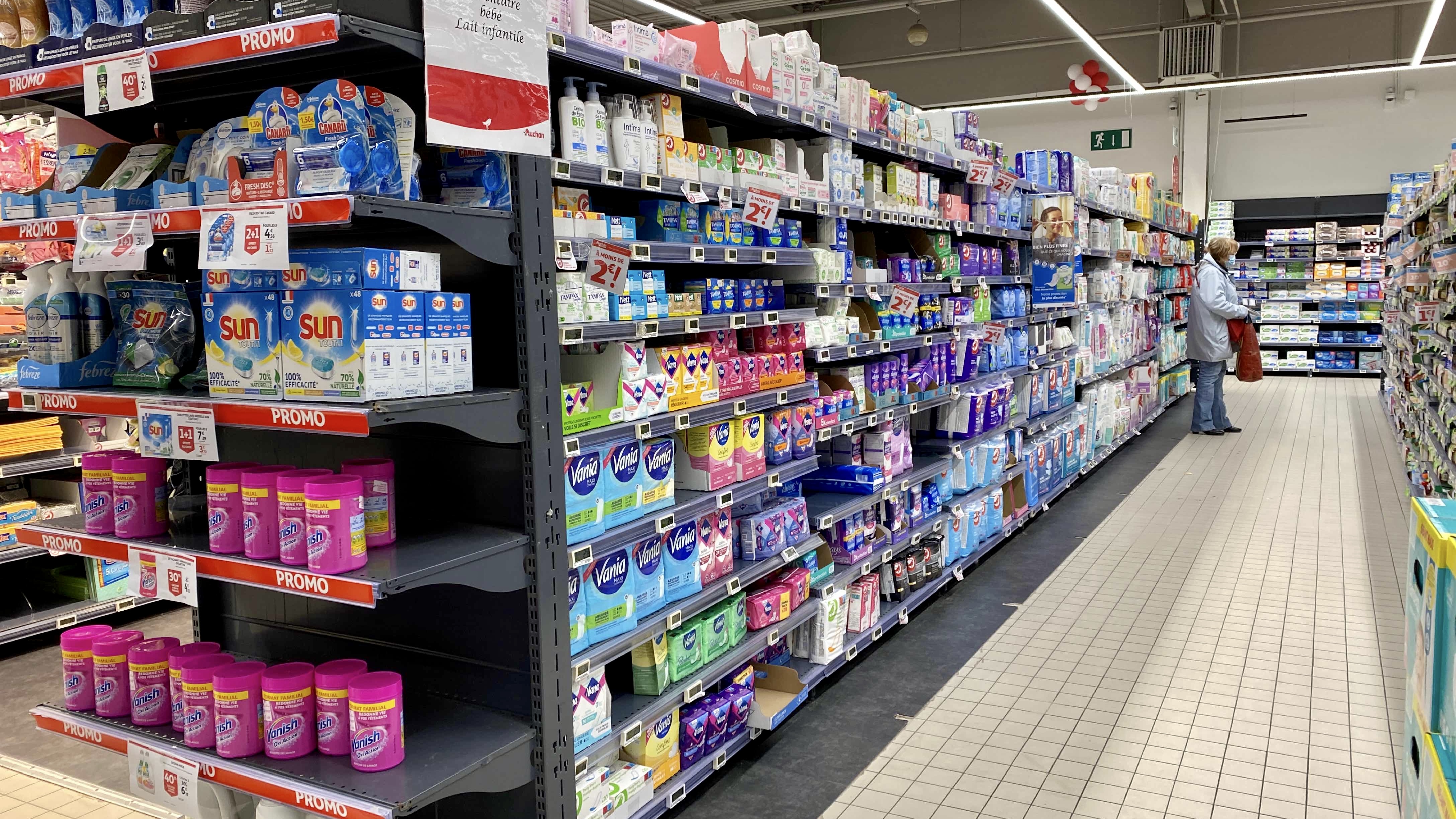Auchan supermarché propre et spacieux. Le vigile circule dans les allées du magasin. Les rayons sont bien organisés, beaucoup de caisses sont ouvertes. Quelques rupture de stock sur les tomates sont notables.