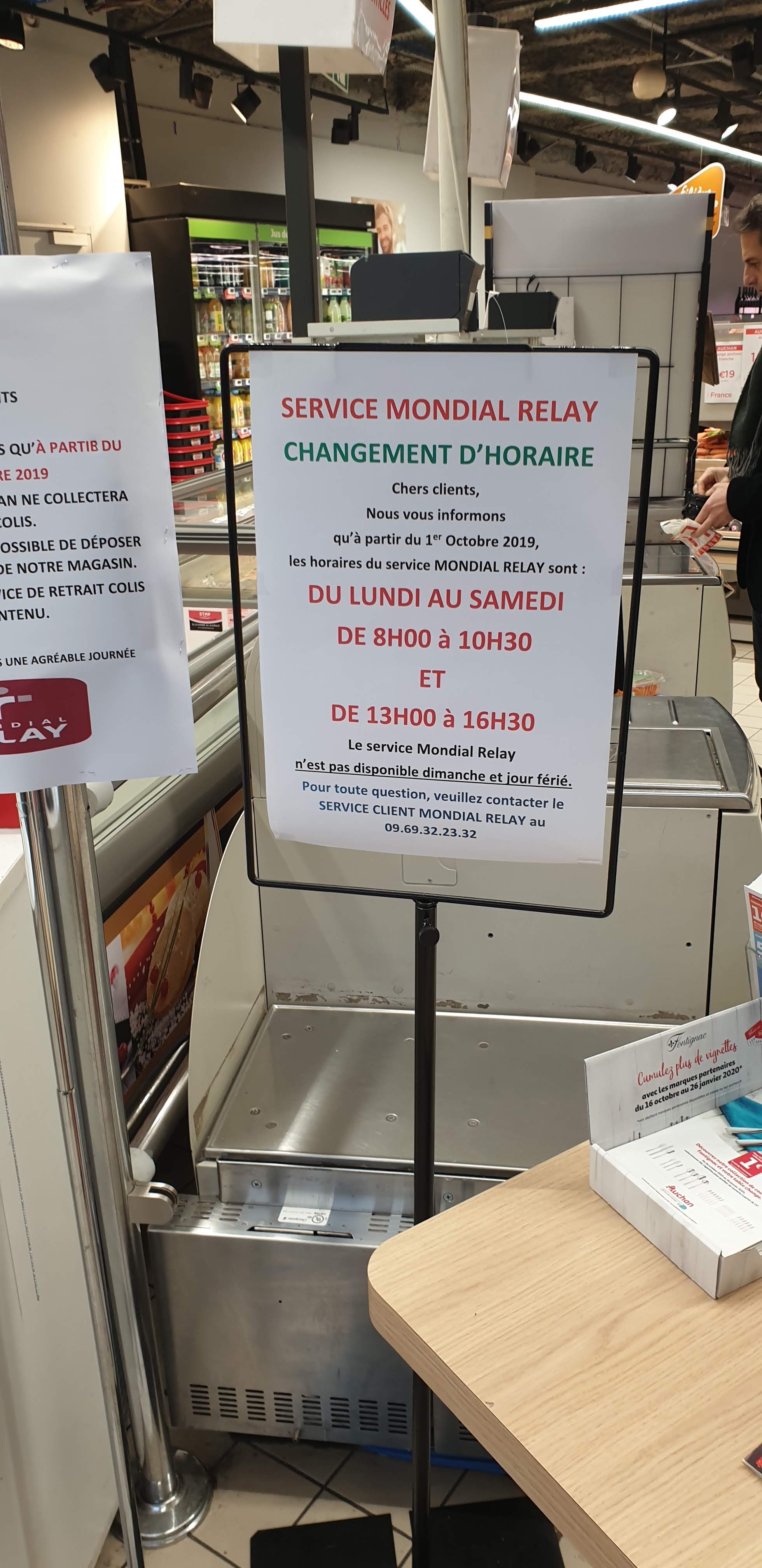 Les horaires du Service Mondial Relay sont faits pour repousser les gens. Le matin de 8h30 à 10h30 et l'après midi de 13h à 16h30. On aurait pas pu faire pire. J'ai vu plusieurs client arrivés et partir très remontés. Moi même, arrivé à midi, alors qu'il n'y avait personne et que la caissière se tournait les pouces, elle m'a gentiment dis qu'elle ne pouvait rien pour moi et qu'il fallait contacter la direction pour que ça change. Un conseil, fermez le service car des clients mécontents comme moi risquent de ne plus passer faire des courses ( double perte). Dommage, car jusque là, j'avais mis un 5 étoile et que je fais mes courses là-bas depuis 10 ans maintenant. A bon entendeur. limite. Je sens que les horaires choisies
