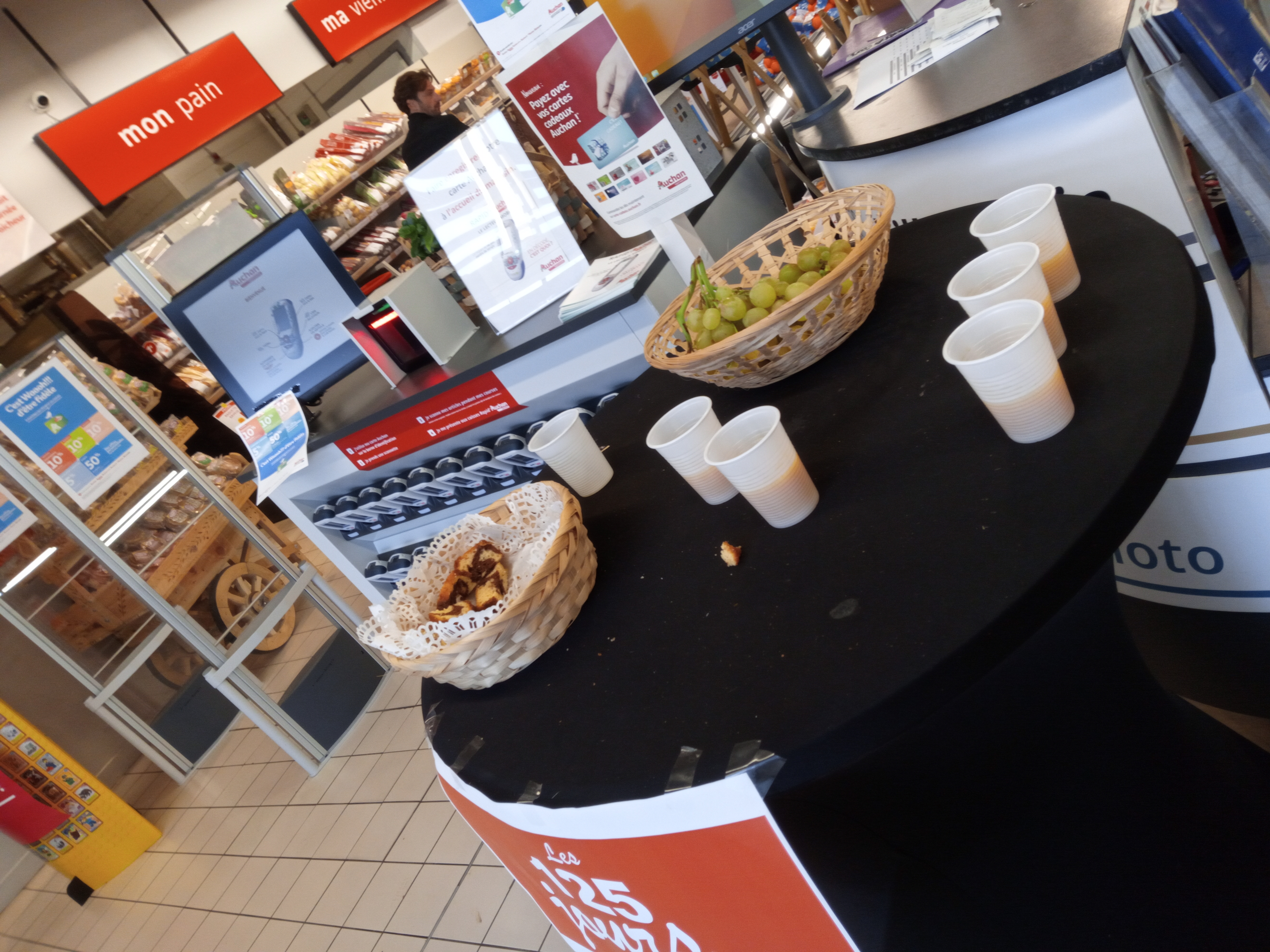 Petit Supermarché propre et correcte Le petit plus qui ma bien fait plaisir et qui la donné envie de rédiger un avis et le fait que en rentrant dans le magasin on peut se servir un verre de jus et des petite part de gâteaux, c'est vraiment ça qui fait la diference avec d'autres Auchan Seule petit détail serait de mettre la wifi gratuite à l'intérieur car on ne capte partout la 4g, à cause du toit qui fait l'effet cage de Faraday