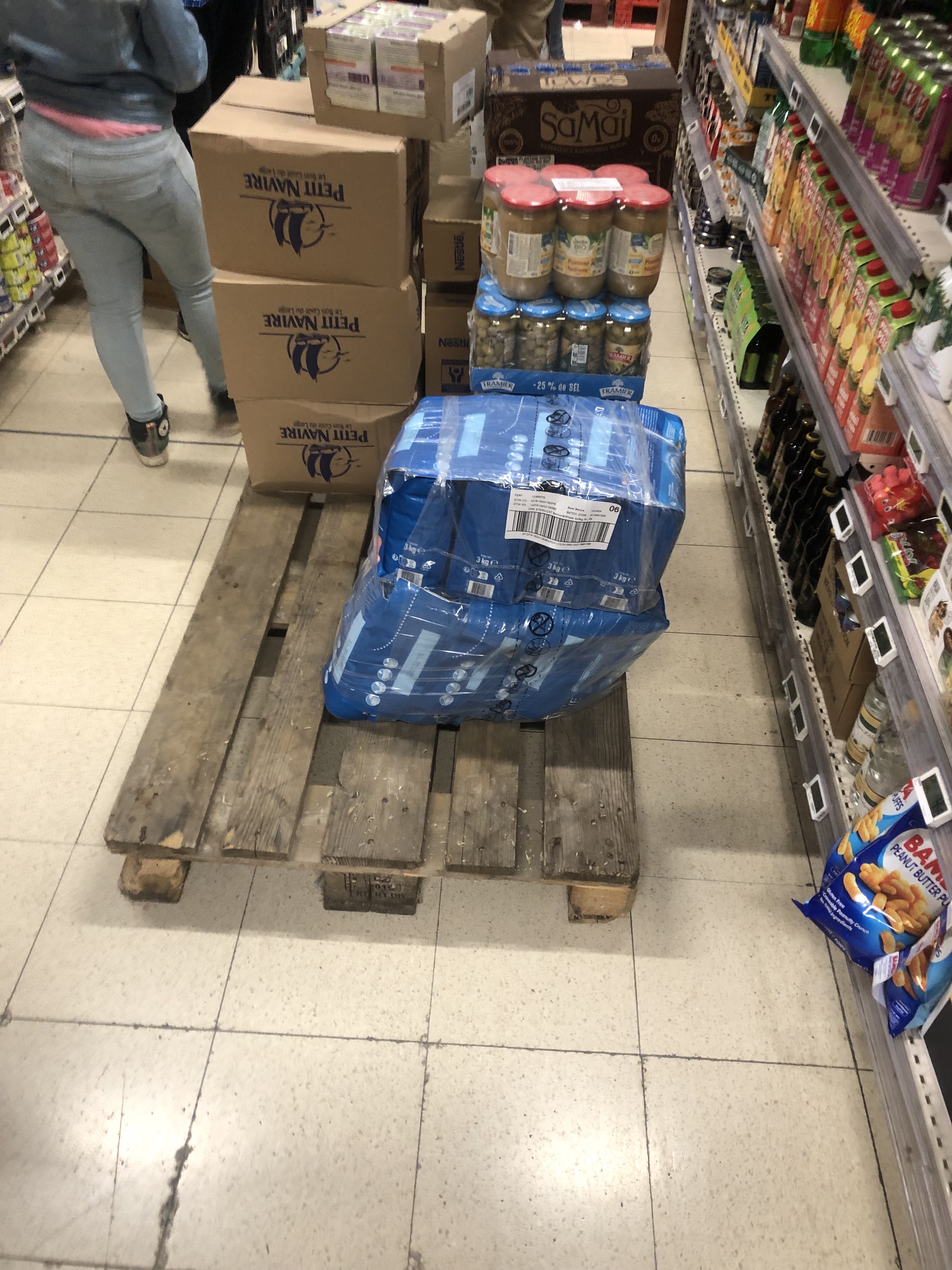 À midi, beaucoup de palettes de marchandises dans les allées.