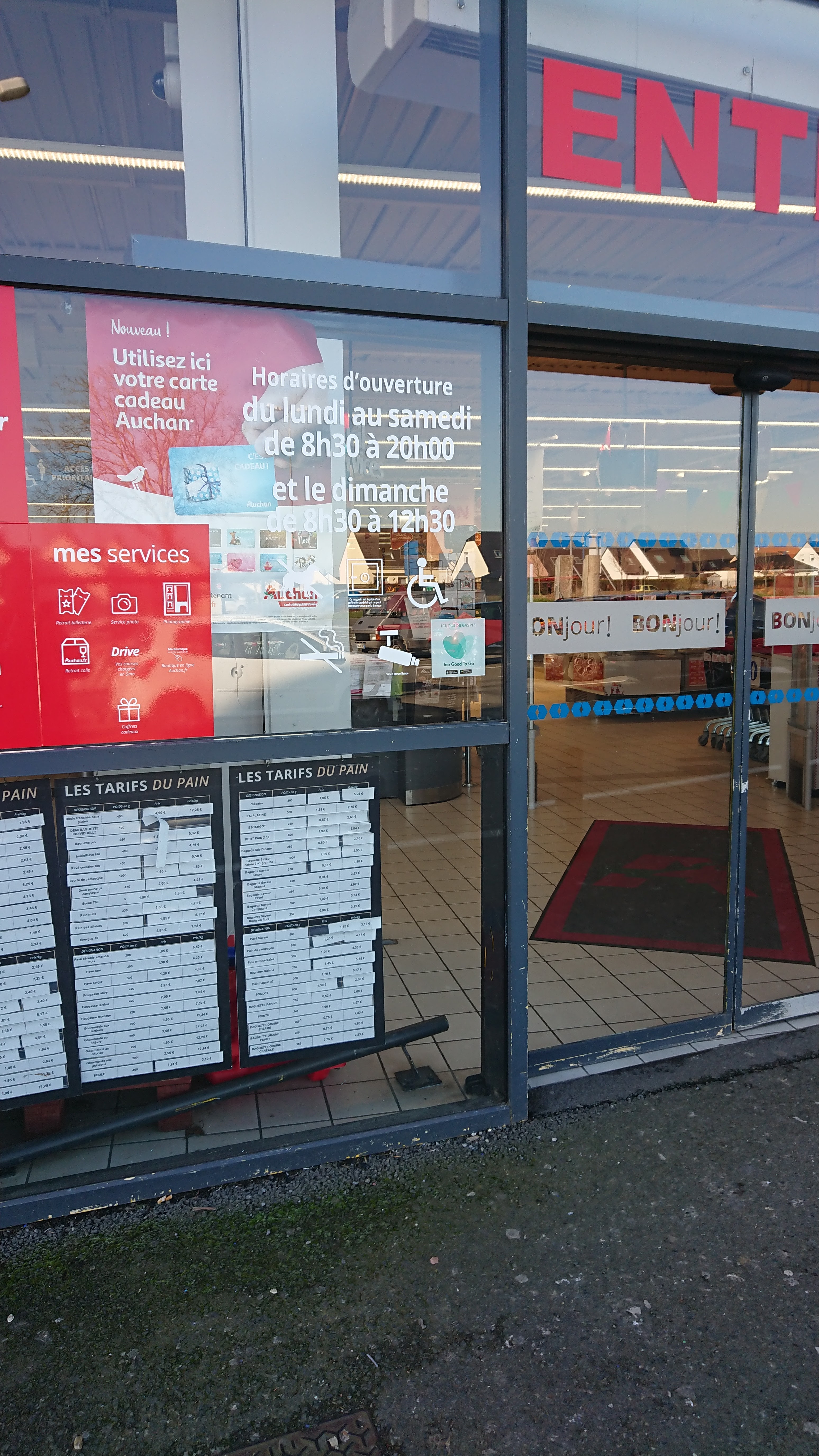 Très déçu toute la communication ( affichage à l entrée, panneau sur les routes) indique une ouverture à 8h30 le dimanche et finalement non c est 9h. Pas bien méchant mais on attend comme des c*** parce que le groupe Auchan ne sais pas faire d affichage correct. La prochaine fois j irais à Leclerc.