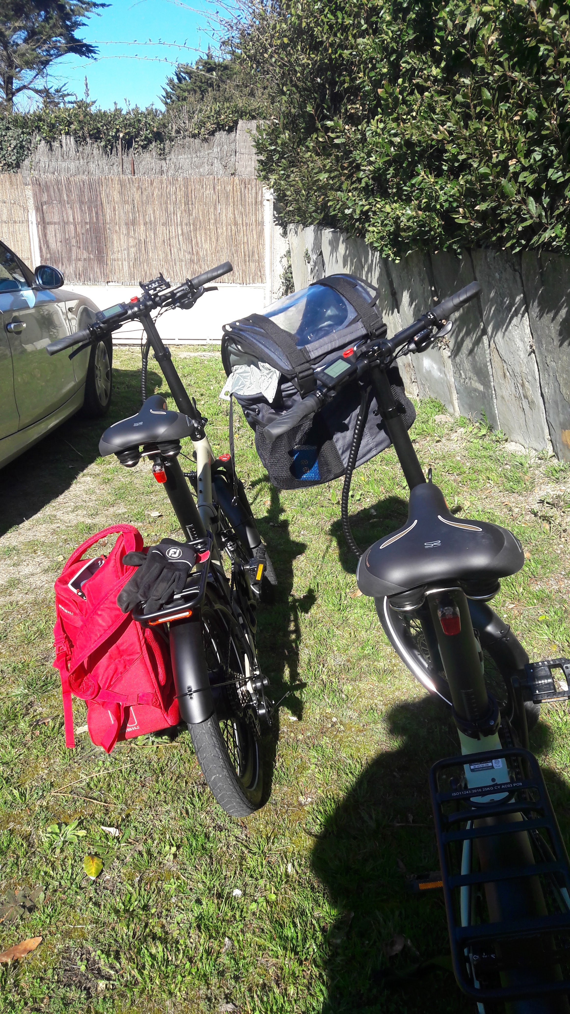 Accueil super avec conseils supers également ... Notre choix : le modèle pliable avec roues de 20 pouces ... donc entre le petit et le grand ... Pliables, nous en avons pris 2 type Afternoon ... Première expérience : nous chargeons dans le coffre de la BMW, selles / batteries a part (lourds). Direction : Pornic. Puis parcours par pistes cyclabes a la Bernerie. Prise en mains impec : l'ergonomie est parfaite. L'assistance elec en 2 ou 3 (vent de face) et 4 dans les grdes cotes du debut. Précisions: panier vitré sur le guidon contenant 1 Teckel (7kg) pour ma femme. Sac a dos et sacoche pour moi. Beau temps froid ! Resto a la Bernerie. Retour avec vent poussant. Pas d'assistance elec. Freins super en descentes. Bonne accroche des pneus larges. Equilibre parfait après entraînement avec des roues plus petites que les velos classiques. Repliés sans les selles et tube batteries (tres facile a enlever) et remis cotes a cotes dans le coffre de la voiture mise en hayon. Couvertures pour caler et proteger. Retour VANNES.