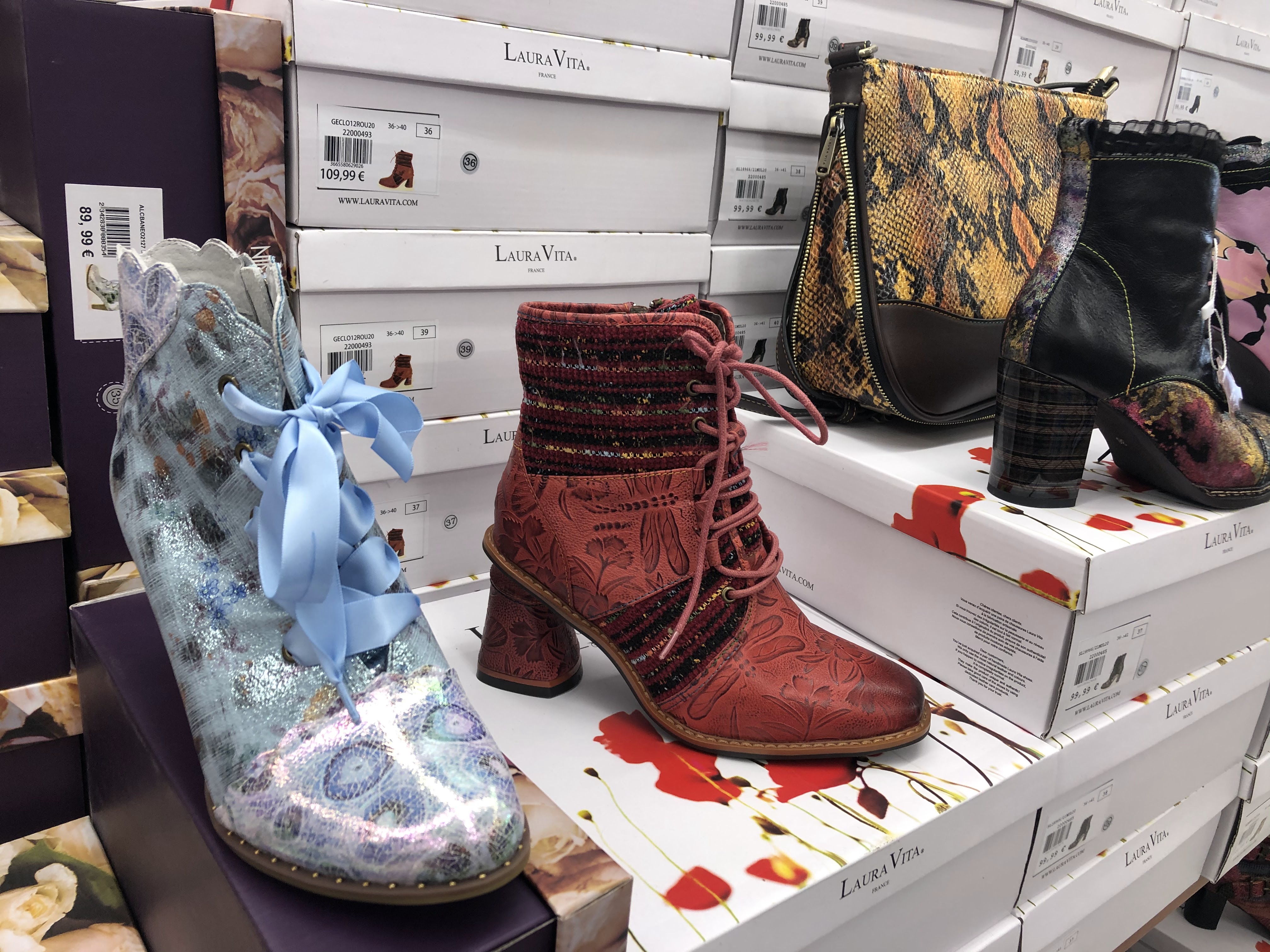 Boutique bien approvisionnée avec un large choix de chaussures, sacs et accessoires