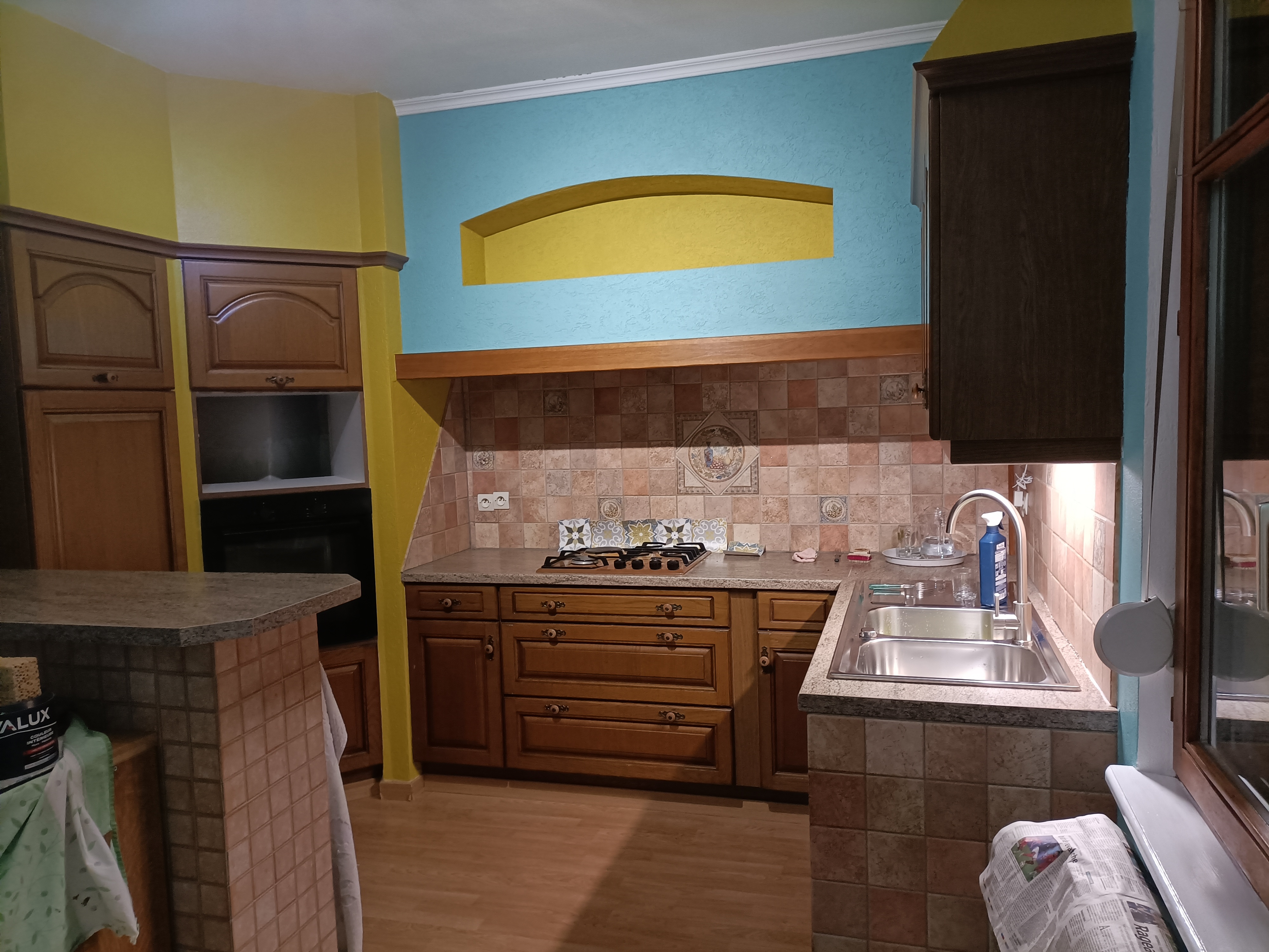 Merci au personnel du Brico Dépôt de Schweighouse pour leur accueil, leur service et leur conseils. Bravo pour les peintures proposées et notamment celles qui sont à préparer. Ma cuisine est lumineuse et totalement rénovée. Les couleurs utilisées sont : La Vida (jaune), Sunday Sky (blanc bleuté pour les boiseries) et Aquamarine (bleu). Rebords de fenêtres : marque Good Home (Nord pole blanc brillant ) et plafond : marque Évaluxe (blanc). Peintures de très bonne qualité avec un rendu impeccable.