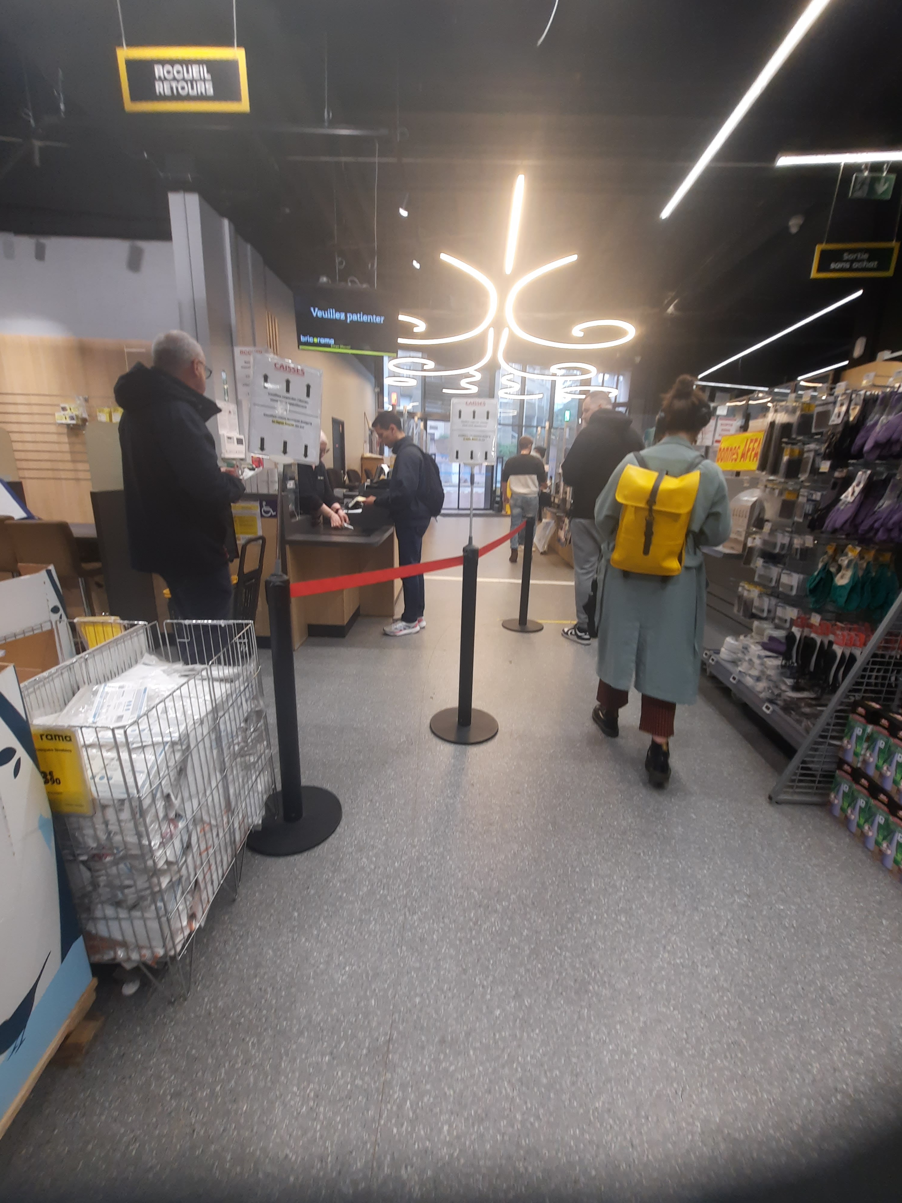 Quelle expérience client !! Une file interminable en caisse hier apres midi comme souvent. 14 personnes faisaient la queue et 1 seule caisse d ouverte. Comment voulez vous résister au e- commerce ou le produit est acheté en 2 clics quand vous ne savez pas gérer le passage en caisse ? Comment voulez vous vivre quant 20 % de vos clients reposent les articles en partent sans acheter ? Ils ont fait l effort de venir et vous les faites fuir ! Monsieur le directeur, revoyez votre stratégie svp.
