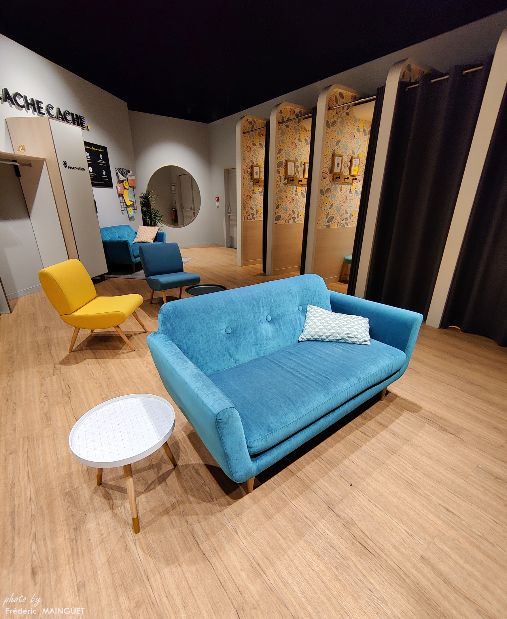 Belle décoration à l'espace essayage ! Bonne idée pour les fauteuils, canapé et miroirs.