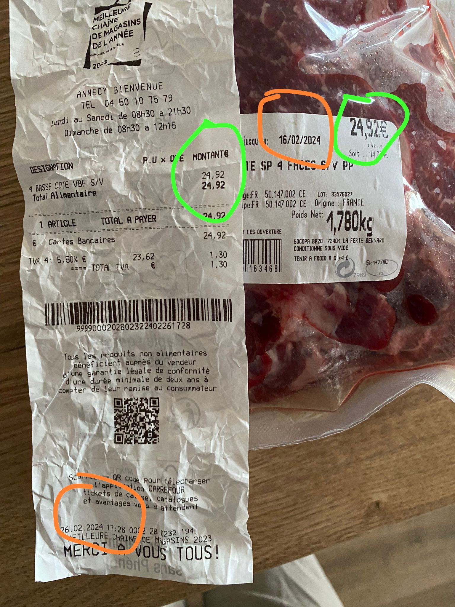 Bonjour, j'ai acheté un panier anti gaspi ce jour. 6 saucisses et 4 morceaux de porc et surprise une tête de porc... Qui cuisine une tête de porc en 2024 en tout cas pas moi, ni mon immeuble à qui j'ai voulu donner, personne ne savait faire. Déçue. Je fais bcp de panier et première fois que je vois cela. Je ne retournerai pas chez carrefour. De plus ce jour bcp de légumes et fruits au sol, avec agriculteur à l'entrée et ds les rayons. Dégoutée
