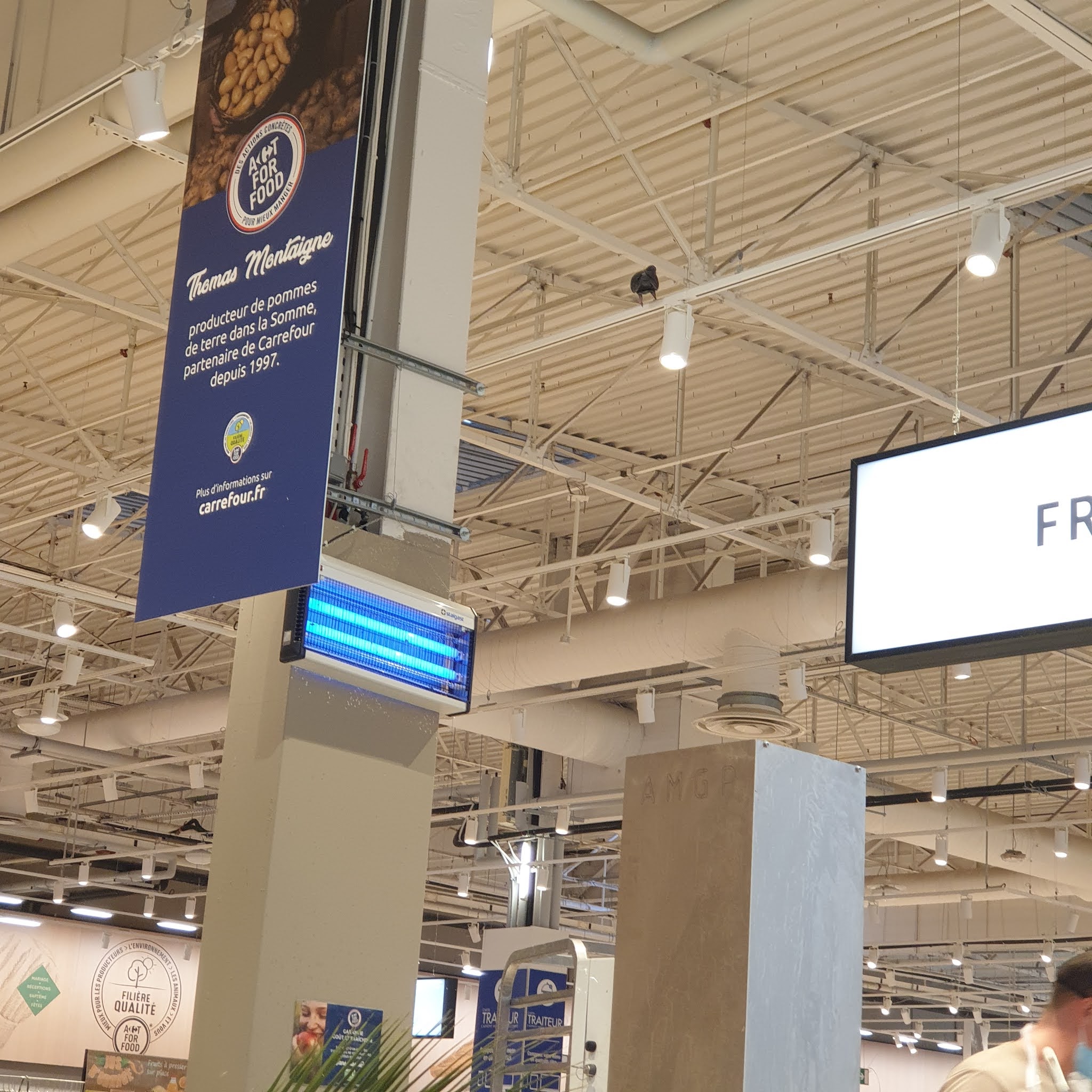 Bonjour, n'y a-t-il pas une équipe technique pour capturer gentiment cette oiseau et le relâcher dans dehors? Car a part manger des aliments oléagineux dans les distributeurs bio ou bien contempler le rayon des fruits, il n'avait rien a faire la ! Même les employés rigolé et fessais rien. En parlant d'employé, il est inscrit partout masque obligatoire comment cela ce fait que un agent de sécurité le porté sous le menton ? ( au niveau de la dernière caisse face au restaurant) Il c'était coupé en ce rasant ? Et manque de pot a ce moment la une client devant moi n'était elle sans aucun masque. L'agent de sécurité fait-il vraiment sont travail ? Cela dit en passant ( même si vous vous en moqué) je travail aussi dans un centre commercial et quand cela arrive tout employés nous le signale ( esprit d'équipe) Cordialement