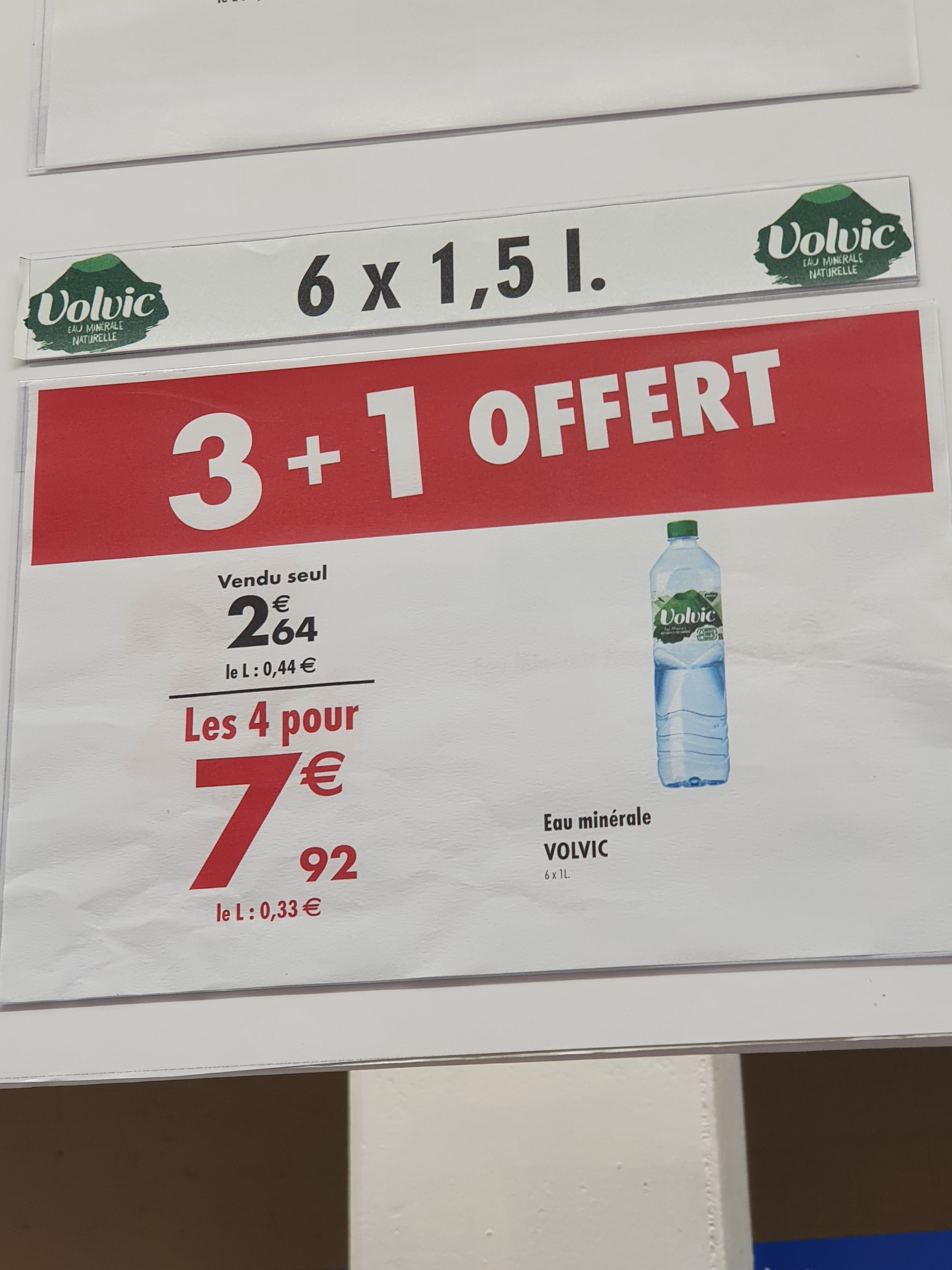 Offre trompeuse: L'offre concerne les bouteilles de 1L et non celles de 1.5L comme indiqué en grand. Ce n'est pas la première fois que les clients se font tromper comme cela dans ce magasin. Et ça recommence quelques mois plus tard... attention à ne pas vous faire avoir. Carrefour Drancy est très vicieux! Offre valable sur les packs volvic d'1L et non 1 5L comme c'est indiqué en grand, il faut lire entre les lignes