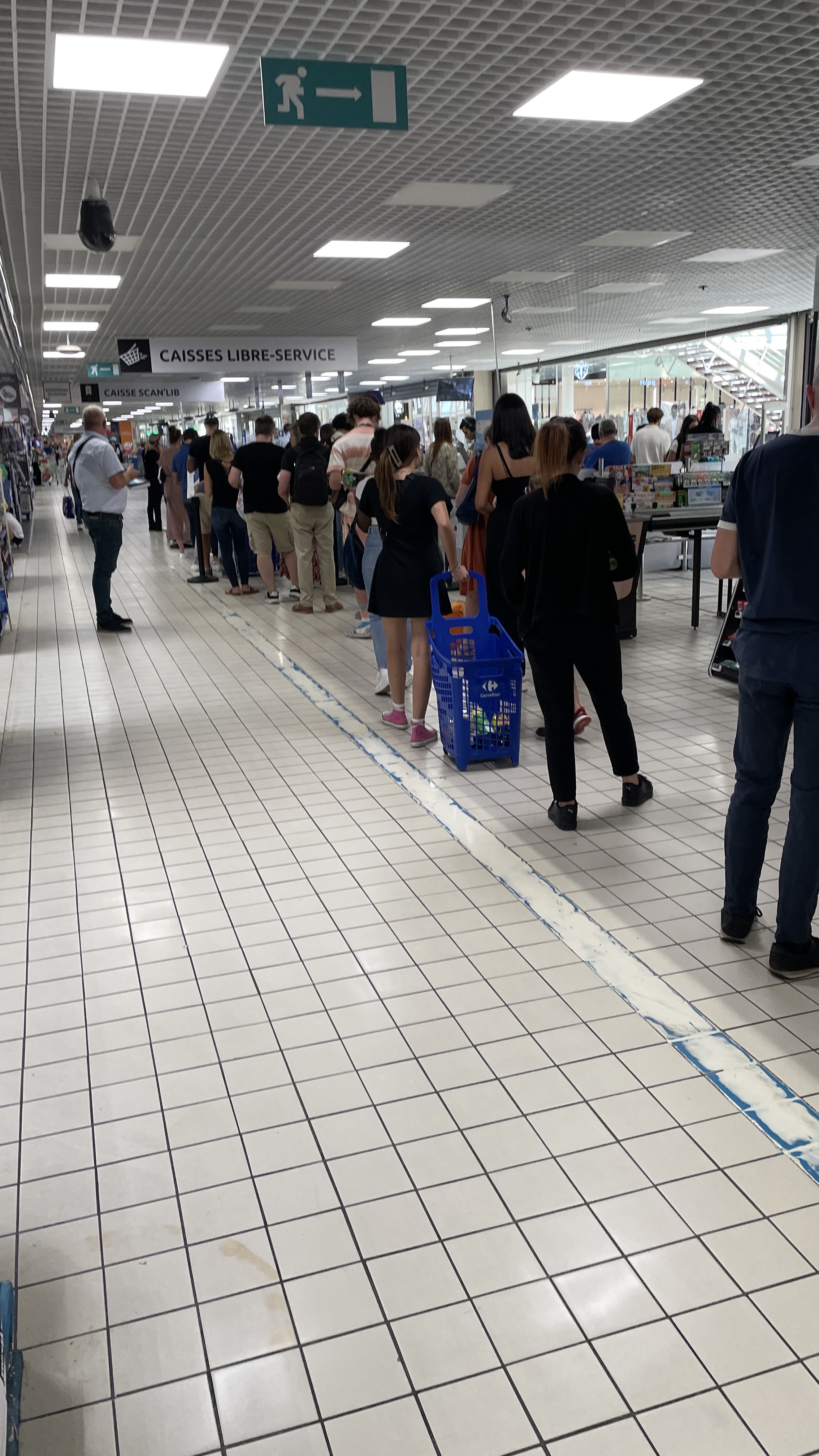 Un mercredi jour des fournitures peu de caisses Ouvertes, résultats une queue interminables aux caisses….