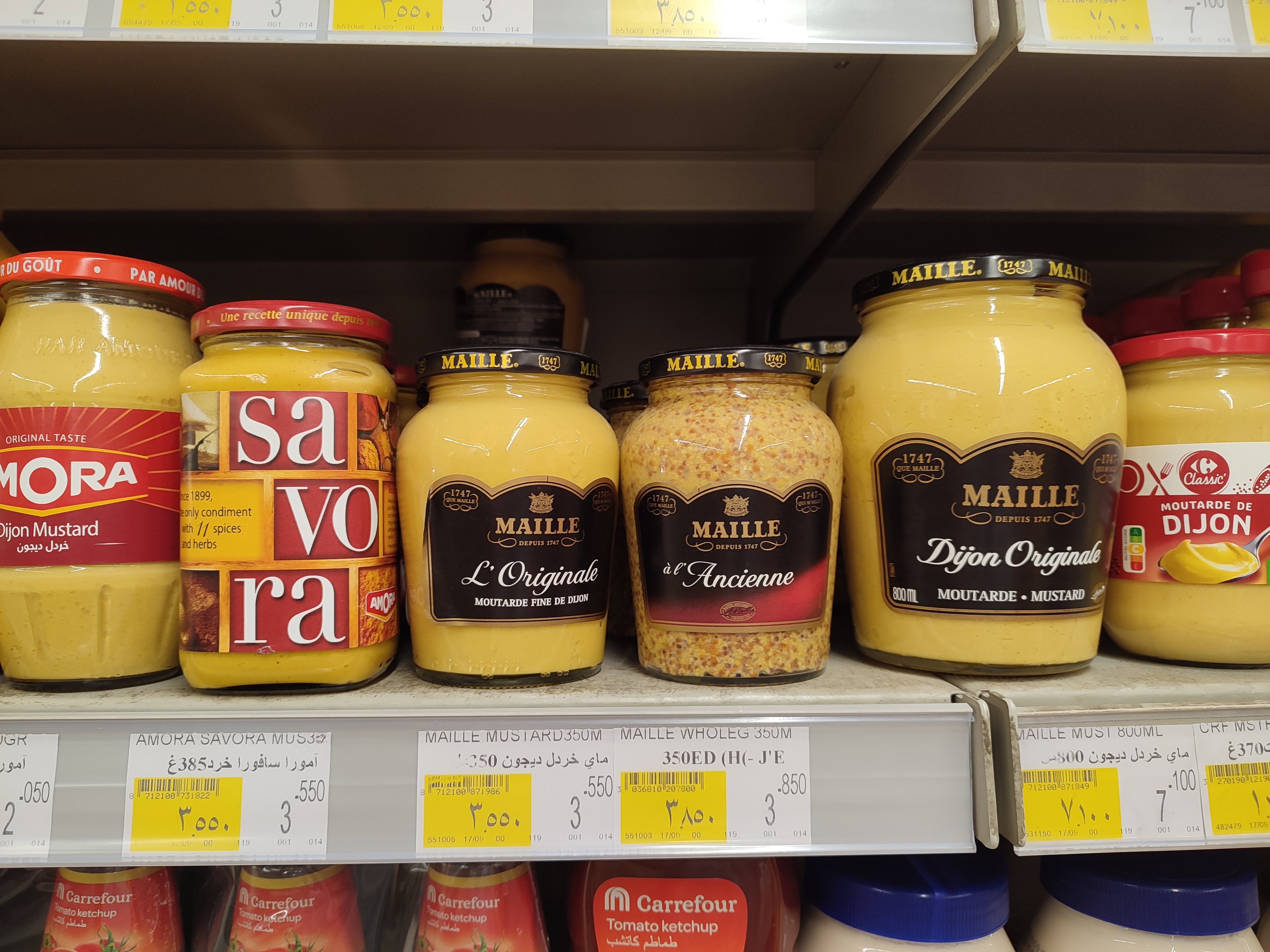 Beaucoup de rayons vides et non réapprovisionnés. Un certain laissé allé dans la tenue du magasin. Une blaguounette ? Vous cherchez de la moutarde digne de ce nom ? Carrefour Market à Amman en Jordanie.