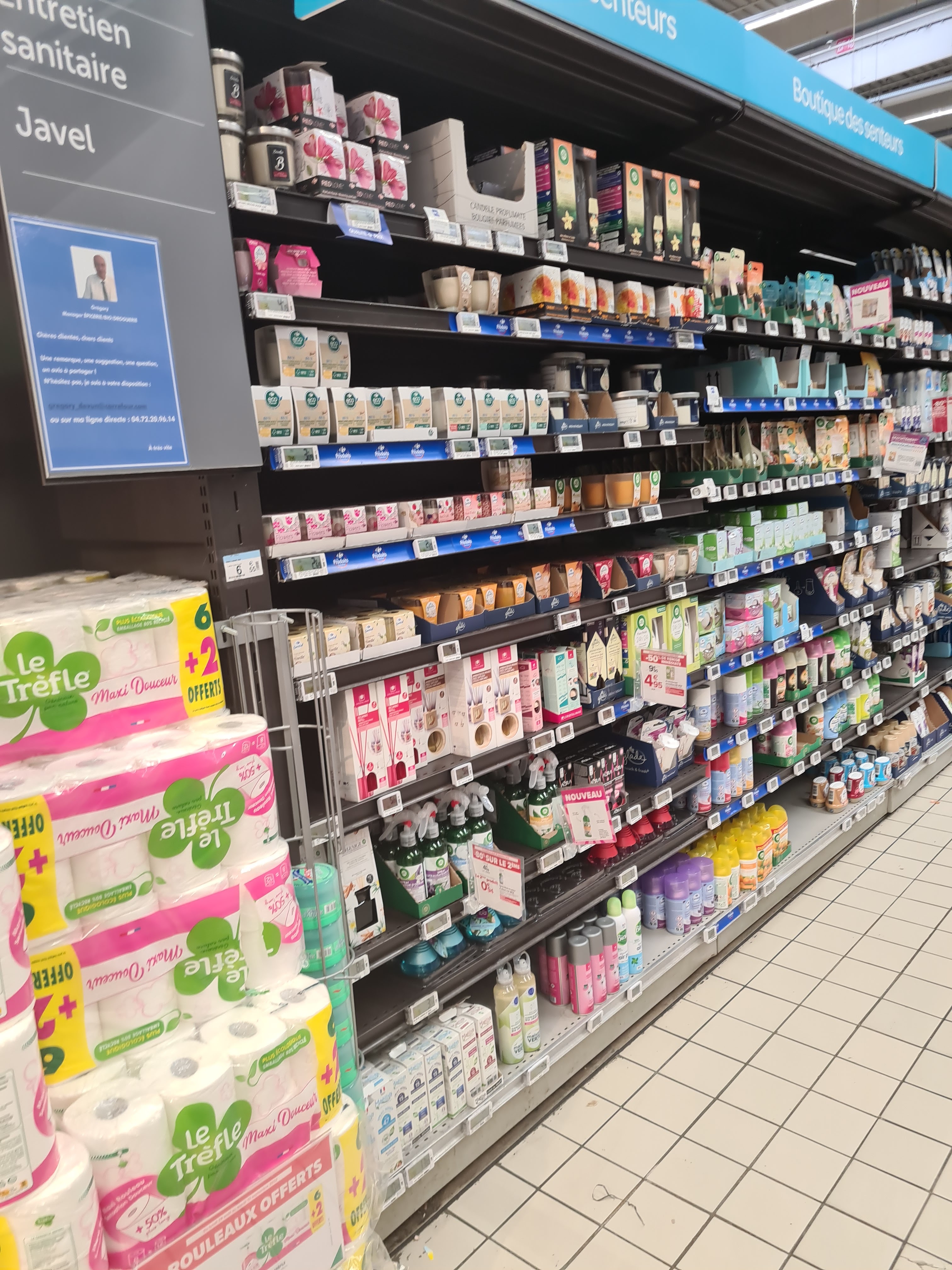 Je reçois ce sms : Votre magasin s'est fait une beauté ! Nous vous donnons RDV jusqu'au 11/09 pour feter ça… Ahh oui, une beauté… Bravo ! Carrefour Ecully a tout réimplanté… et en a profité pour déférencer un certain nombre de produits, plutôt dans le haut du panier… De plus, la mise en rayon est simplifiée… on y met directement les cartons à peine ouverts, ça fait des économies d’échelle, en nous prévenant bien de ce qui est à « prendre » ⬇️ et de ce qui relève du « stock » direct en magasin ⬆️ ! Car, en effet, la différence n’est pas tangible… On se croirait chez Lidl ou tout autre discounter !! Bravo le supermarché de l’ouest de Lyon !!