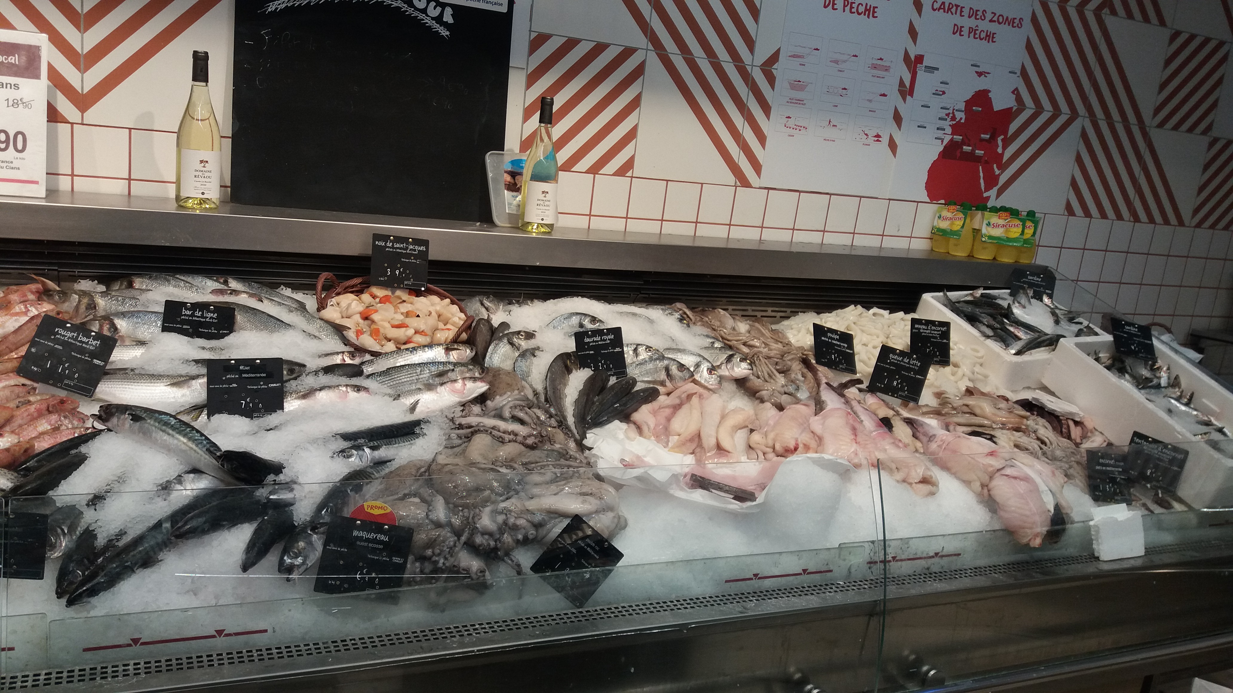 A peine entree ds le magasin une odeur de poisson terrible!!Ne mangez surtout pas leurs poissons vous risquez l intoxication!!!!!et l hospitalisation!poissons loin d etre frais! (Sauf par la glace!).Danger congre;truites;soles ;rougets!!!le responsable devrait faire son boulot!!.Ils ne datent pas de quelques jours ça c est sur!.Je l ai signale a l accueil !!Une Honte pour l enseigne