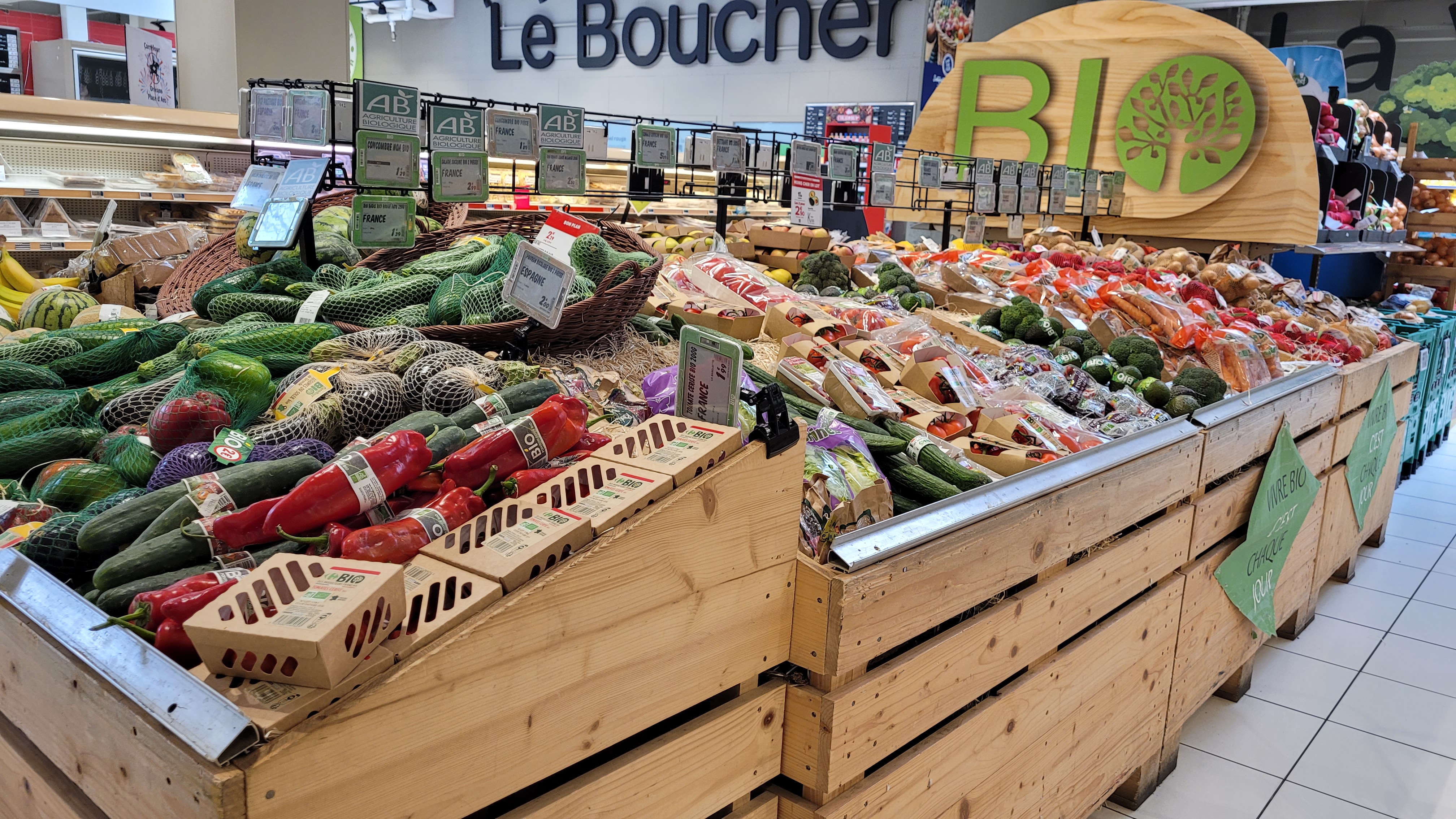Grande surface ' attention aux prix , gris problème d'affichage, et aux origines sur les rayons fruits et légumes