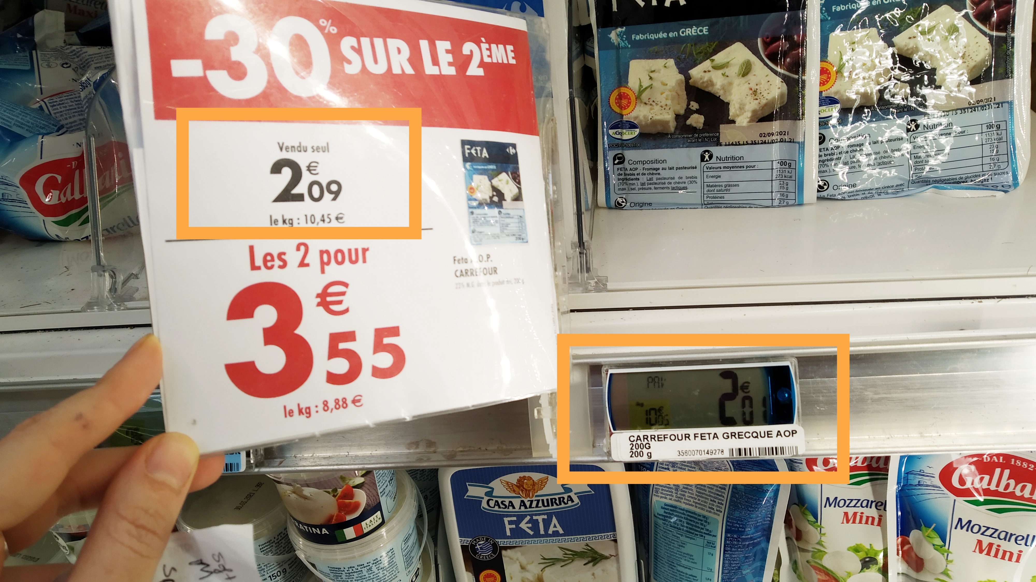 J'aime bien Carrefour (qui n'aime pas...?) mais je trouve que carrefour gonfle les prix pour faires des promos... Exemple dans ces deux photos, ou le produit SANS promotion est moins cher que le prix individuel indiqué dans la promotion... Exemple la mozzarella: sans remise prix unité 1.78€, avec remise prix unité 1.95€. En plus, dans cette promotion : -1er produit prix 1.78€ -2eme produit, réduction du 40%, réduction de 0.72€, total 1.06€. -1er produit + promo 2eme produit= 1.78€ + 1.06= 2.84€ et n'est pas 3.12€ comme cette Super promotion trompeuse...