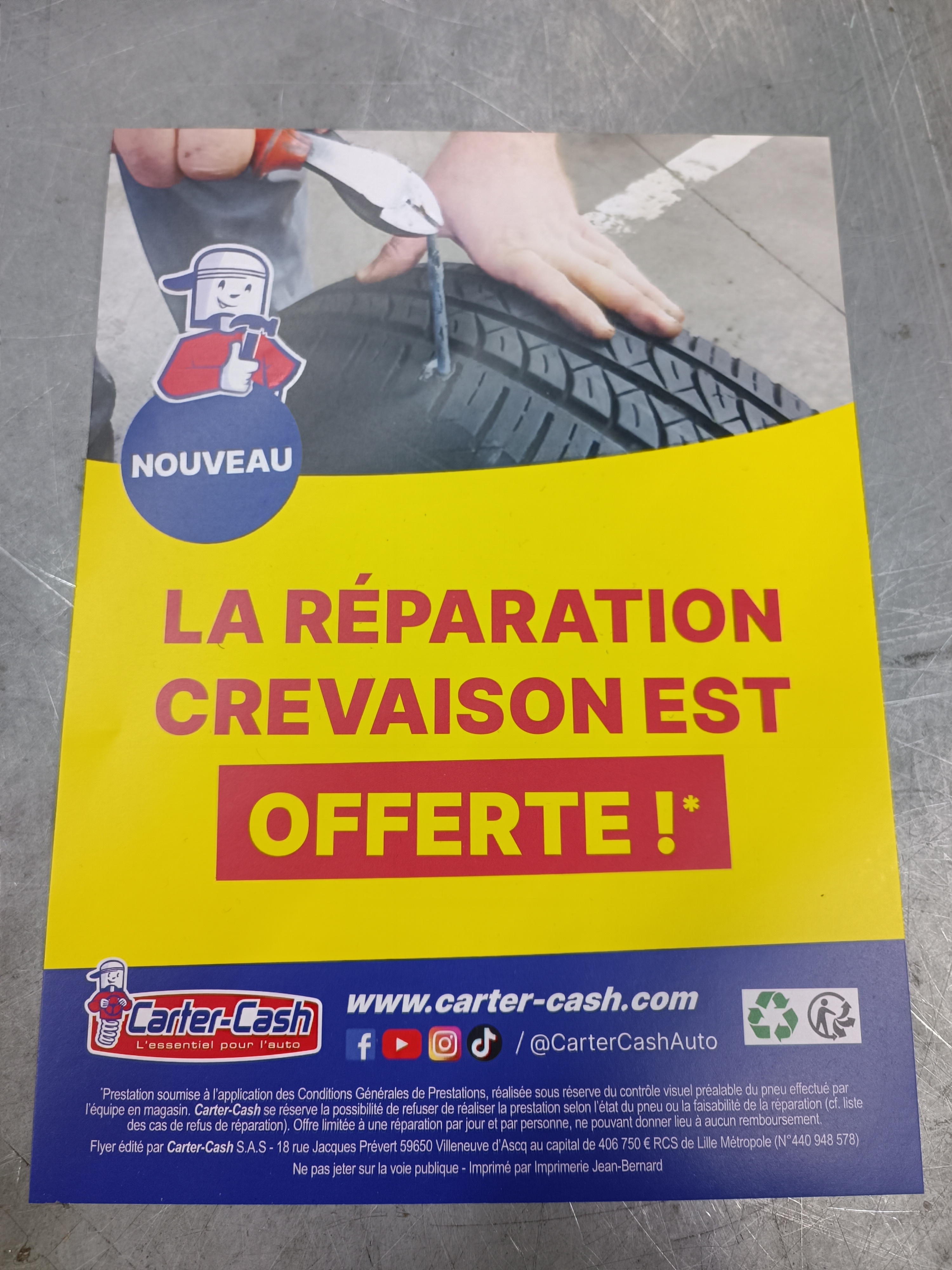 J'avais un clou dans mon pneu qui était encore en bon état ils m'ont mis une mèche par l'intérieur du pneu et refait l'équilibrage dema roue tout ça pour zéro euro merci carter-Cash
