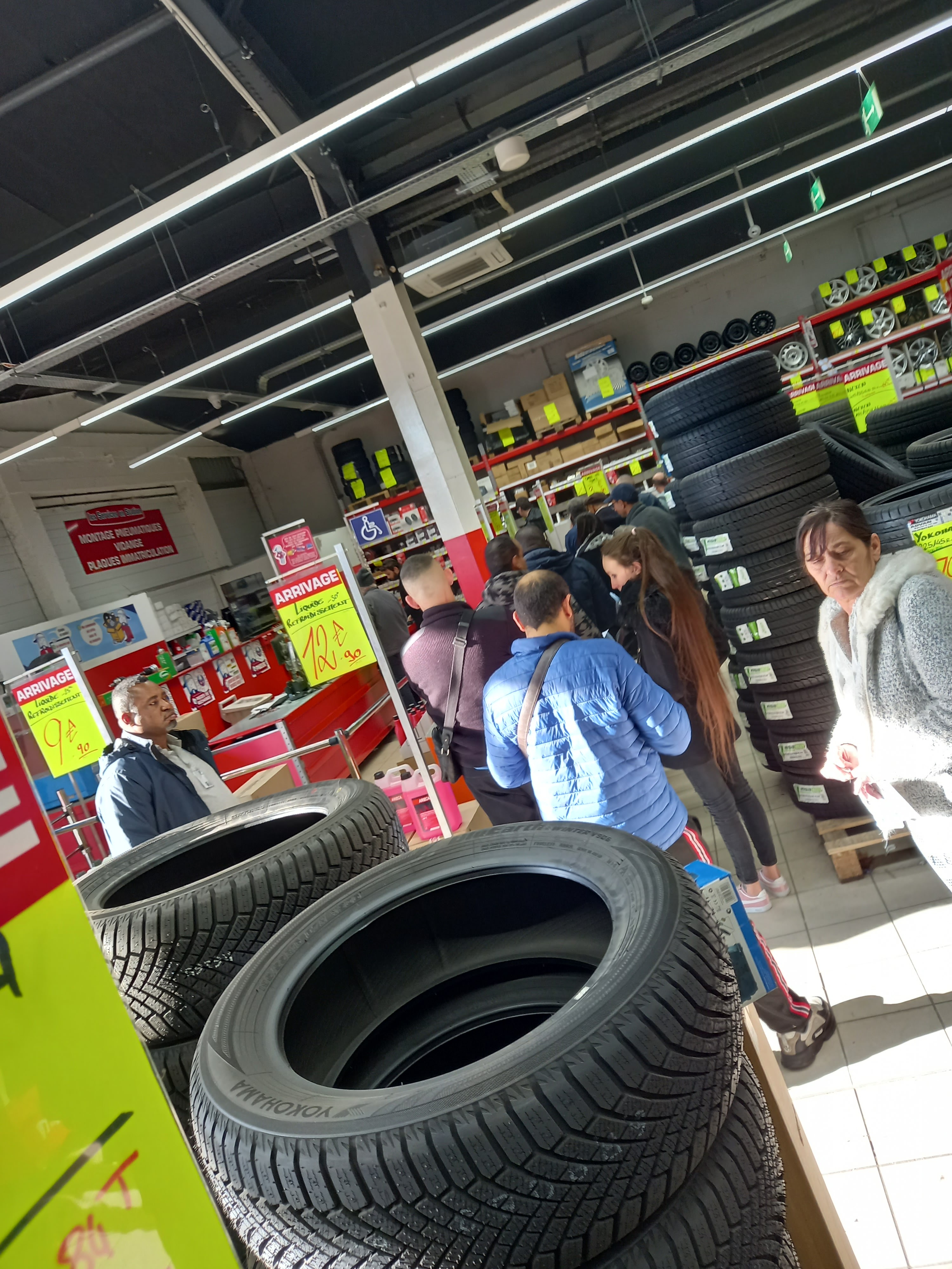 Dans le magasin bien arrivé à l atelier le Gars qui change les pneus voit son copain au fond de la file qui fait la queue et là il nous fait reculer pour le faire passer avant parce que il prêtent que sur la facture il est passé à la caisse avant tout le monde nous sommes le mercredi 6 févier a 17h s i au lieu de se mettre à la queue baussitot il est allé faire un tour 'ous nous avons payé et on c est mis à la queue Pourquoi on doit laisser passer les personnes qui payent et vont faire un tour ailleurs
