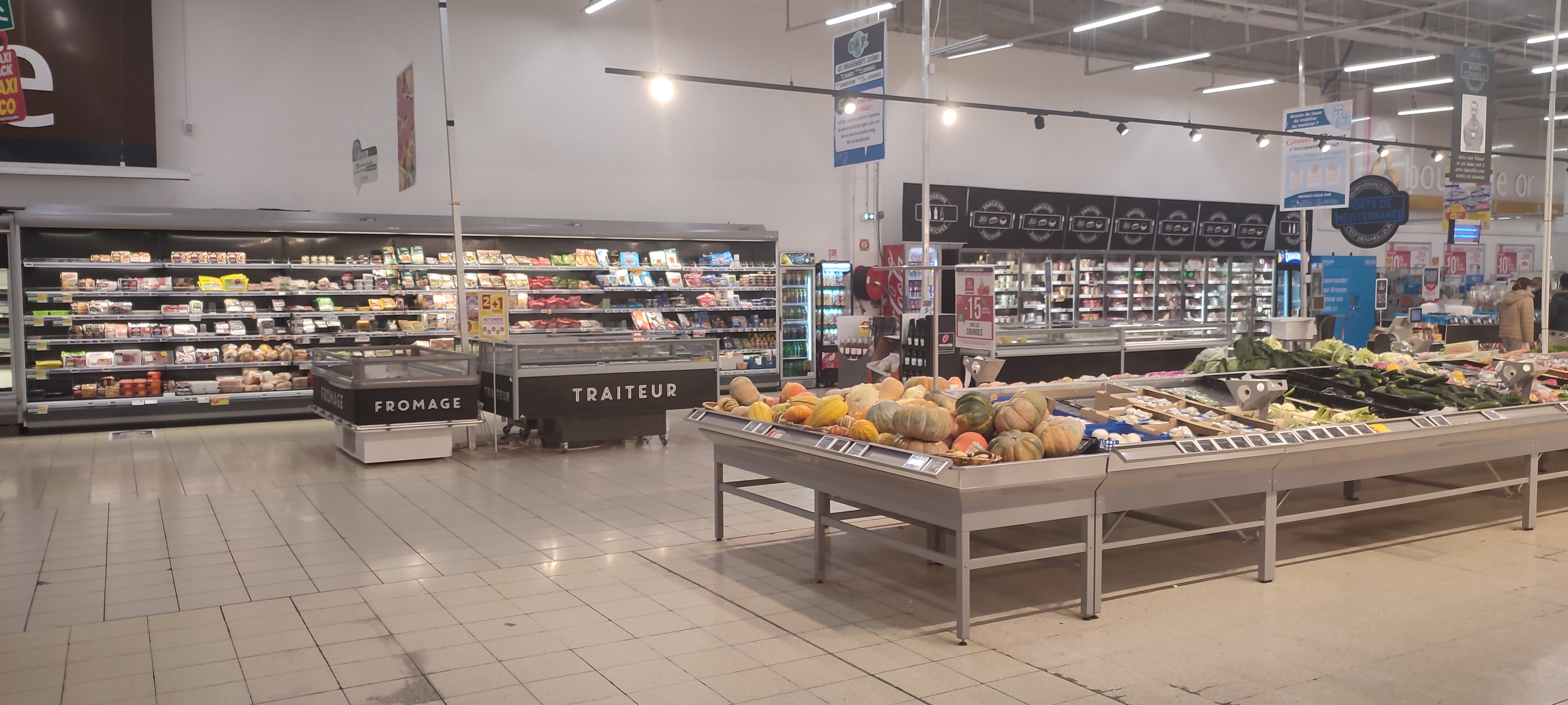Beaucoup de variétés de fruits. Moins de rayons viande et volaille. Problèmes récurrents de chariots.