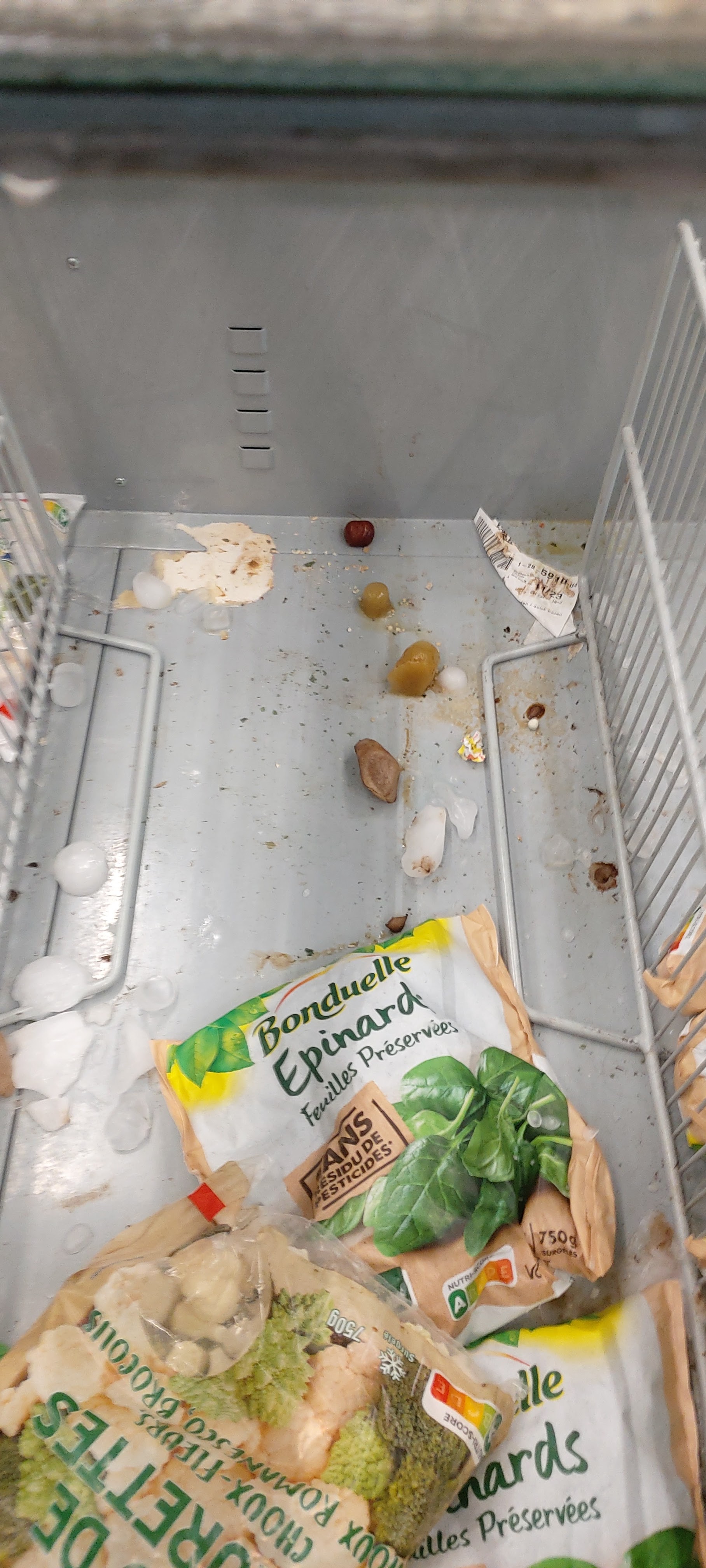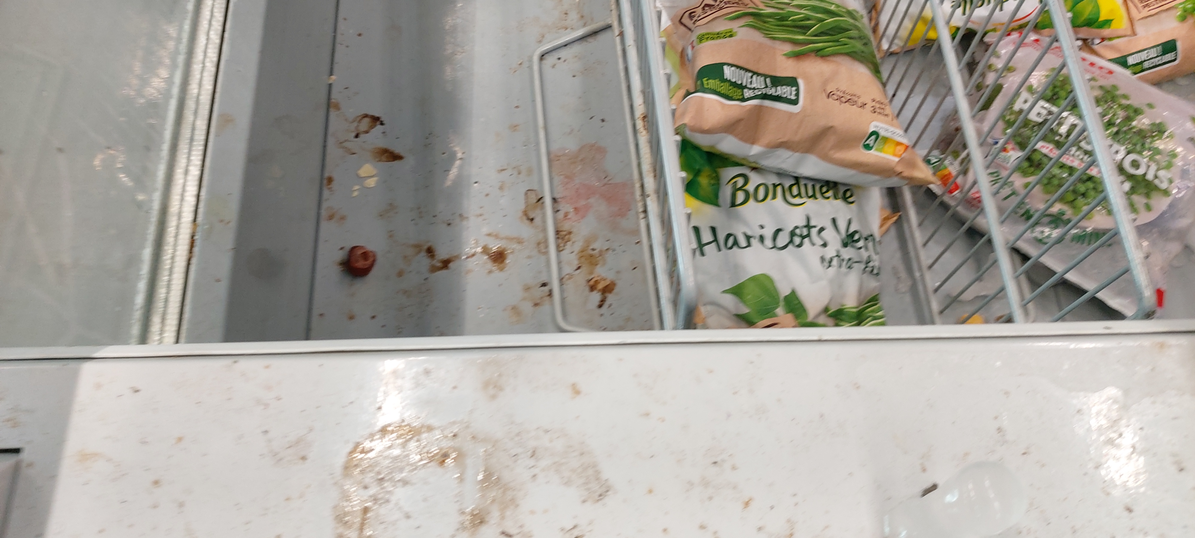Rayon surgelés à l’air libre, visiblement depuis longtemps, les produits sont pleins de glaces donc forcément impropres à la consommation et dangereux !