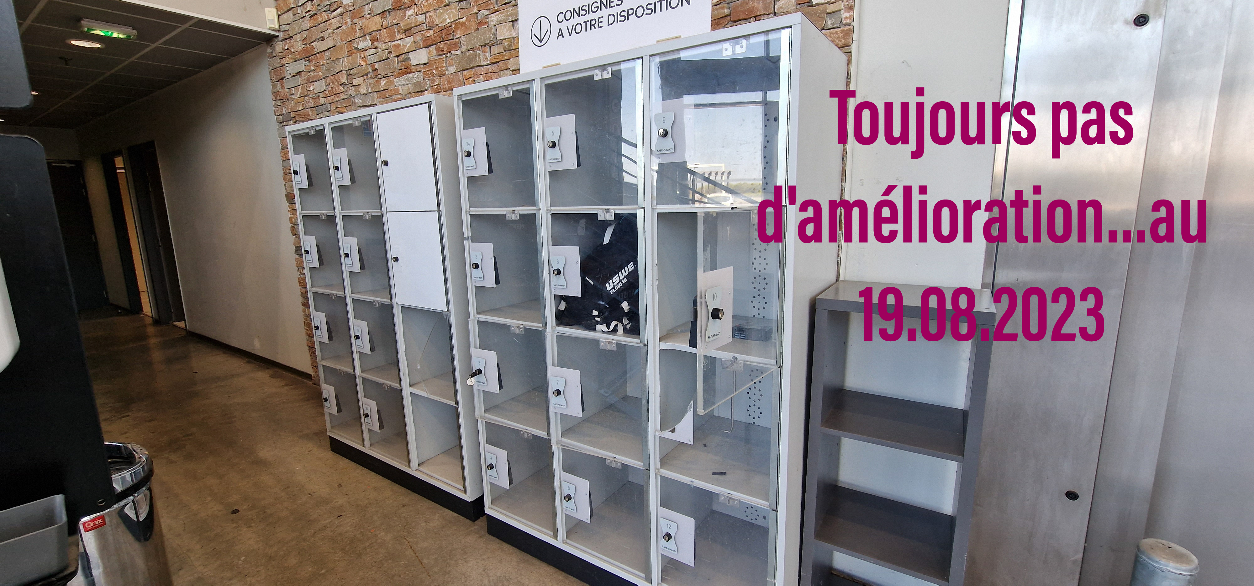 19.08.2023 : toujours aucune amélioration. Bientôt plus un seul casier ne sera disponible. J'ai vraiment du mal à comprendre l'inaction. Ce n'est pas comme si c'était quelque chose de caché. De plus les 2 encore en fonction sont difficiles à utiliser car les portes sont défectueuses...bonjour la sécurité. Et cerise sur le gâteau, hors de vue des vigiles... >> Post précédent en juillet... << Je mets une étoile pour espérer une réaction de la direction. Motif : les casiers de dépôts des affaires sont dans un état déplorable. Sur 24...seulement 2 fonctionnement, et encore, difficiles à fermer. Ne vont pas tenir longtemps. Et après...? Pas sécurisant du tout pour les affaires car hors de la vue des vigiles (à la sortie dzs toilettes). Quelque chose sera-t-il fait un jour ? Je dis un jour car cela fait longtemps (des années...) que ça se détériore.