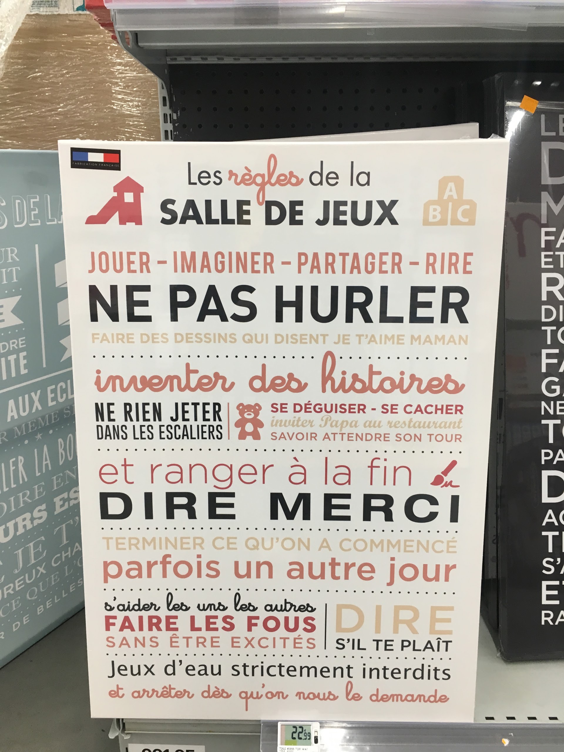 Déçue, miroir affiché à 29,90€ passé à 34,90€. La vendeuse a enlevé l’étiquette et l’a caché dans sa poche de jean afin de ne pas solder le miroir ! Ignoble.