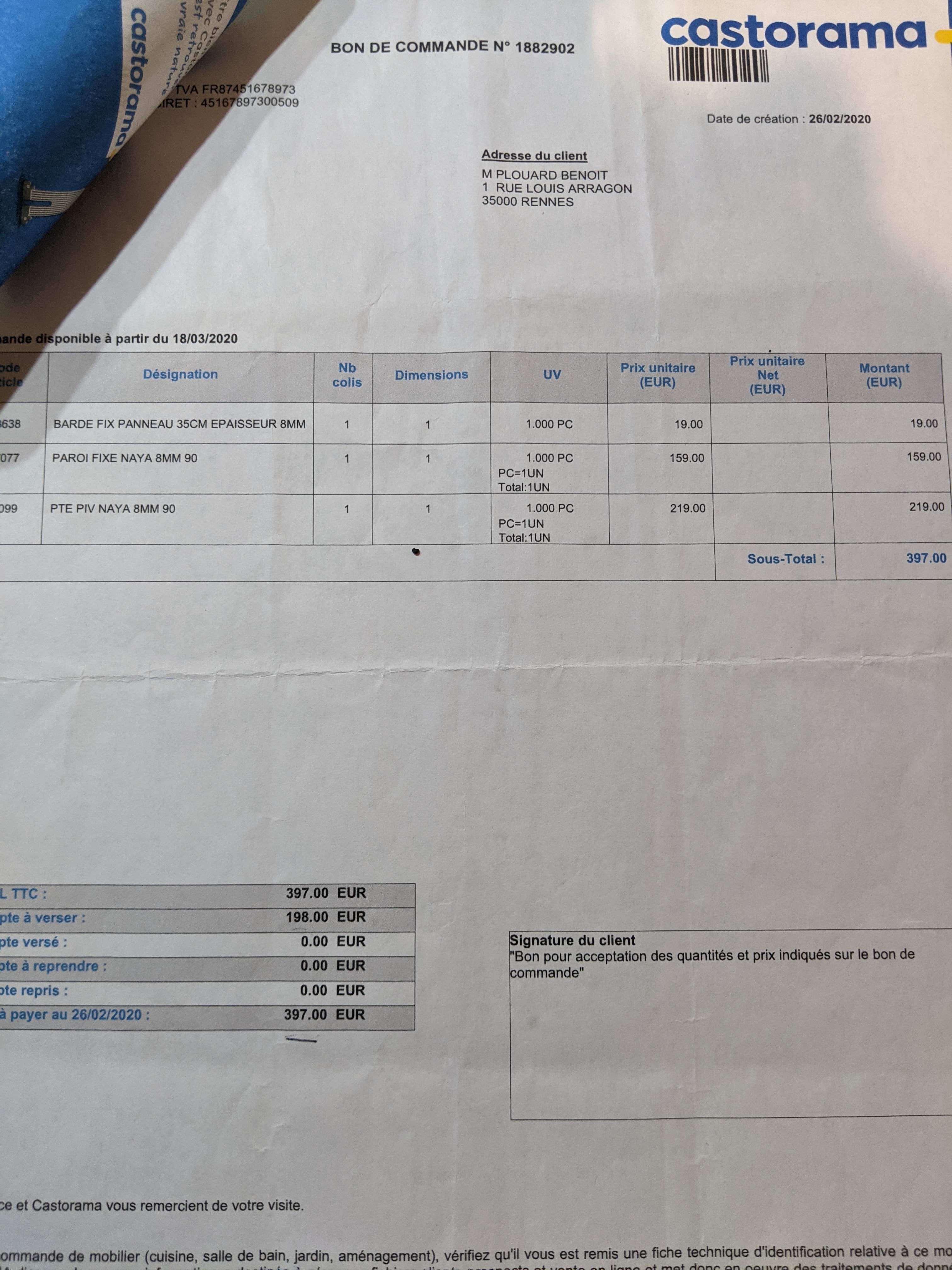Expérience au Drive déplorable: Commande du 2 mars et retrait du 3 mars Durée 1h20! Commande pas prête 5 personnes différentes Aucune excuse Aucune motivation à solutionner le problème ( alors que affluence très faible) Aucune considération du client Article facturé manquant et non remboursé à ce jour Aucune proposition d'articles de substitutions J'ai dû aller dans le magasin alors que je ne le souhaitais pas eu égard à la situation sanitaire Prix facturé différent du prix affiché en magasin 2 Réclamations depuis le site castorama sans réponses 2 Réclamations par Facebook messenger transmission à la directrice de l'établissement Mme So.... GA.... Aucune réponse plus d'un mois après!!! J'attends toujours le traitement de ma réclamation et le remboursement.