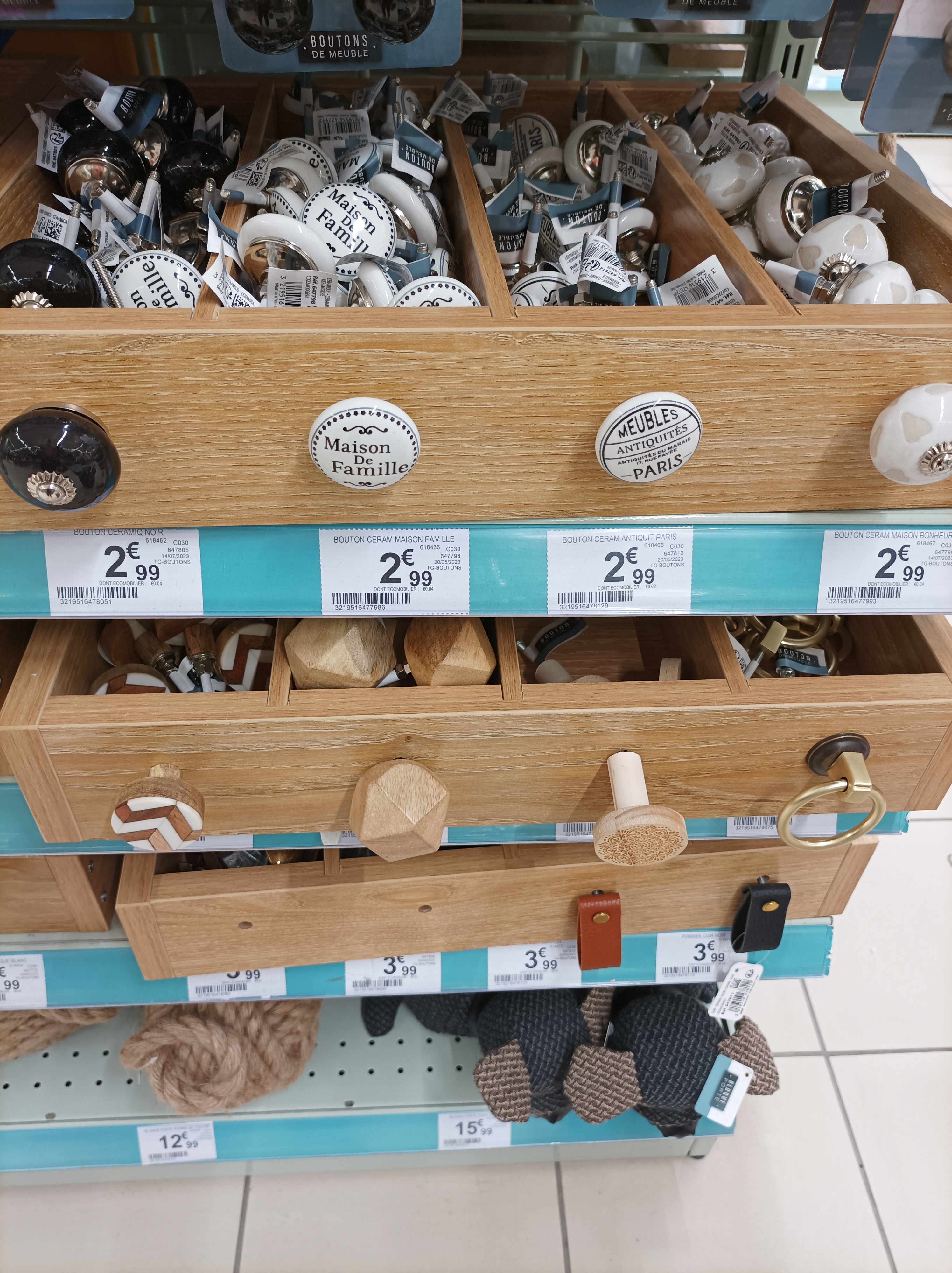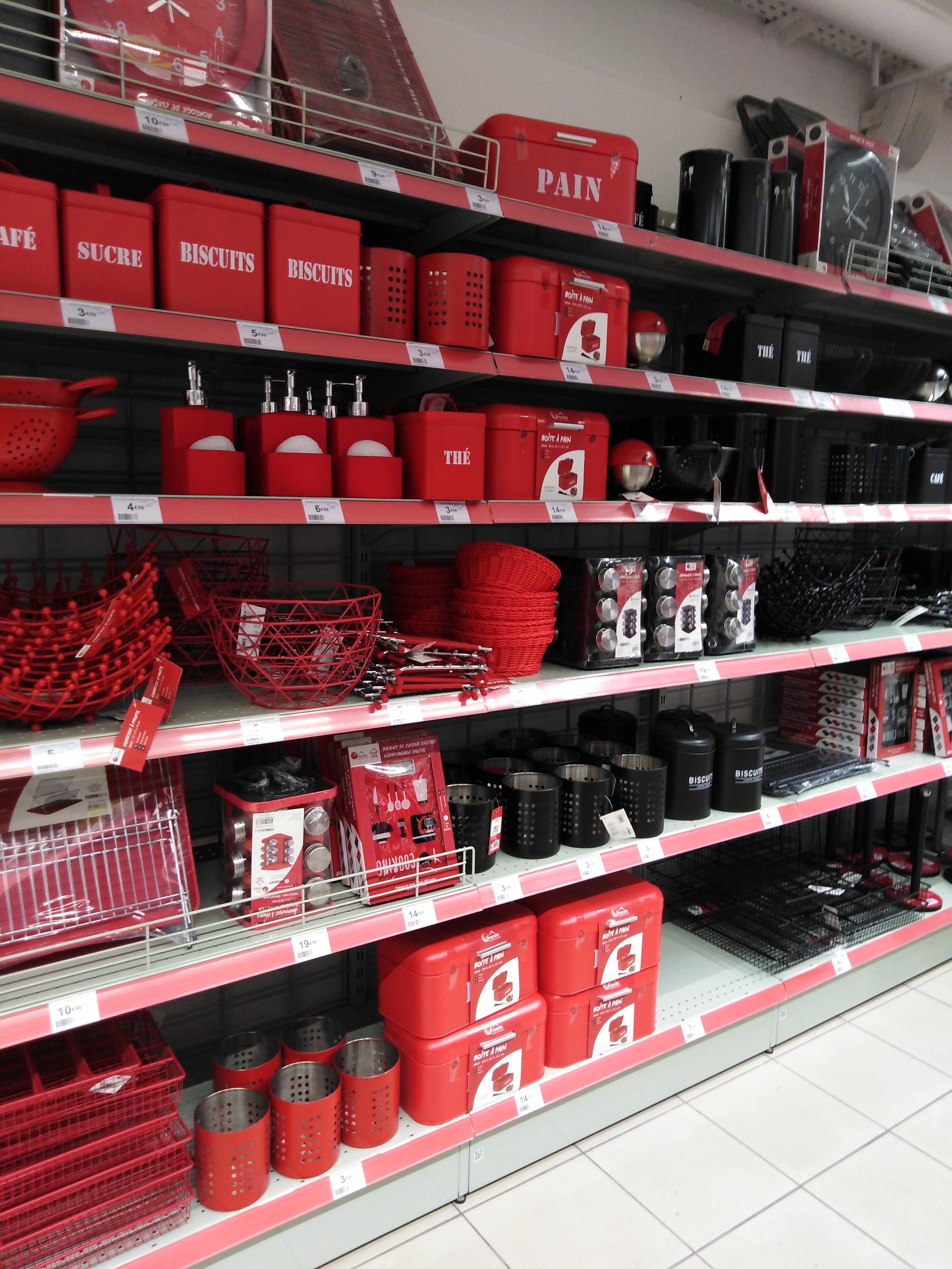 On trouve tout les produits de la maison ustensiles de cuisines, articles salle de bains, draps, voilages, objets décoration, des meubles et au premier étages en fonction des périodes thèmes halloween, Noël, anniversaires etc. Assi un rayon de tissus, articles coutures , confiseries. Tu pars pour une choses et tu sors avec 10...