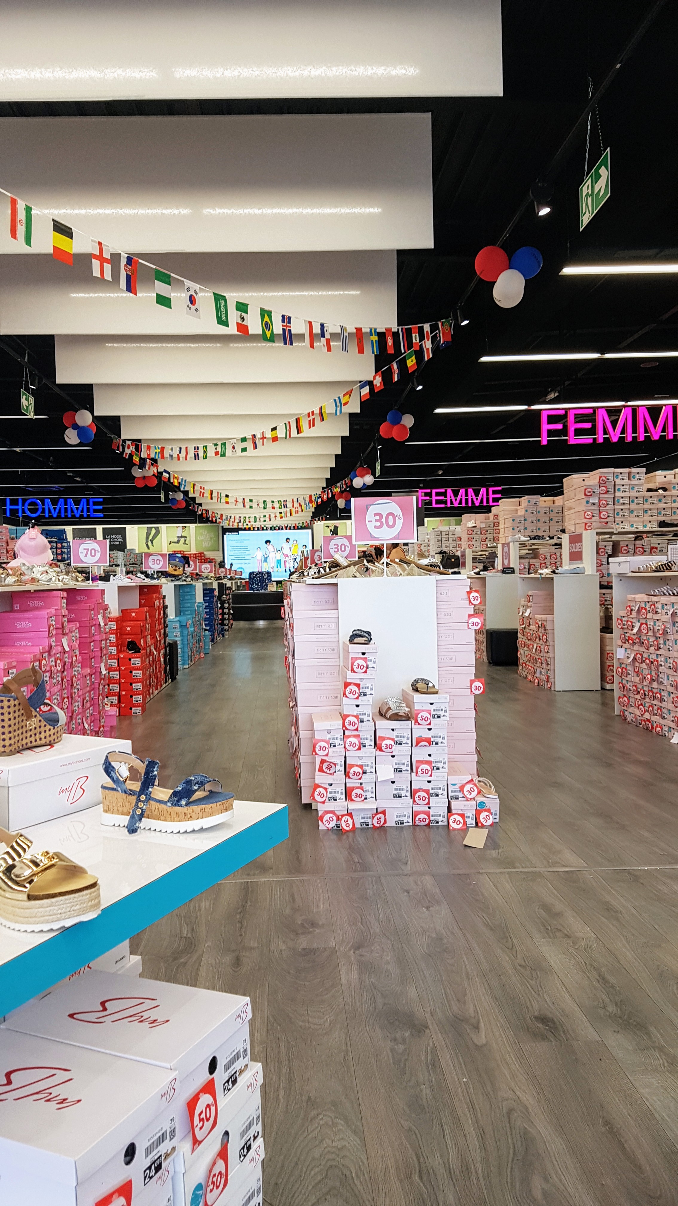 Le magasin est très grand. Chaussures pour enfants, femmes et hommes. Il y en a pour tous les goûts, de la basket, tong, sandales, bottes ect. Les chaussures ne sont pas très chères, sont de qualités ( tiennent 1 an ). Ils vendent aussi des chaussons, et quelques accessoires : lunettes, chapeau, chaussettes. Les allées sont espacées donc la distance pour covid est bien respecté. Vendeurs sont très gentils.
