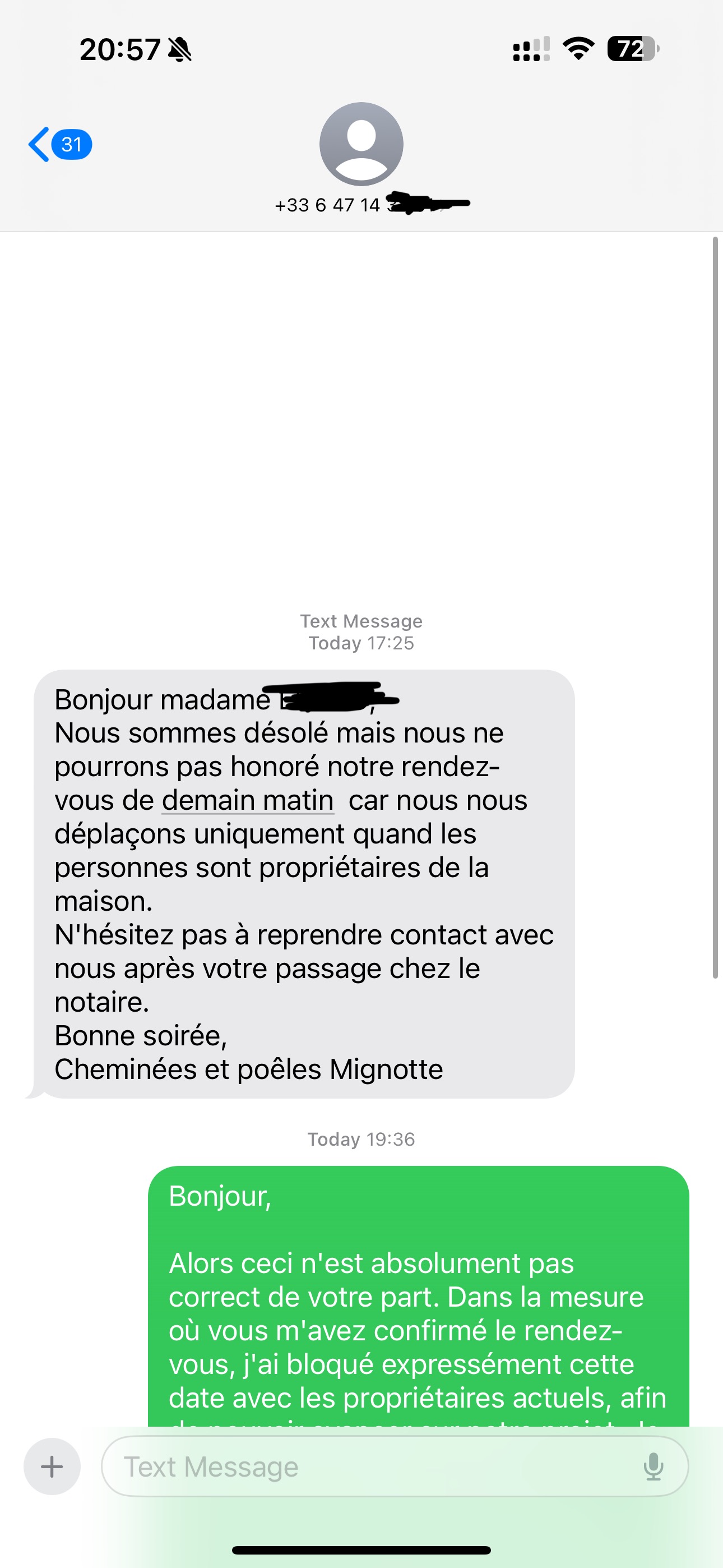 À fuir absolument, Voici le message que je reçois la veille de mon rendez-vous. Absolument pas professionnel. Je vous déconseille ce professionnel et vous conseille plutôt de vous orienter vers des professionnelles réactifs et surtout qui ne vous prévient pas la veille de votre rendez-vous avec un vulgaire SMS.