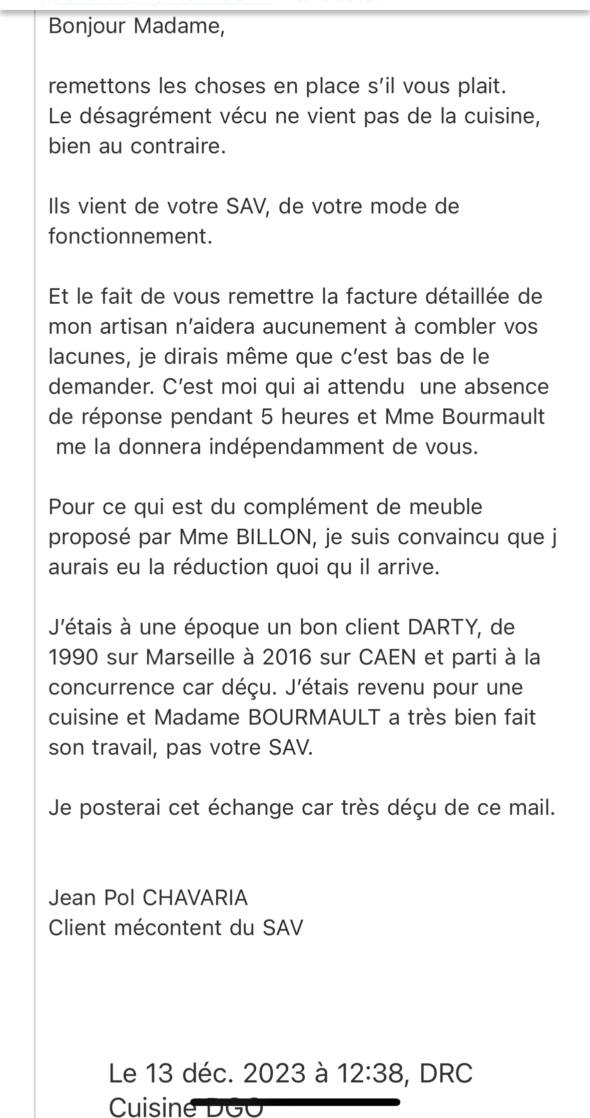 Je me permets de vous écrire afin de faire part de mon mécontentement vis-à-vis de l'expérience récente que j'ai eue avec deux vendeurs du magasin Darty de. Cette expérience a été malheureusement très décevante et je souhaite partager mon avis. Lors de ma visite au magasin, j'ai été pris en charge par deux vendeurs, l'un jeune et inexpérimenté, et l'autre se présentant comme étant un vendeur expérimenté. Malheureusement, ma demande concernant l'achat d'un sèche-linge avec une évacuation appropriée n'a pas été traitée avec le sérieux et la compétence attendus. Bien que je comprenne que le vendeur jeune puisse manquer d'expérience, j'aurais apprécié qu'il fasse preuve de plus de détermination pour répondre à mes questions. Cependant, c'est le comportement du vendeur expérimenté qui m'a le plus déçu. Celui-ci a non seulement fait preuve d'un mépris flagrant envers ma demande, mais il a également manifesté une attitude condescendante en me précisant qu'il était juste vendeur. Je suis parfaitement conscient que les vendeurs ont pour rôle de proposer des produits et de les vendre. Néanmoins, je considère qu'il est de leur responsabilité de fournir des informations pertinentes et de qualité aux clients, en particulier lorsqu'il s'agit d'une question technique telle que l'évacuation d'un sèche-linge. Je déplore le manque de professionnalisme et d'engagement de ces deux vendeurs, qui ne reflètent pas les standards élevés de service que j'attends de la part de Darty. En tant que cliente, je suis en droit d'attendre une attention et une assistance adéquates de la part de vos collaborateurs. J'espère donc que vous prendrez en considération ma remarque et que vous veillerez à ce que des mesures soient prises pour améliorer la qualité de service offerte par vos vendeurs.
