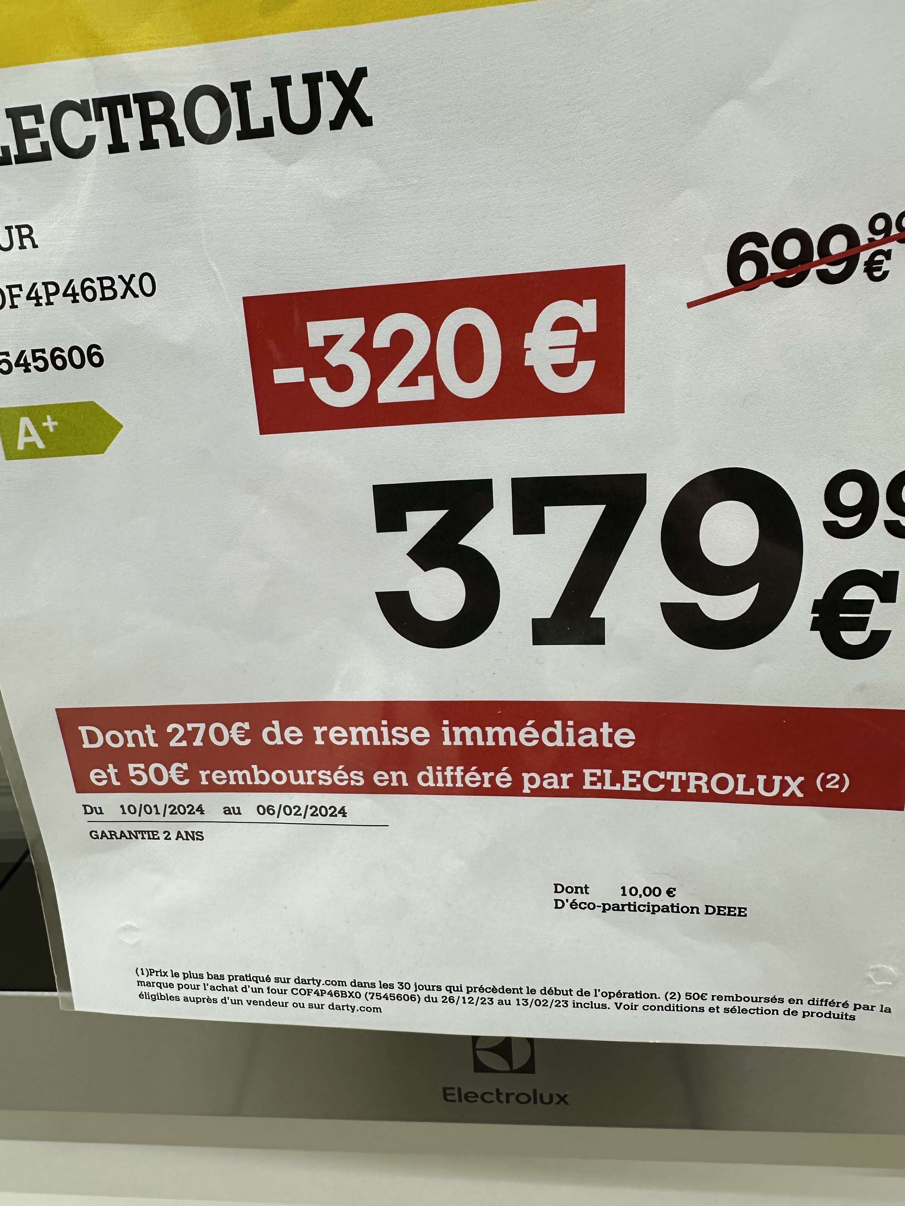 Darty ma fait payer 50€ de plus que le prix affiché qui devaient être remboursé par Electrolux. Ils ne le seront pas et le chef de magasin de nation a été de mauvaise foi et très impoli. Ils refusent de me rembourser cette somme