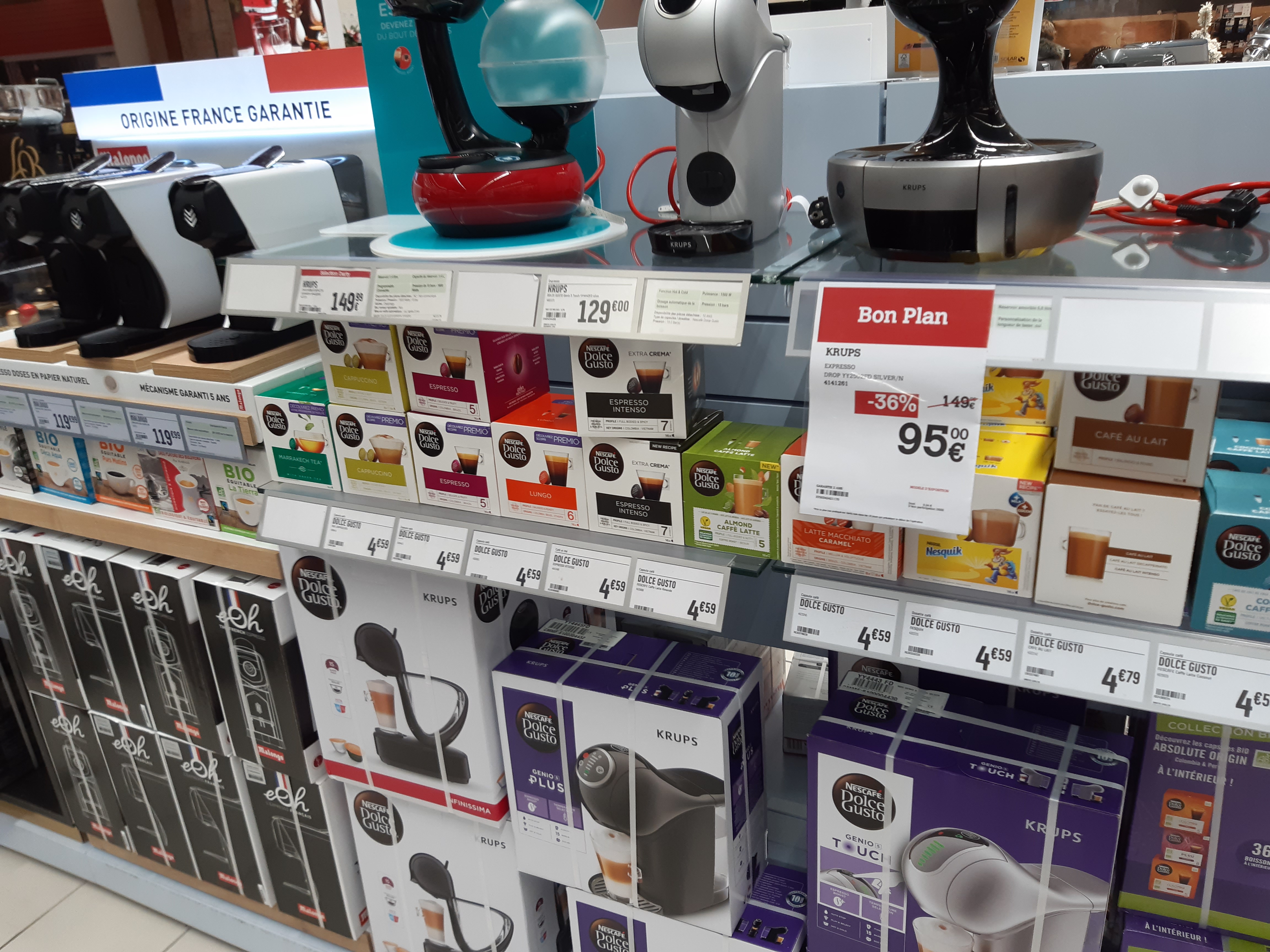 Beaucoup de Choix d'équipements. Je voulais 1 NESPRESSO, qu'il y avait dans 1 couleur qui ne me convenait pas, c'était pour 1 cadeau. 1 Conseillère m'a dit que leur couleur allait dans toutes les cuisines (Ah bon ? Vous en êtes si sûr que ça ? )... ...elle m'a également dit que si je prenais 1 Abonnement de capsules, j'avais l'appareil à 1€. Étant donné que l'appareil n'était pas pour moi et que la personne boit peu de café, aucun intérêt d'un abonnement. l'Abonnement + la Couleur + la Manière d'aborder le client => Je l'ai acheté ailleurs...