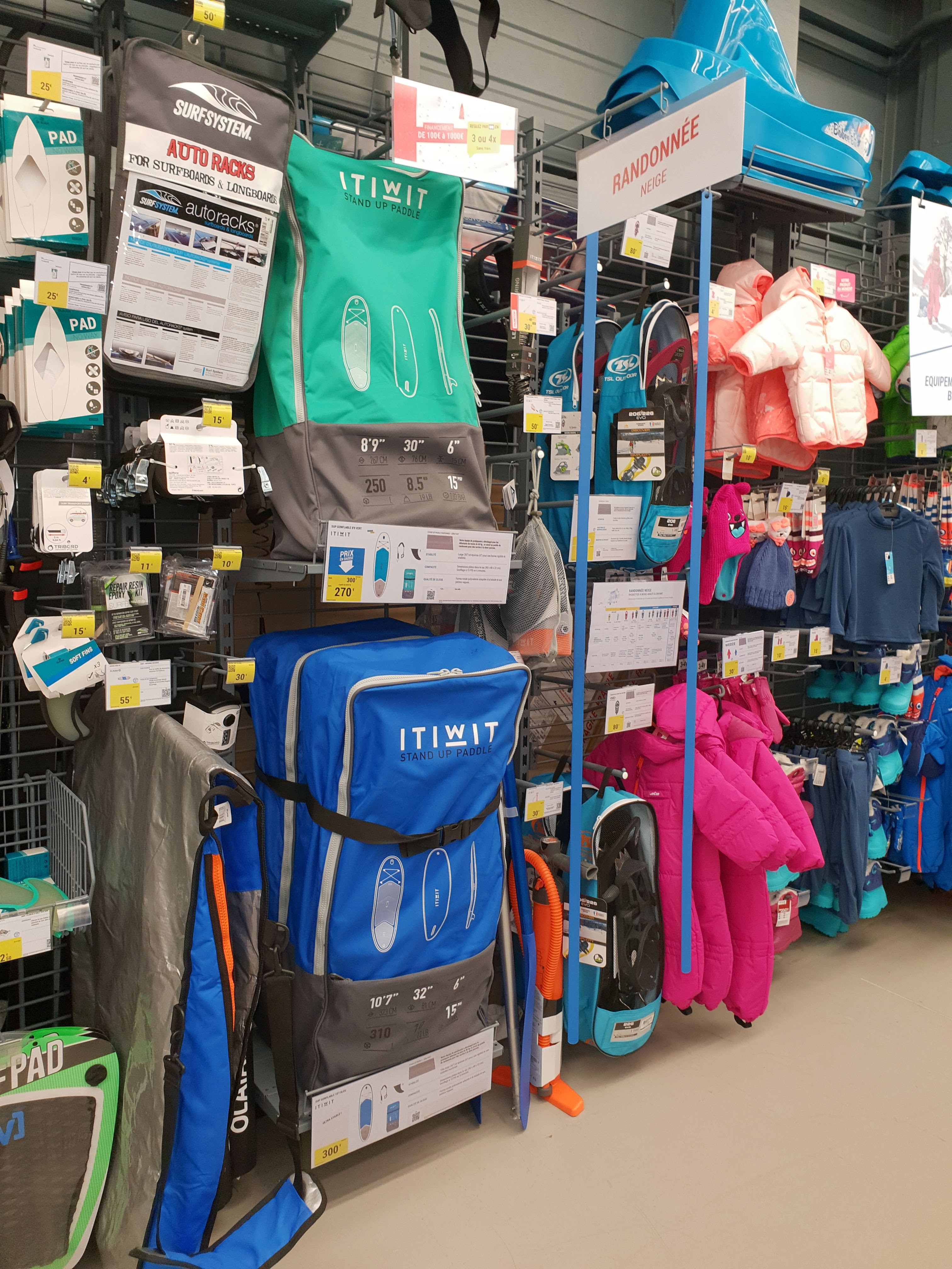 Petit Décathlon, simple et rangé, où vous trouverez le minimum, au prix décat.