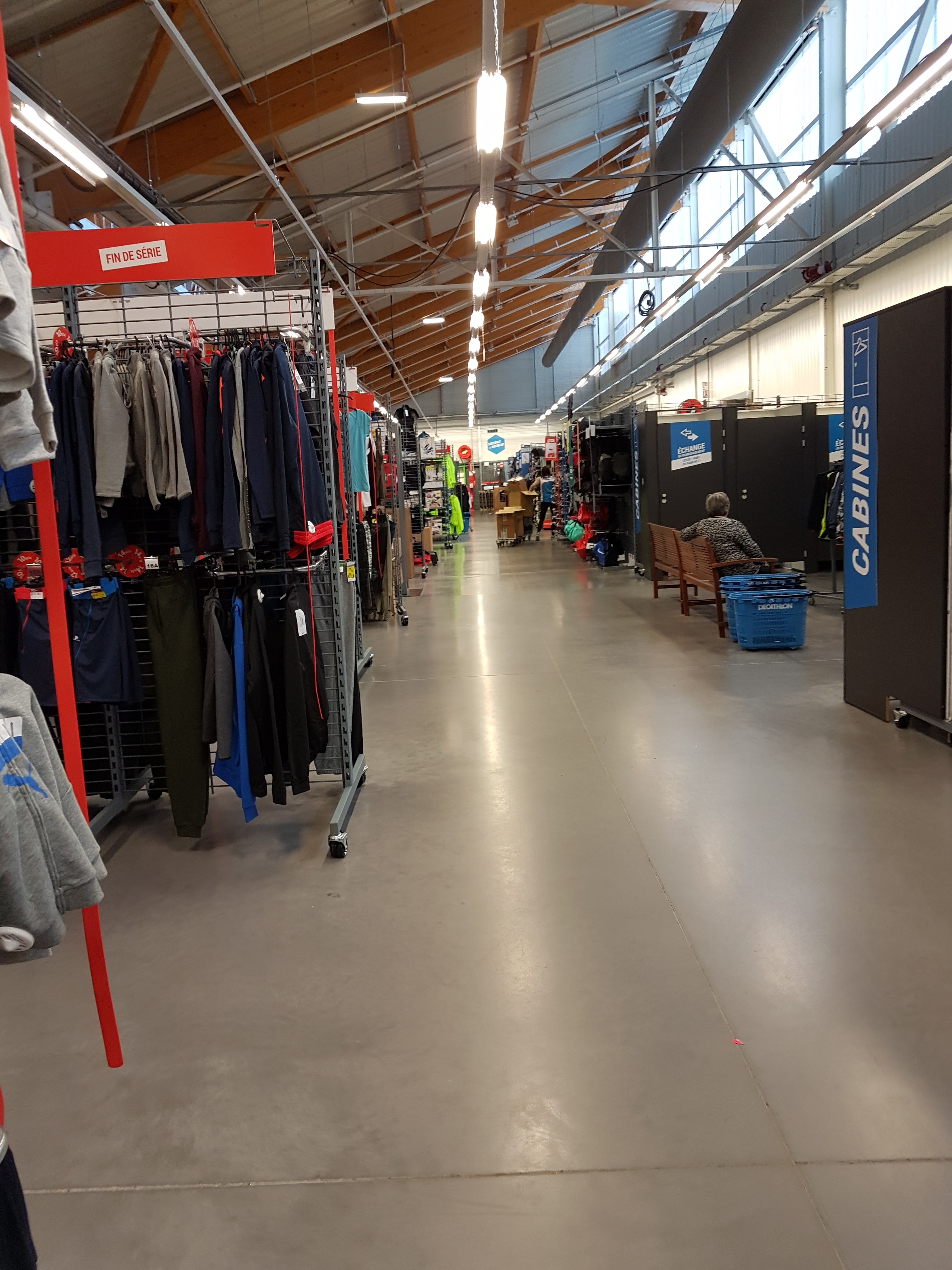 un endroit pas trop indiqué, on ne sait pas où se situe l entrée et il n y a aucun affichage pour y accéder.une fois à l intérieur, on retrouve facilement ce que l on veut car les rayons sont bien repérables avec un rangement selon les divers sports.c est pratique et efficace.par contre il y a des mélanges entre les étiquettes fin de série et les autres du coup on s'y perd . la caisse, il faut chercher comment y accéder, pas d affichage et uniquement des caisses électroniques alors pas pratique pour avoir de l aide . néanmoins l accueil est agréable et les produits sont de bonne qualité.