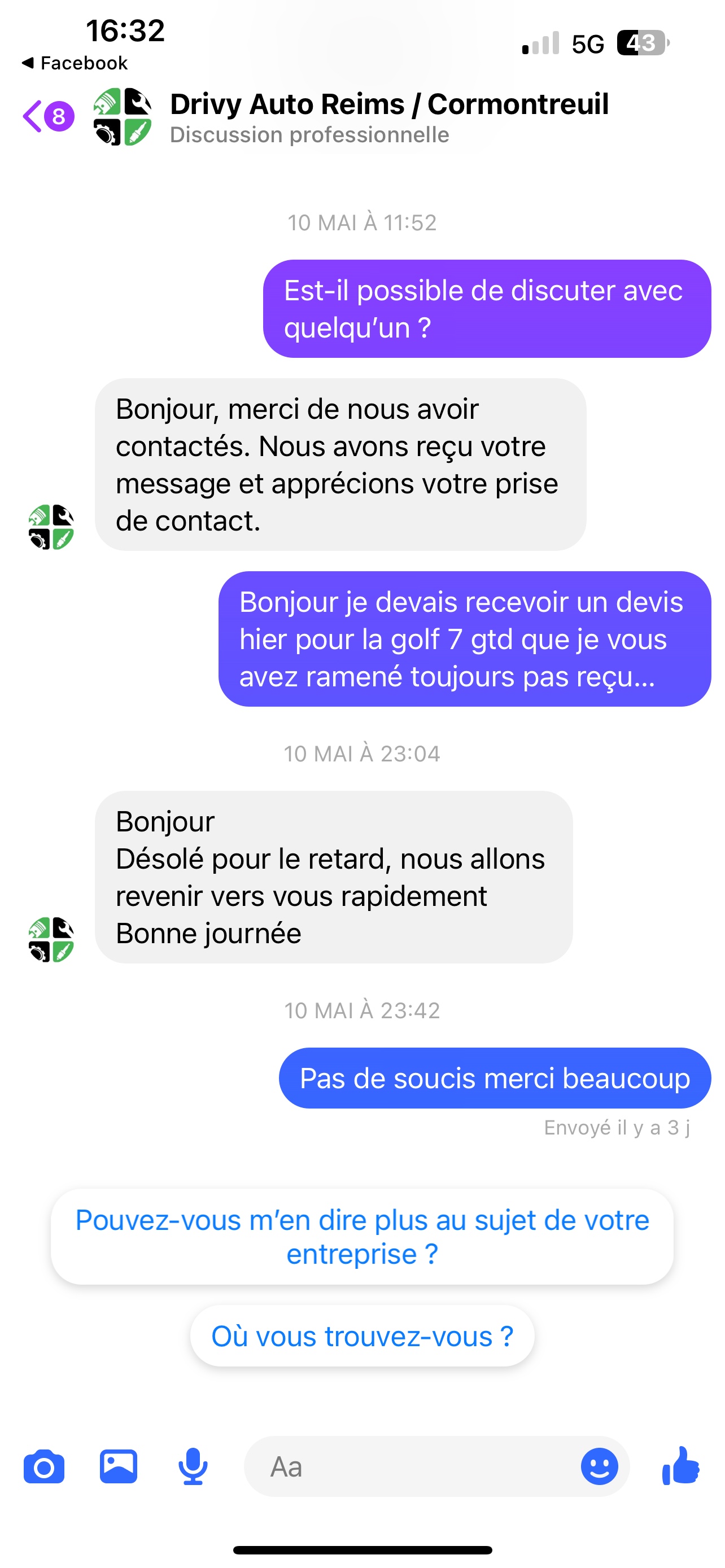 Je ne voulais pas mettre cette note là mais vous m’y obliger. Personnels sympathique rien à dire par rapport à ça mais probablement le seul point positif à tout ça. J’ai ramené ma golf 7 GTD pour un problème moteur donc diagnostic (30€ pour regarder à l’œil) et (60€ pour une recherche de panne moteur) total 90€ pour une recherche. Dans un premier temps la voiture est gardé 4-5 jours sans que j’ai de nouvelle à vous d’appeler pour en avoir donc aucun suivi de ou en est la voiture. Ensuite après avoir appeler on me dit que je peux venir chercher la voiture et on m’annonce que le mécano va me préparer le devis pour les réparations, résultat j’arrive sur place pas de devis, on me dit je l’aurais jeudi, 2 jours après, toujours pas de devis, je les contacts on me réponds, nous allons revenir vers vous rapidement… effectivement 4 jours plus tard toujours pas de devis ni de prise de contact. Alors maintenant où est le problème ? Peur de démonter un moteur ? Vous en avez pas la capacité ? Résultat je ne sais même pas ce que je dois réparer parce que on vous donne rien du tout comme information sauf à l’oral comment voulez vous retenir tout ça. Ah si juste que le moteur va mal, bref je vous le déconseille