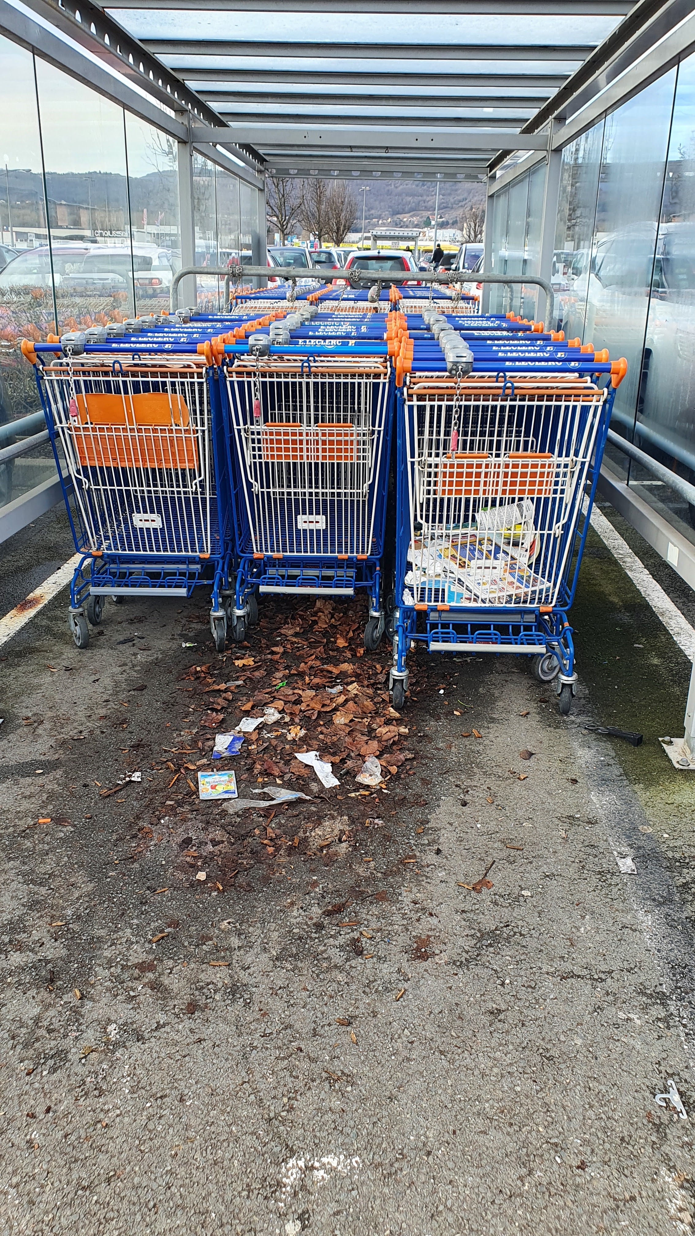 Nous réalisons nos achats toutes les semaines depuis 7 ans dans ce Leclerc. Nous constatons à chaque visite, que les caddies et zones de stockage extérieures sont systématiquement encombrés de déchets, et ne sont pas nettoyés. Il y a clairement un manque d'entretien en comparaison des autres grandes surfaces de la région, et un manque de respect de certains clients qui jettent tous leurs déchets dans les caddies...
