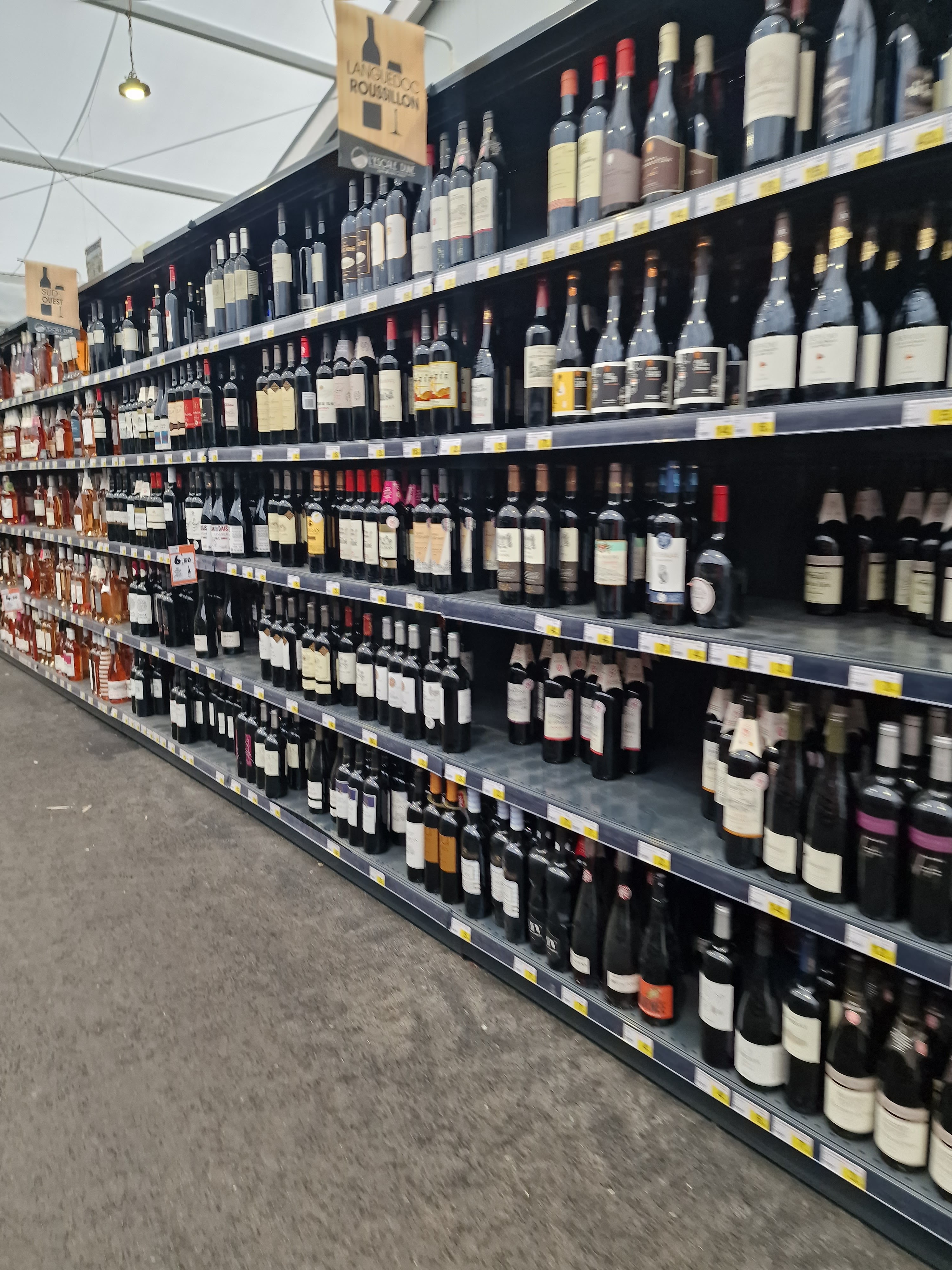 Supermarché en travaux. Il faut faire ses courses sous un chapiteau avec le sol en macadam du parking. Il manquait la moitié des produits qu'on recherchait. Peu d'éclairage. Les réfrigérateurs sans lumière (on peut se demander s'ils étaient branchés) On est reparti sans rien acheter.