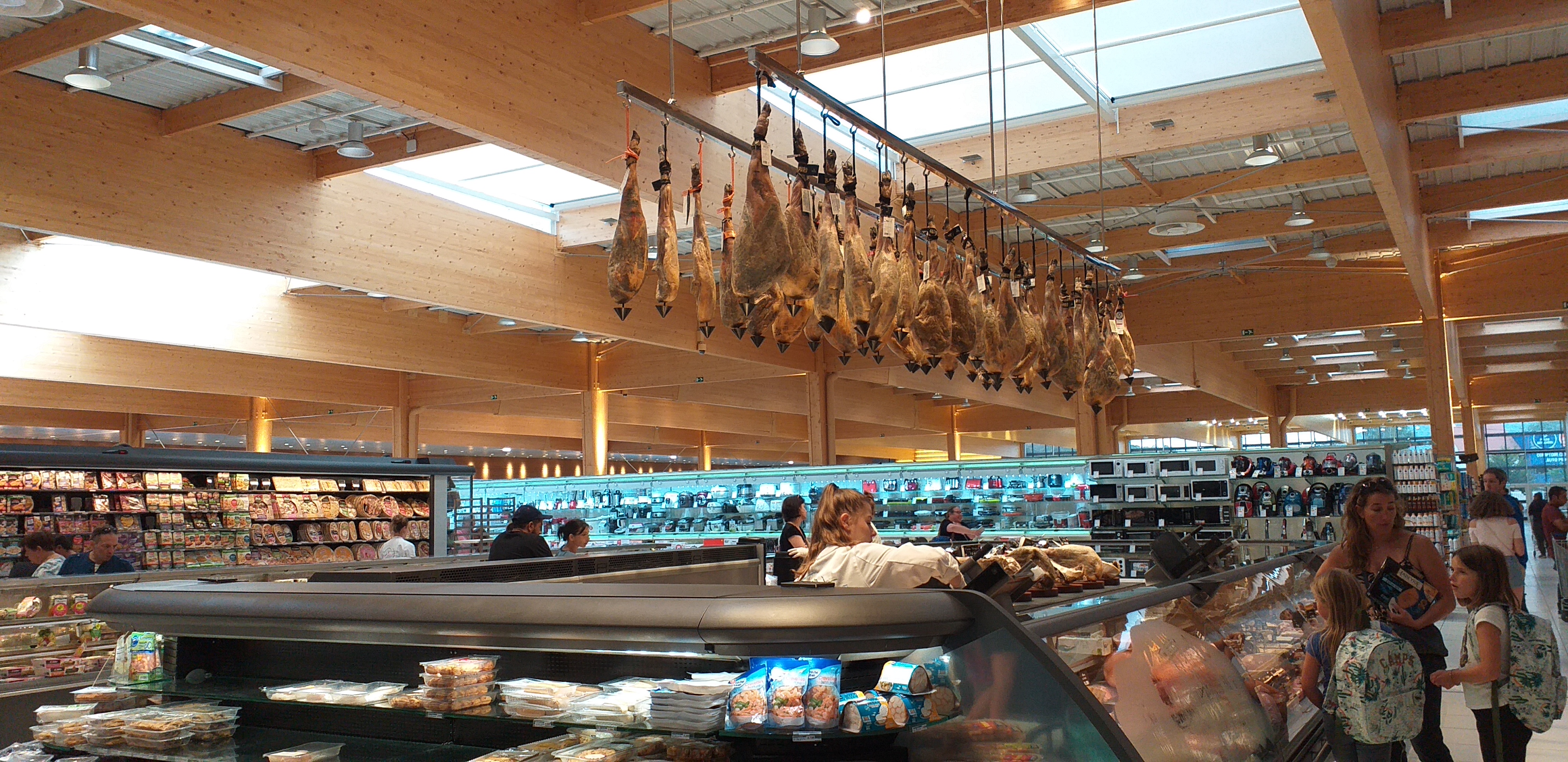J'ai bien aimé voir les pièces de jambon accroché en haut dans le magasin , original pour une grande surface