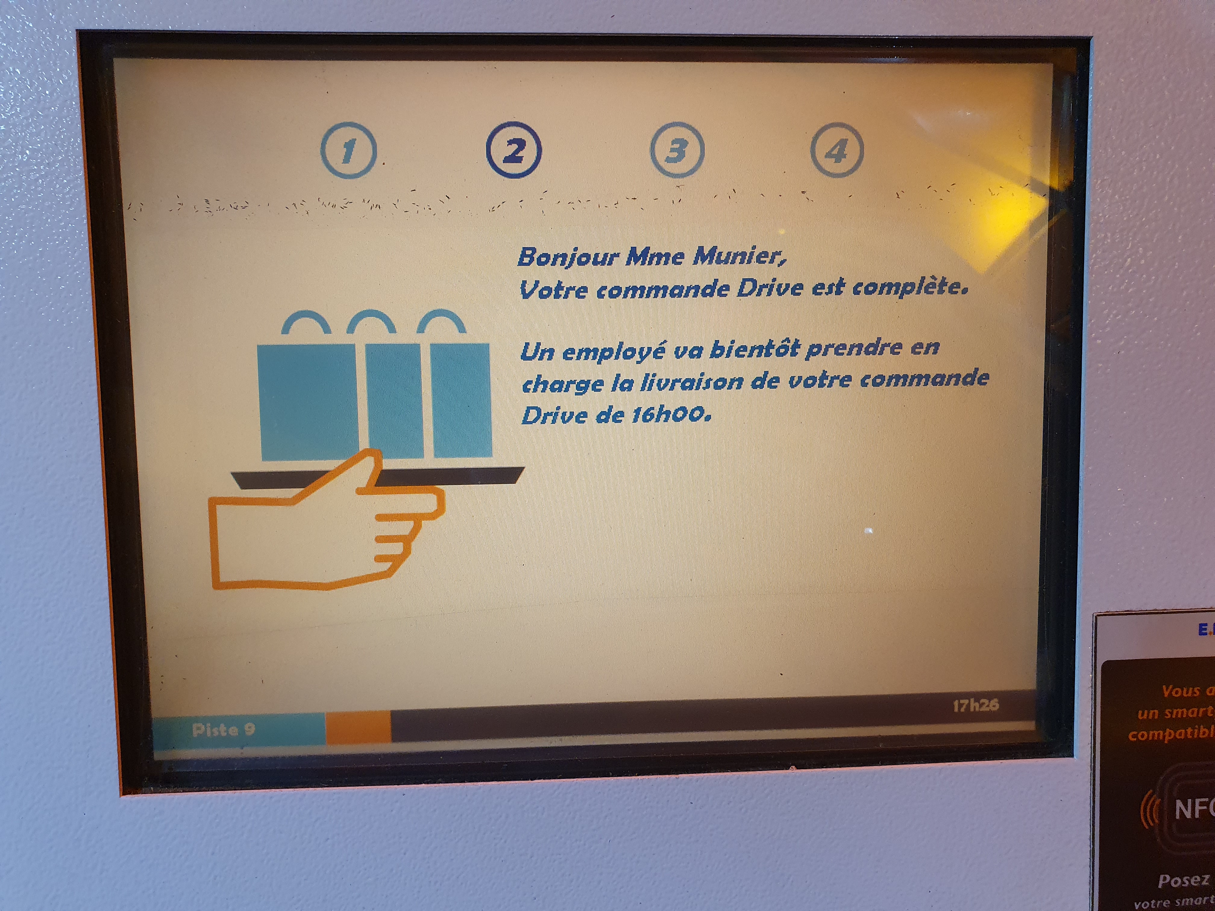 Pour une première visite, bah globalement c'est raté ! J'arrive à la borne, après avoir fait la queue (16 h 45 en semaine....) Et je passe ma carte. J'ai un message aucune commande ne correspond ou un truc dans le genre. Obligé d'aller sonner à l'accueil où j'ai bien été reçu. Ils ont retrouvé ma commande (ouf, encore heureux, j'allais pas m'asseoir sur 95 balles de courses ! ), mais j'ai dû patienter un peu plus longtemps que la normale et mon seuil de patience a failli être atteint. Autant dire qu'on a frôlé l'incident diplomatique.