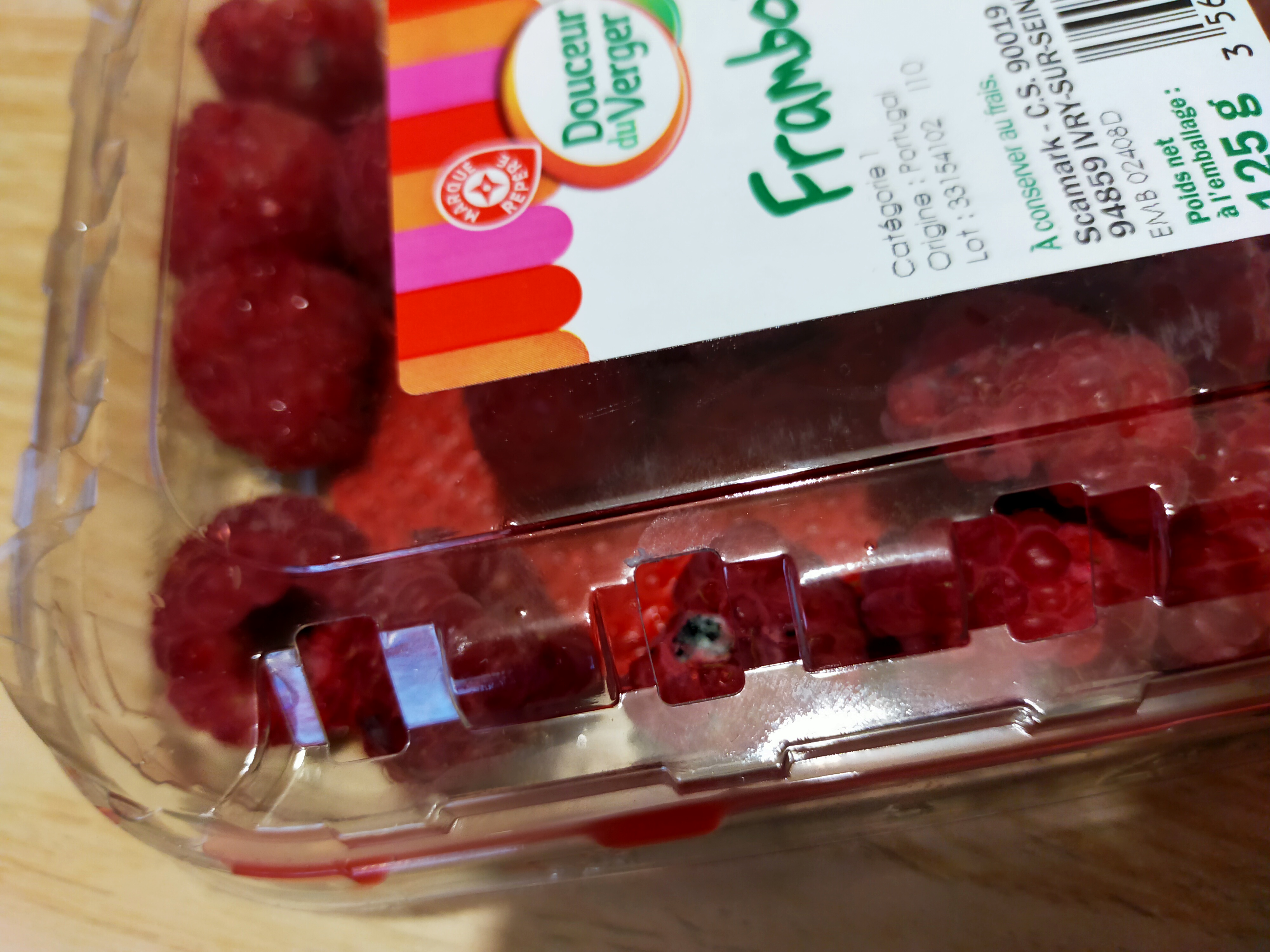 Nous avons commandé des fruits pour faire un dessert, voici ce qui est livré ce jour (16/09/21) retiré a 17:40. Je ne recommande pas ce drive pour la commande de produits frais ils ne vous filent que des invendus. Sur ~30 framboises plus de 20 ne sont pas bonnes, non, elles sont MOISIES !!! On vous les livres bien emballées au fond du kraft que vous ne vous en aperceviez pas. Ce n'est pas seulement pas frais c'est moisi. Une honte en rayon ce n'est jamais le cas. Fuyez. Commande au nom de LETELLIER code barre (n°commande 21097384) du 16/09/2021 a 12:31