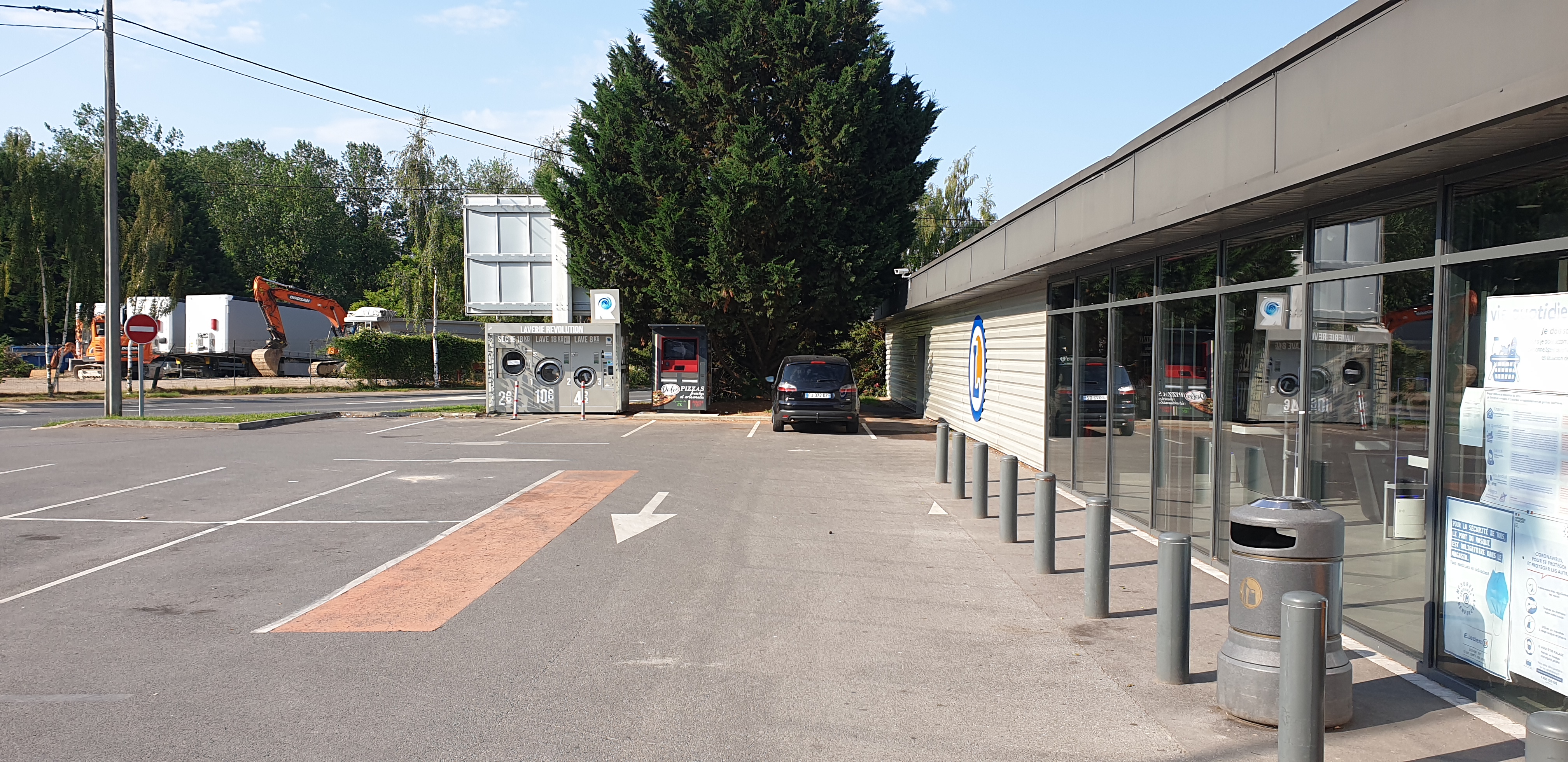 Magasin agréable propre avec une laverie sur le parking et un distributeur de pizzas