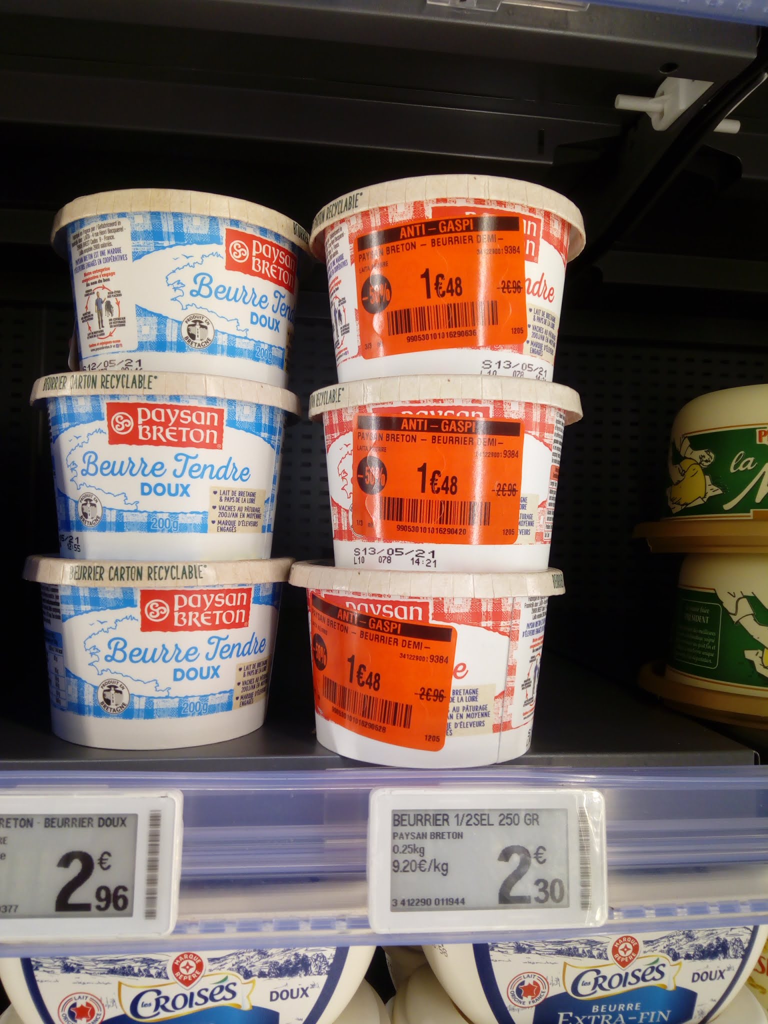 Cette fois -ci c'en est trop !!! J'habite à coté de Lourdes et je viens faire souvent des courses au Leclerc. Quasiment à CHAQUE fois, il y a quelque chose qui ne va pas. Cette fois ci, J'ai acheté un Boursin aux noix à -50% (lutte contre le gaspillage). J'ai juste vu l'étiquette -50% et le prix, et je l'ai mis dans mon caddie. Mais à la maison, j'ai regardé l'étiquette de plus près, et je me suis rendue compte que le prix à -50% est calculé sur une autre référence de Boursin (Boursin roulé jambon-poivre) ! La preuve en photo ci joint ! La différence est peut être minime, et personne ne va se plaindre pour quelques centimes ! Pourtant, ceci m'est déjà arrivé plusieurs fois. Quand au scan achat, il a sans doute été paramétré pour qu'il y ait un maximum de relectures ... comme ça on ne voit rien ??? Manque de rigueur à répétition... **** Je reposte encore un différentiel de prix sur le beurre (qui aurait dû passer à 1,15€ et non 1, 48€), et constaté des problèmes similaires bien des fois... Exactement la même chose : un produit à -50% avec une étiquette non conforme. Comment gratter des centimes à droite et à gauche... J'ai aussi entendu un monsieur qui se plaignait pour une recharge de sel mis au même prix que la salière. Soyez vigilant !!! Signalez le systématiquement (je l'ai fait mais on m'a répondu que c'était une erreur d'enregistrement du prix et qu'on ne pourrait rien faire, avec la petite phrase si vous ne le voulez pas ce n'est pas grave.), quitte sinon, à mettre un photo pour aider Leclerc à être attentif...