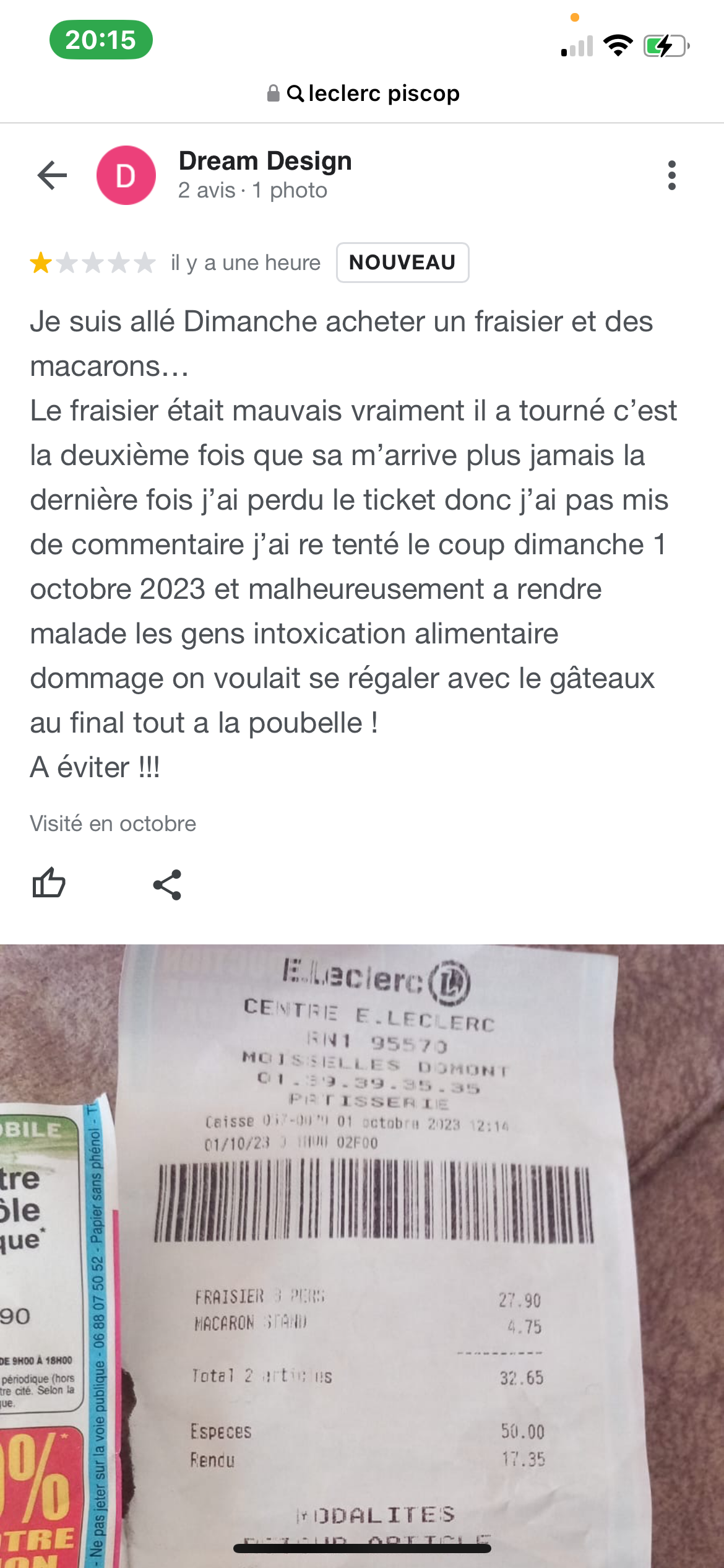 Alors, Je vais vous raconter l’histoire, je suis allée dimanche vers 12h acheté le gâteaux le fameux fraisier pour mes invités, j’habite à Eaubonne 20 minutes de chez vous, je rentre a la maison je mets le gâteau au frigo pour exactement le manger à 16h et la on coupe le gâteaux et la première bouchée aucun goût amers chantilly crème pâtissière et les fraises vraiment passé ! Vous dites que s’est fait Samedi vérifie vos frigos ! Et revenir dimanche après-midi vous êtes fermés ! Et Pour Mon Pseudo j’ai le droit de mettre ce que je veux ! D’ailleurs je vous invite à allez voir je suis architecte d’intérieur !